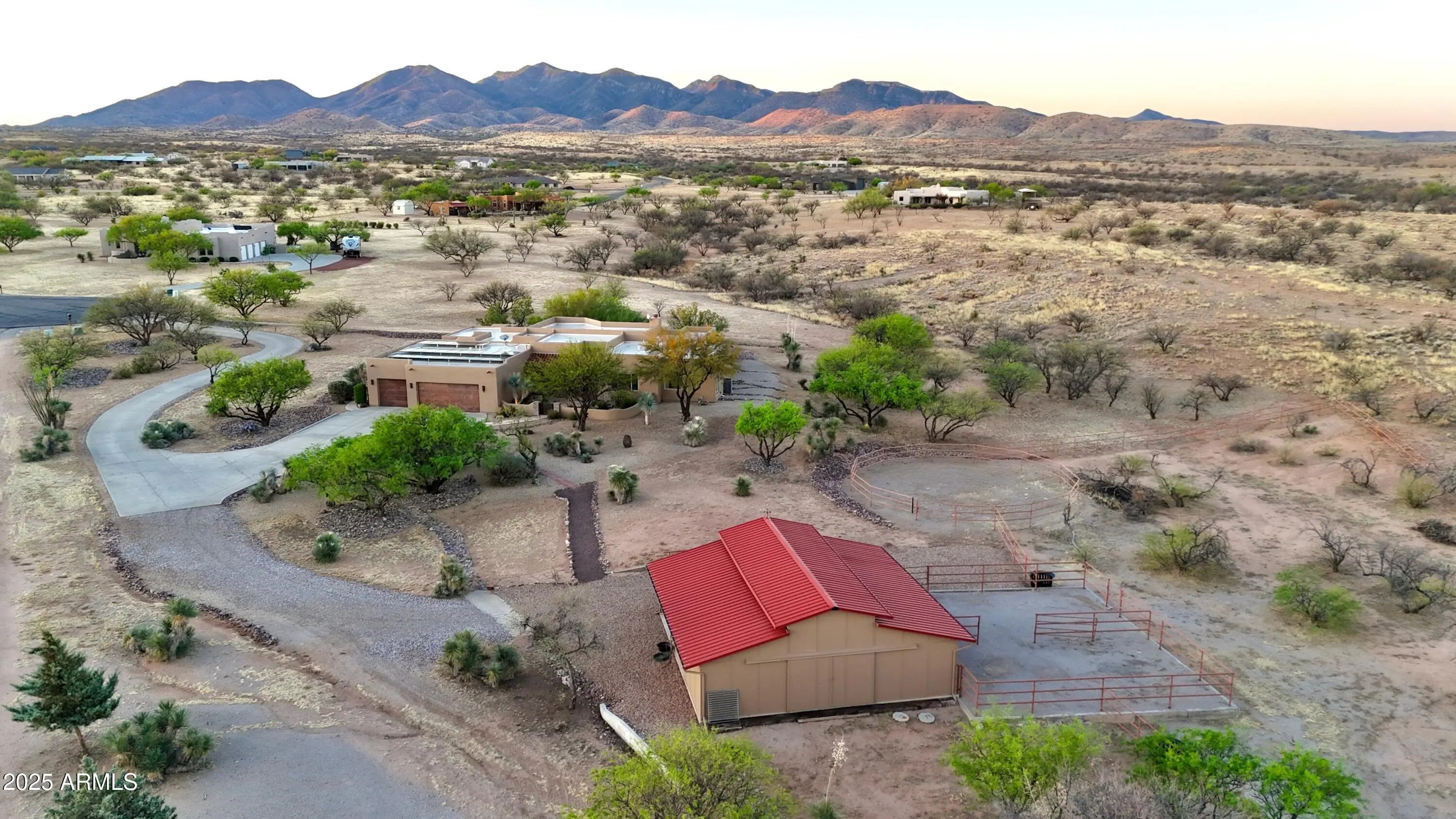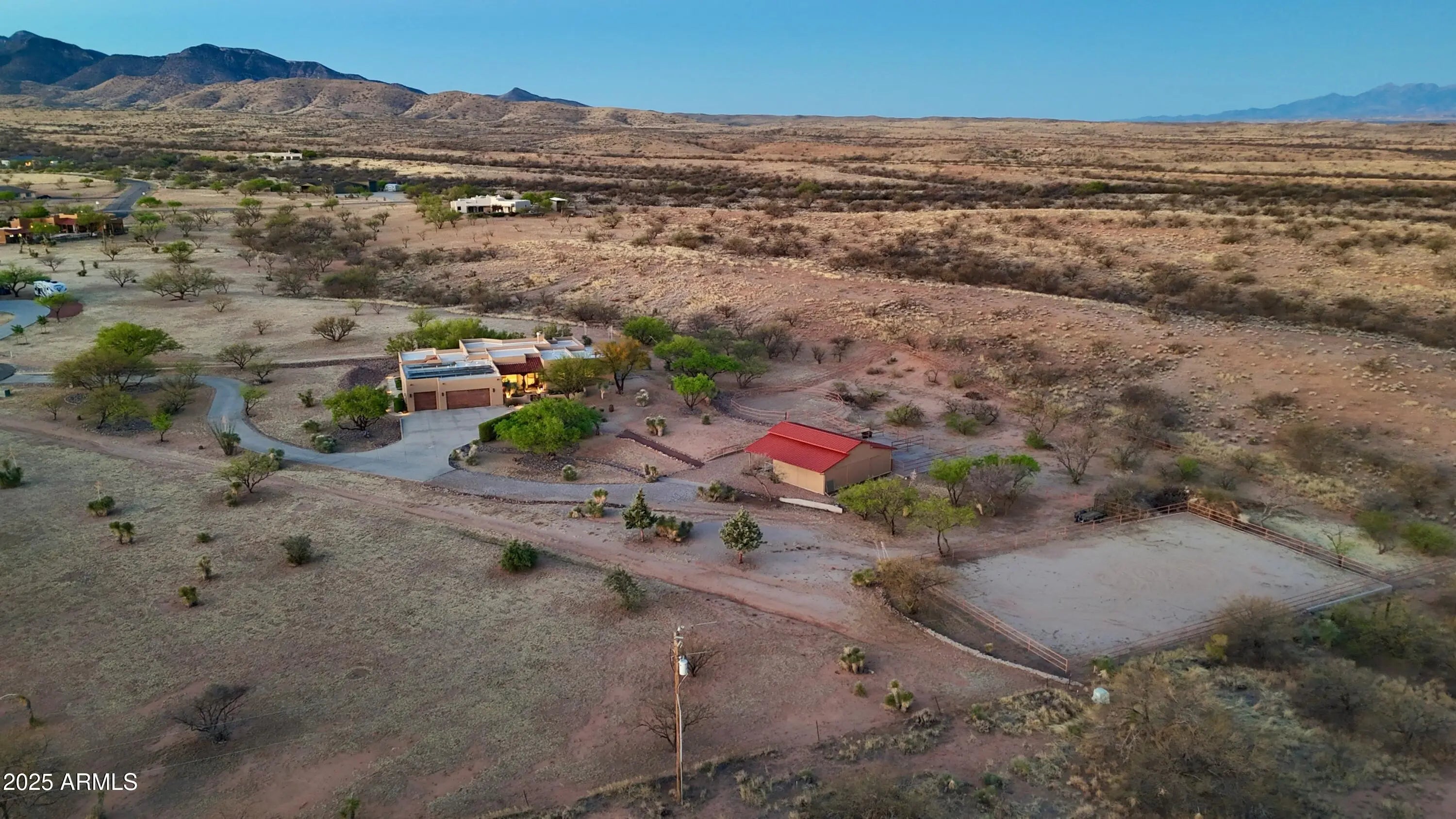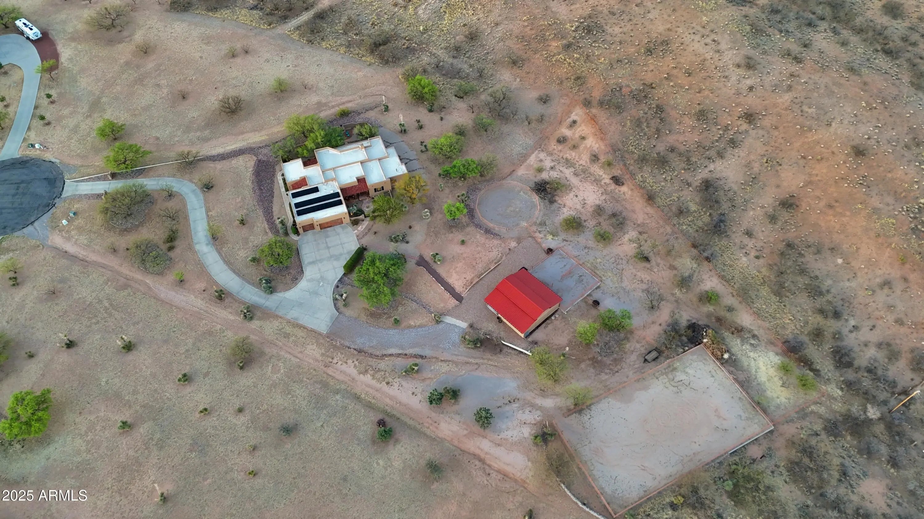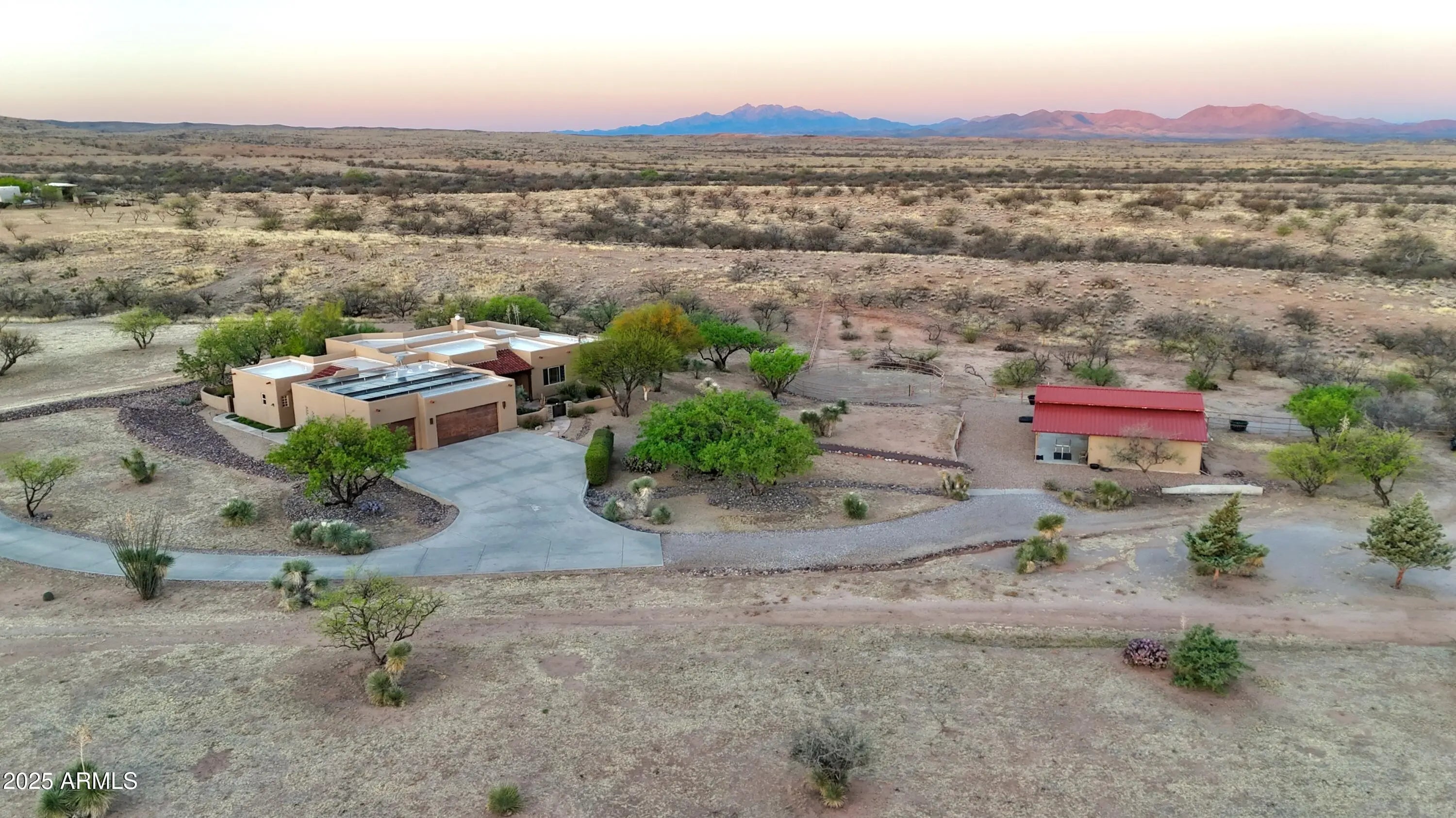 Your Dream Home in Red Hawk at JSix Ranch Awaits! Nestled at the end of a quiet cul-de-sac, this custom-built Southwest Contemporary retreat offers elegance, comfort, and plenty of space for both living and entertaining. Inside, you'll find 3 bedrooms, 4 bathrooms, plus a private guest casita (1 bed/1 bath) - perfect for visiting family or friends. High-end finishes flow throughout, including travertine flooring, granite countertops, alder cabinetry, and premium KitchenAid stainless steel appliances. The oversized primary suite is a true escape with a cozy sitting area, direct access to the patio, a large walk-in closet, and a spa-like bath featuring a luxurious walk-in shower and a deep jetted tub. Expansive windows along the back of the home flood the living spaces with natural light and showcase serene desert views. Practical touches include a three-car oversized garage (roomy enough for a large truck) and owned solar panels that dramatically reduce energy costs. Step outside to enjoy covered patios front and back, perfect for watching sunrises, sunsets, and the deer that wander by daily. For equestrian enthusiasts, the property features a well-designed barn with two stalls and automatic waterers, a wash rack, storage area, and a temperature-controlled tack room with hot water. Additional amenities include paddocks off the stalls, a round pen, a large turnout space, and a pipe-fenced arena - everything you need for your horses. Both the interior and exterior were freshly painted within the last two years, ensuring a move-in-ready experience. Bonus: An adjacent 3.46-acre parcel is also available with this property, offering even more room to expand.
