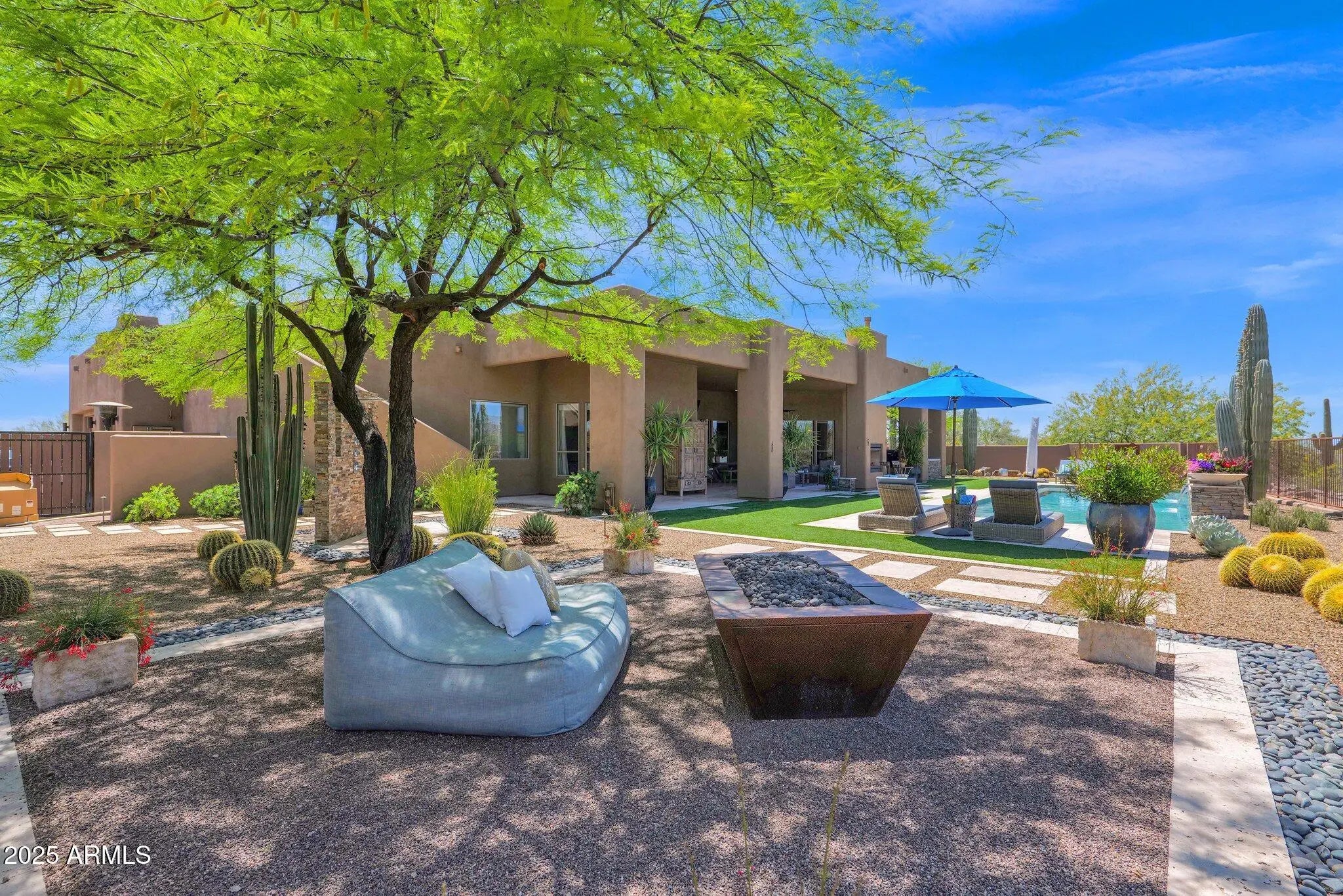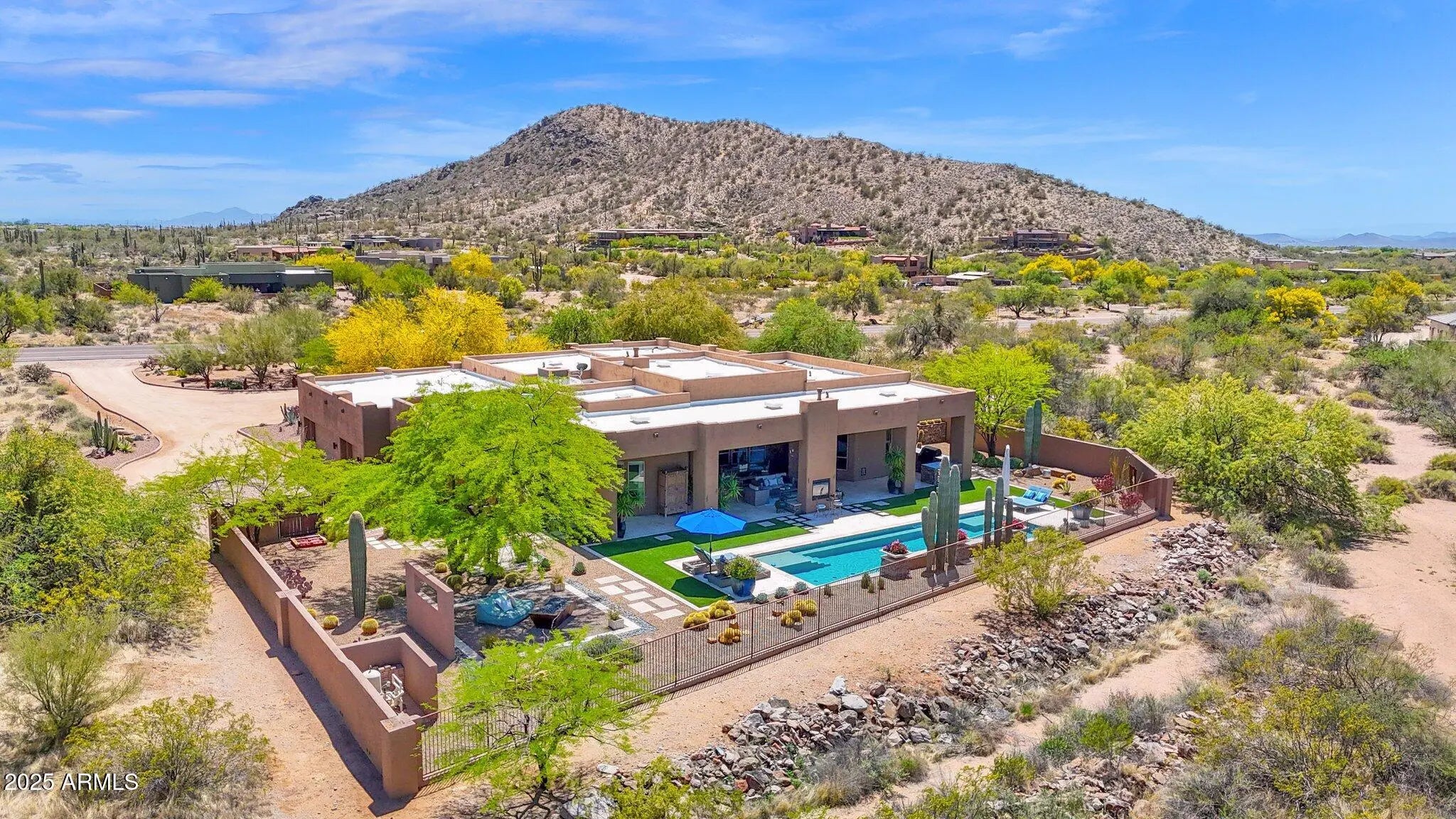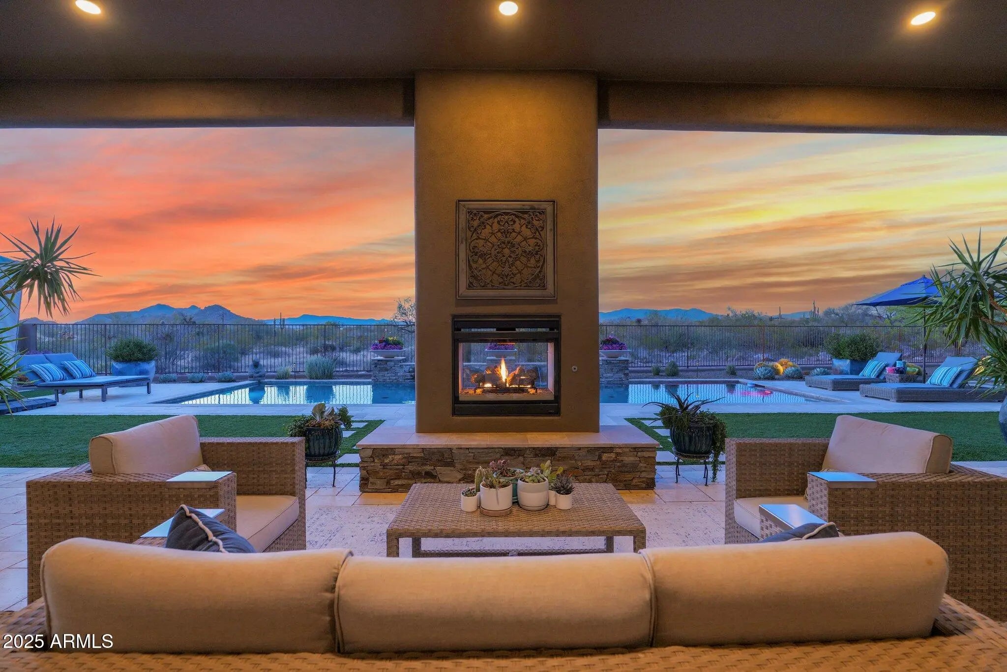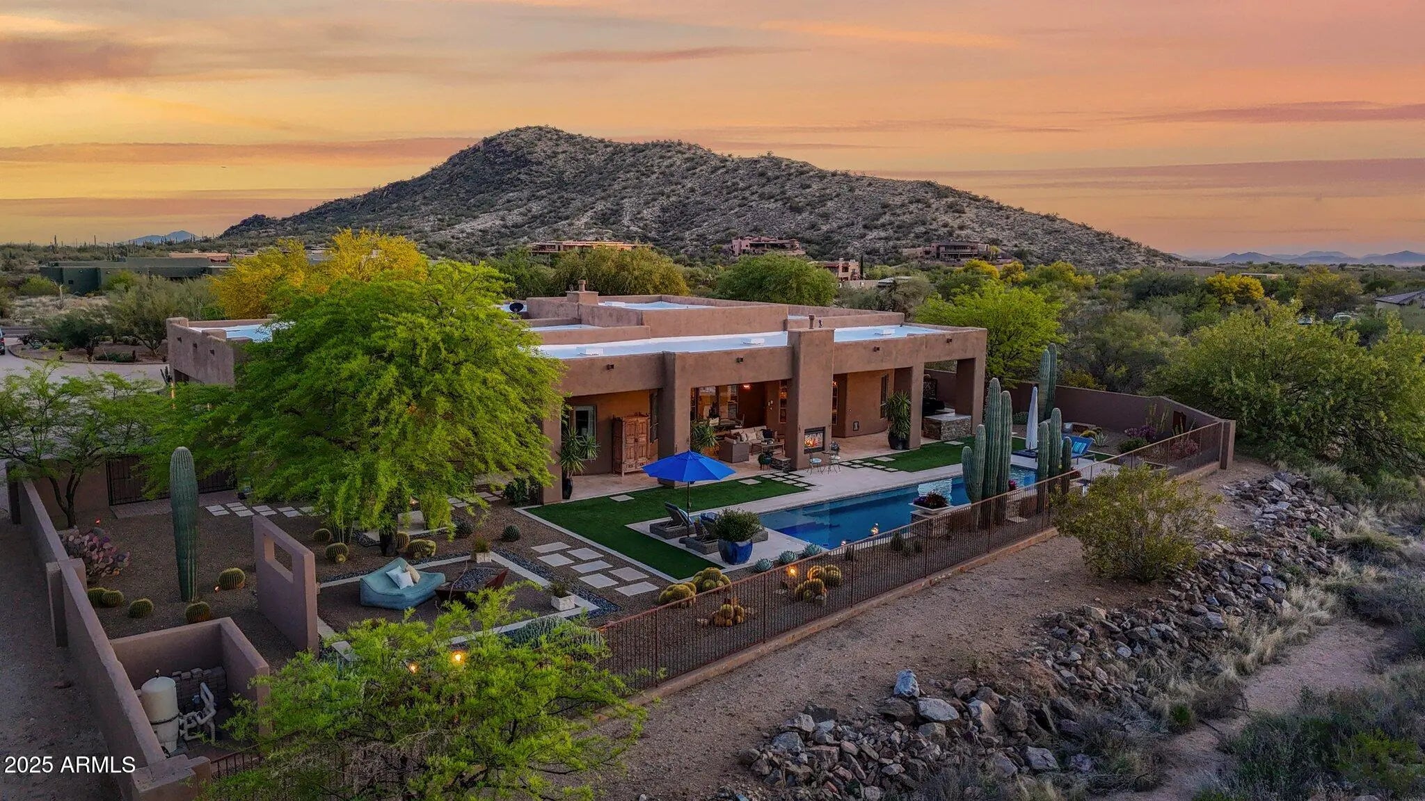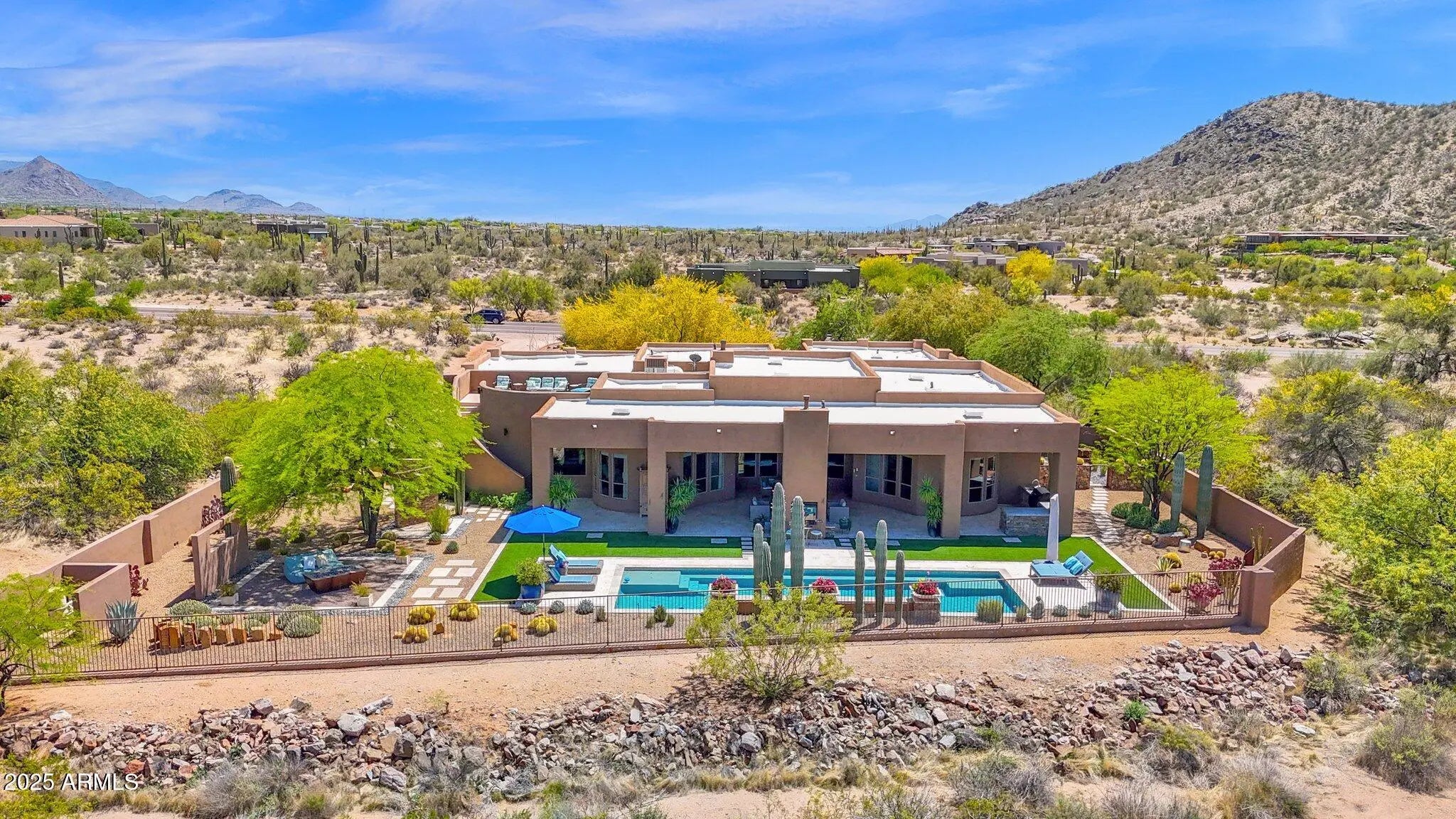 Twice celebrated in Phoenix Home & Garden Magazine, this 4,300 sq. ft. masterpiece on over two private acres in Pinnacle Peak Ranchos defines modern desert luxury. Inside, an airy great-room design frames panoramic 360° mountain views. The gourmet chef's kitchen is an entertainer's dream, anchored by a massive granite island and featuring soaring knotty alder cabinetry, a Sub-Zero refrigerator/freezer, and a Wolf gas cooktop. The owner's retreat provides a spa-like escape, while three oversized guest suites ensure comfort. The indoors seamlessly transition to an oasis curated by a Master of the Southwest. An expansive deep covered patio showcases a stunning 2-sided gas fireplace and an outdoor kitchen with a Wolf built-in grill, prep sink, and sleek concrete counter. Relax by the sparkling lap pool, gather at a separate fire feature sitting area, rinse off in the convenient outdoor shower, or ascend to the rooftop viewing deck for unforgettable sunsets. This sanctuary includes an extended, over-height 3-car garage and is perfectly located just 5 minutes from the Pima Dynamite Trailhead and surrounded by world-class golf at Troon North, Legend Trail, Estancia, and The Boulders.