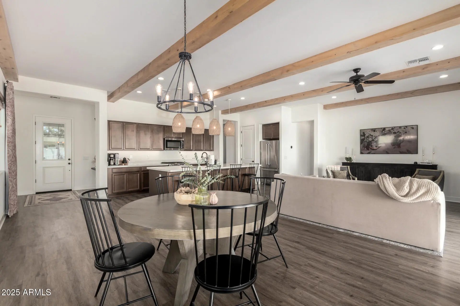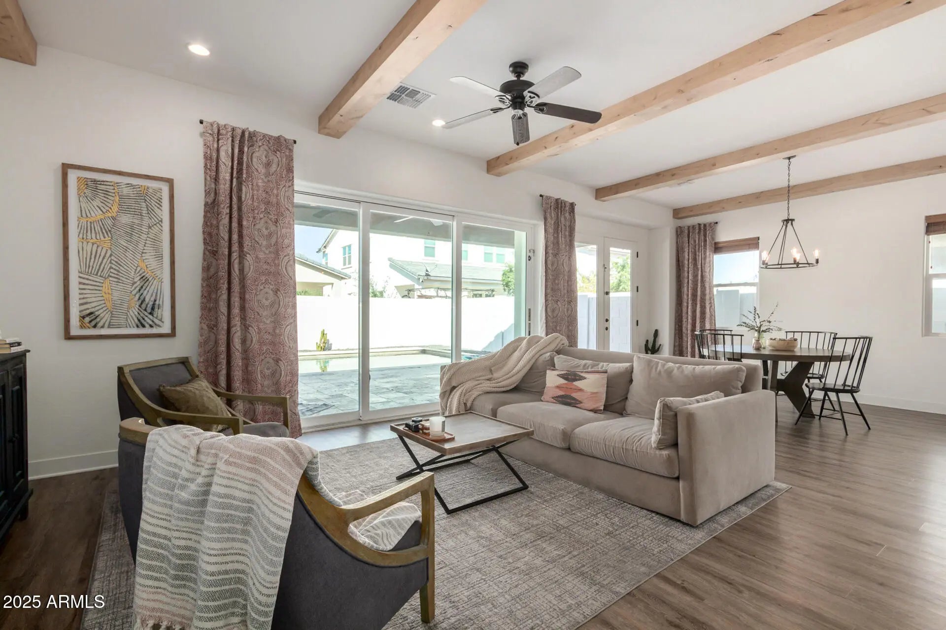 The BEST furnished rental in Queen Creek. This home has it all and is so nice you won't want to leave. Spacious 3 bed, 2 bath open concept Toll Brothers build complete with gourmet chefs kitchen featuring Kitchen Aid SS appliances, under cabinet lighting, quartz counters, and a built-in beverage fridge. Designer features include pendant lighting, custom drapes, wood beams, and a Samsung ''Frame'' tv. Step outside into a crisp and clean backyard with large covered patio and featuring a heated play pool complete with baja steps and effortless maintenance. Don't wait to snag this fantastic home away from home in a premier QC community.