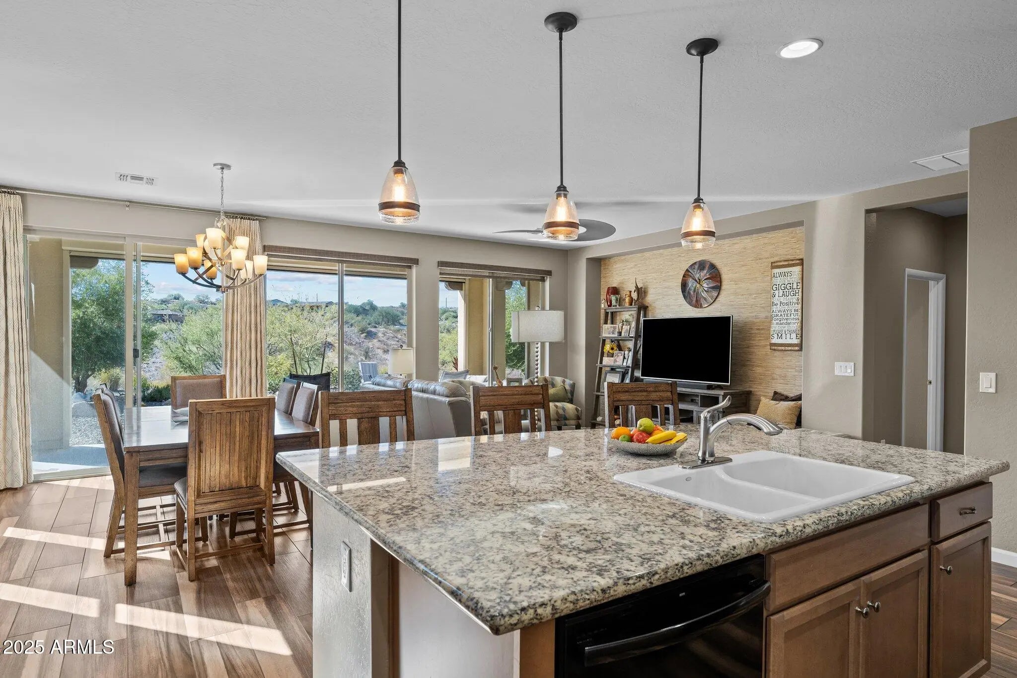 Located in the sought-after community of Wickenburg Ranch, this beautifully designed 2-bed, 2-bath home offers 1,549 square feet of comfortable, stylish living. The open floor plan features a spacious living area with a striking statement wall and abundant natural light from large windows. The kitchen is ideal for entertaining, complete with a generous island, modern finishes, and ample storage. Wood-look tile flows throughout the main living spaces, adding warmth and durability. Step outside to enjoy the large covered patio, perfect for relaxing or gathering around the firepit. Low-maintenance desert landscaping surrounds the home, making outdoor living effortless. A 2-car garage completes this move-in ready home in one of Arizona's premier lifestyle communities.