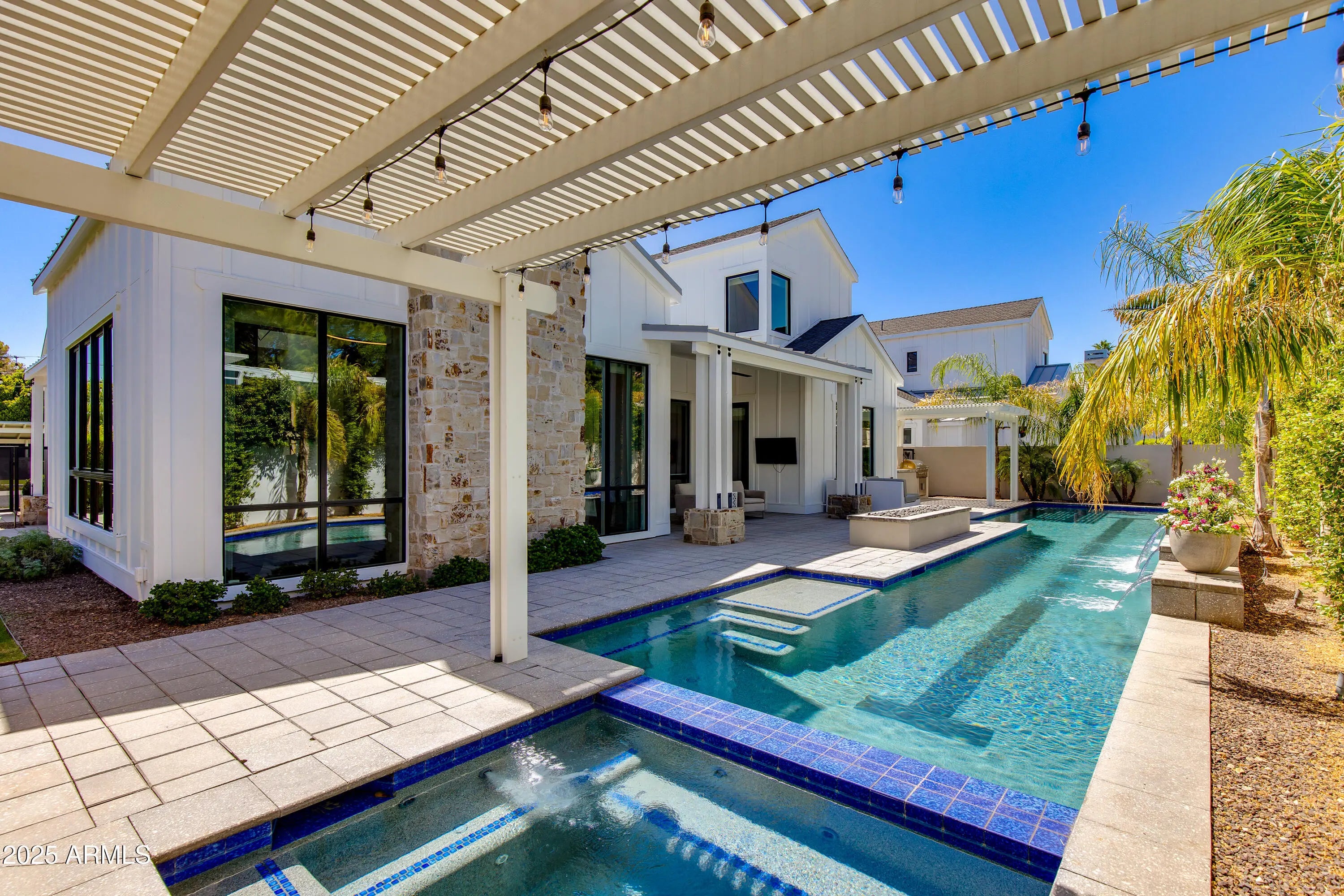 Stunning modern farmhouse on a premium-sized lot in the gated enclave of The Sycamore, one of Arcadia Lite's most desirable communities. Designed by Drewett Works, this home delivers high-end living with every luxury upgrade imaginable. Step inside to discover a refined open layout enhanced by soaring ceilings, Savona Villagio engineered European oak wood flooring, upgraded wall treatments, and floor-to-ceiling stone fireplace accented by dramatic iron trusses. The home is fully outfitted with a Control4 smart home system for seamless control of lighting, shades, HVAC, sound, and interior/exterior security cameras. The kitchen is a true statement of form and function, featuring a full suite of top-tier Sub-Zero and Wolf appliances. Upgraded cabinetry, countertops, and a sleek wet bar with custom finishes make entertaining effortless. This home features a sound-insulated exercise room with reinforced floors and dedicated A/C plus a steel-lined safe room with a high-security door, full data, sink, and electrical access for ultimate peace of mind. Retreat to your tranquil backyard featuring a 60-foot heated lap pool, salt water spa, firepit and built-in BBQ. The 3-car garage is fully finished with epoxy floors, custom cabinets, and two 220V 50-amp EV charging outlets. Enjoy Camelback Mountain views from the upstairs balcony and being minutes from Arcadia's best dining, shopping and activities.