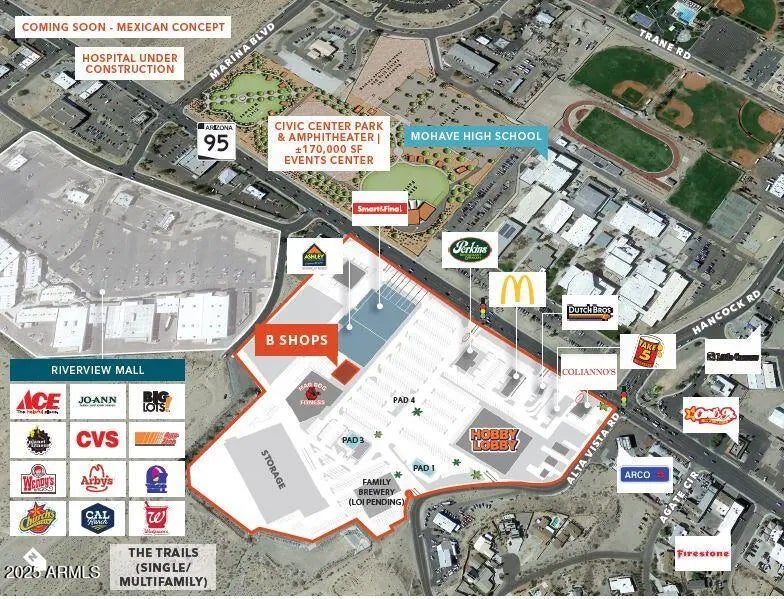 City Square is an ideally located, high-profile mixed-use retail center located in the heart of Bullhead City, AZ across the river from its sister city Laughlin, NV. Featuring massive pylon signage and anchored by Hobby Lobby, Ashley Furniture, McDonalds, Dutch Bro's and numerous other quality retail/restaurant amenities, City Square currently offers the availability of retail shops for lease as well as PAD sites for sale.