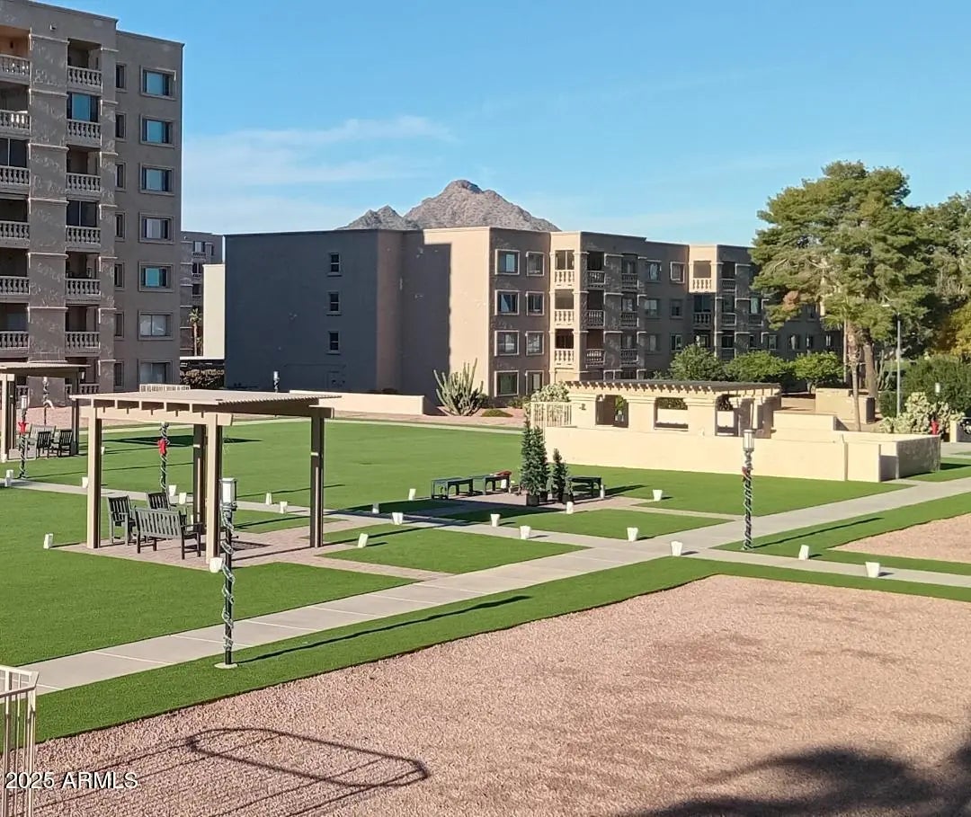 Great value for 85251 zip code! Located in a newer most updated building, this extra large, move-in ready, well-maintained corner unit is ideal as a primary or seasonal residence. Unit tastefully updated, with kitchen featuring backsplash, granite countertops, soft close drawers, Lazy Susan, recessed lighting. Brand new toilet and updated bathroom/kitchen fixtures. Newer AC unit and balcony dual-pane glass sliding door. Both bedroom windows have dual-pane windows+wooden plantation shutters. Huge walk-in closet w organizers on both sides. Large balcony has tiled flooring w a view of top of Camelback mountain & a beautiful courtyard. Walk-in closet & balcony can be easily converted into a den. Unit has in-unit laundry hook-ups. Common laundry facility also available on the same floor! AC included in HOA fees! Private+shared storage unit! Garage spot close to lobby entrance. 24 hr manned security. Complex offers resort style amenities including a free golf course, 3 heated pools (one enclosed in winter), hot tubs/spas, BBQ grills, 2 tennis courts, sauna/gym, game room, new library, business center, wood workshop, art/craft studios etc. Its located at a fantastic central location, steps away from old town Scottsdale entertainment, shopping, restaurants, parks, walking trails, Scottsdale baseball stadium, library, medical facilities and many more.