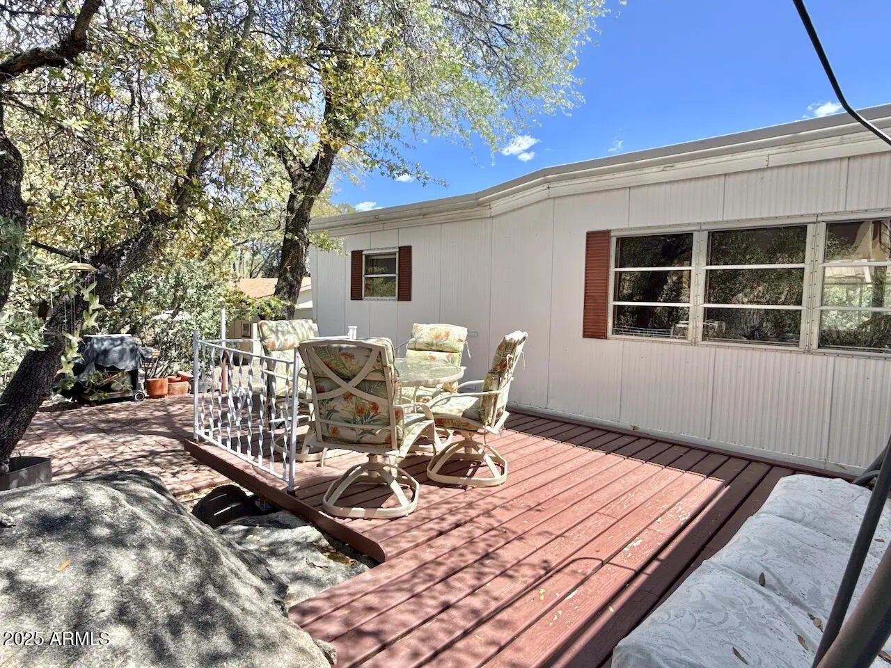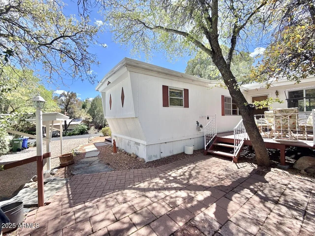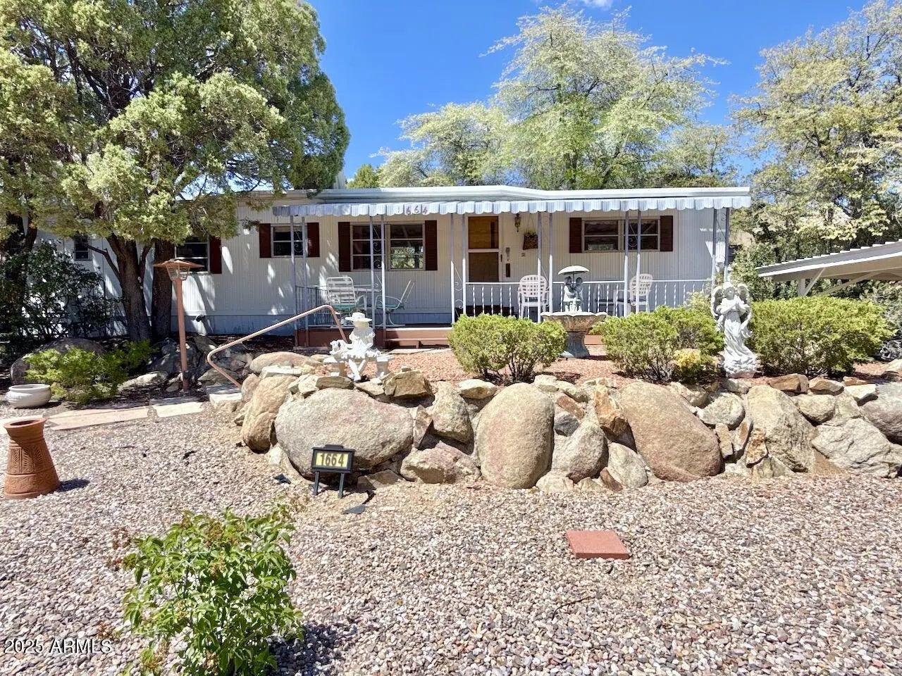 Fantastic covered front porch and private rear deck and patio in a quiet 55+ community. Surrounded by boulder outcroppings, shaded by trees, gravel drive, well maintained, clean and ready move-in condition. Larger parcel, owned lot, 3 parking (one covered); split plan with no interior steps; two generous living areas, updated kitchen cabinets and countertop. Updated cabinets in full guest bathroom located near bedroom. Guest bedroom includes a convenient murphy bed. Primary bedroom includes a built-in closet with drawers, counter with vanity sink and separate toilet and shower. Enjoy a quiet community close to downtown, restaurants, hospital and shopping.