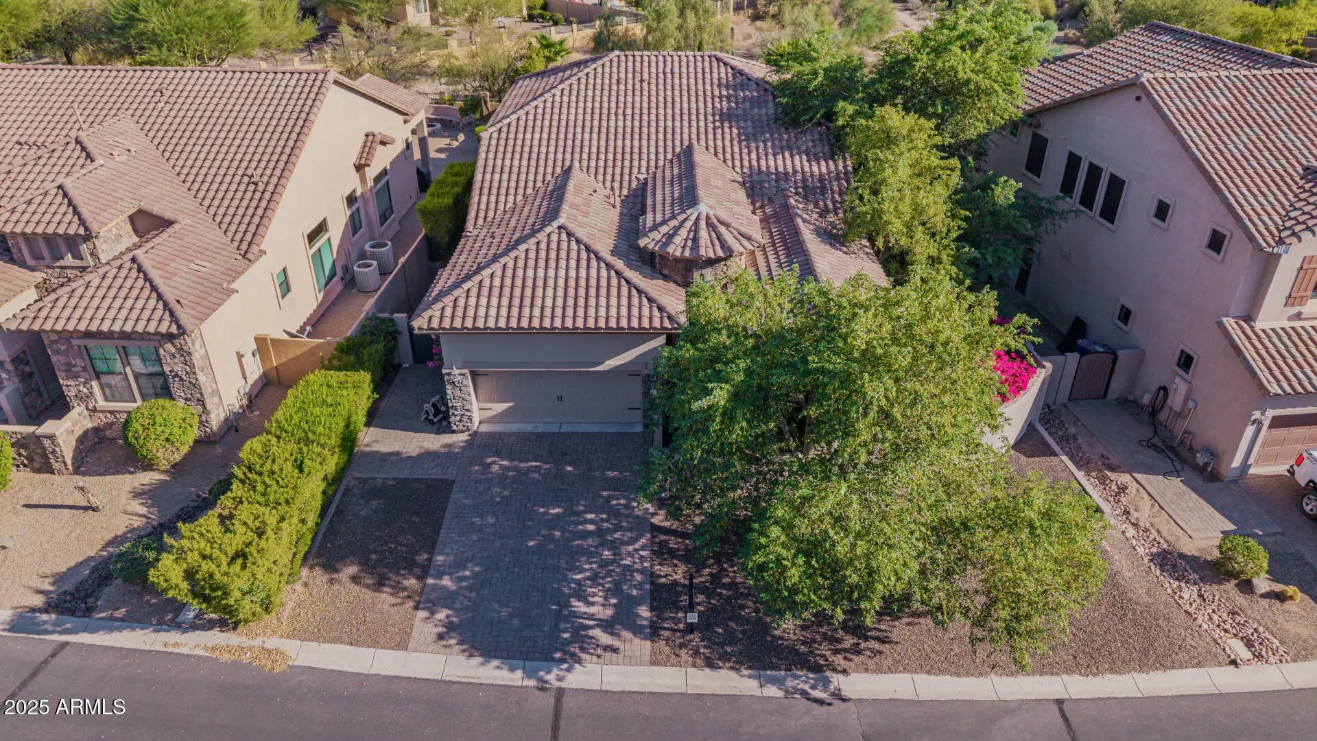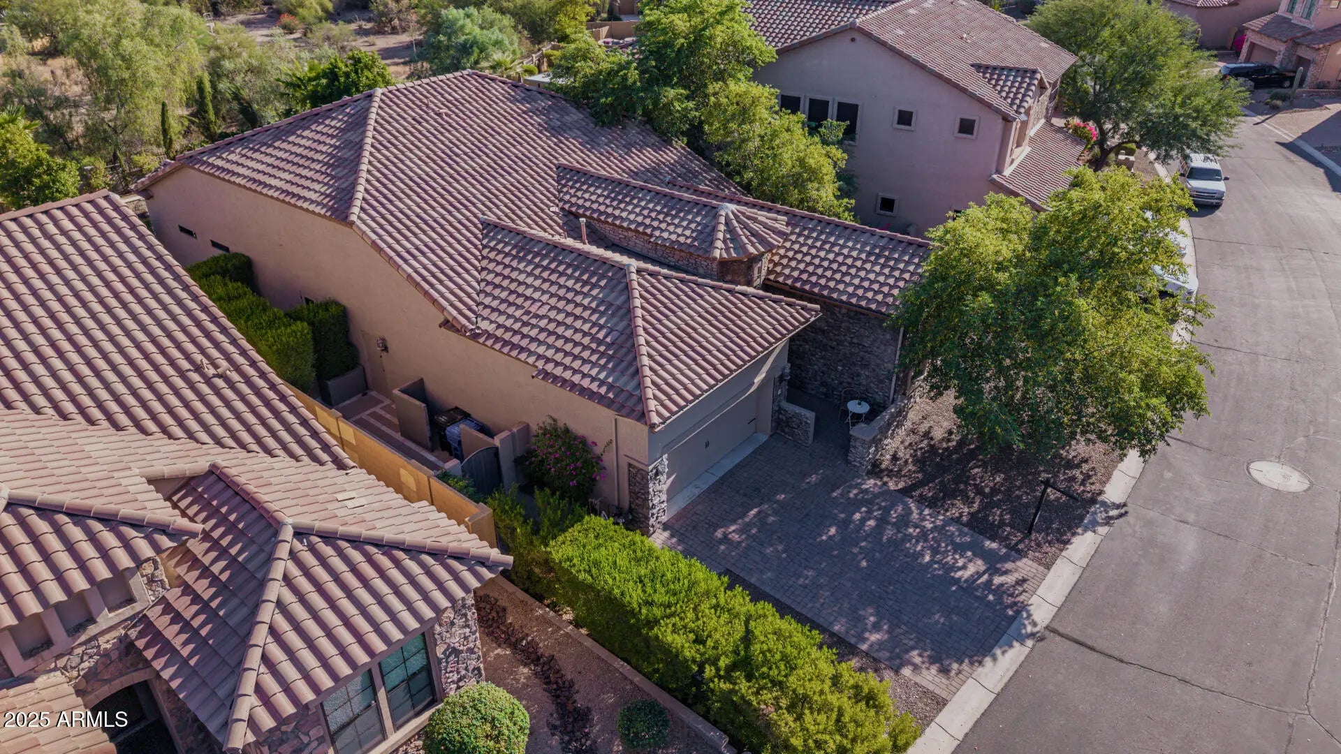 Nestled in the scenic Desert Uplands of Northeast Mesa, this exquisite Tuscan-contemporary residence is a rare gem set on a premium lot in one of the East Valley's most sought-after communities. Designed for both elegance and comfort, the home features 12-foot ceilings throughout, creating an airy, expansive ambiance that complements its sophisticated style and modern upgrades. From the moment you arrive, the striking curb appeal draws you in—highlighted by a custom entry door that sets the tone for the refined finishes inside. Step into an open-concept floor plan adorned with tile flooring, plantation shutters, designer paint, Venetian plaster, and detailed custom ceilings that elevate every room. The spacious family room seamlessly flows into a formal dining space and a chef-inspired kitchen equipped with quartz countertops, a generous prep island, walk-in pantry, and premium GE appliances. Oversized glass doors showcase unobstructed views of the backyard and sparkling pool, creating the perfect setting for indoor-outdoor entertaining. Work from home in style in the private office enclosed by double doors. Retreat to the luxurious owner's suite, featuring a large walk-in closet and a spa-like en suite bath complete with dual vanities and an oversized walk-in shower. Two additional guest suites each offer direct backyard access through French doors and are paired with full bathrooms, ensuring comfort and privacy for family and visitors alike. Your personal backyard oasis awaitsfeaturing an extended covered patio, travertine pavers, lush professional landscaping, and a heated saltwater pool and spa with five elegant water features. Whether you're hosting guests or enjoying a quiet evening, this outdoor retreat offers year-round resort-style living. Residents of Mountain Bridge enjoy access to top-tier amenities including a private Owner's Club with a fitness center, clubhouse, heated pool and spa, tennis and pickleball courts, playgrounds, putting greens, and scenic hiking and biking trails. All just 25 minutes from Sky Harbor Airport and moments from premier golf courses, lakes, and Tonto National Forest.