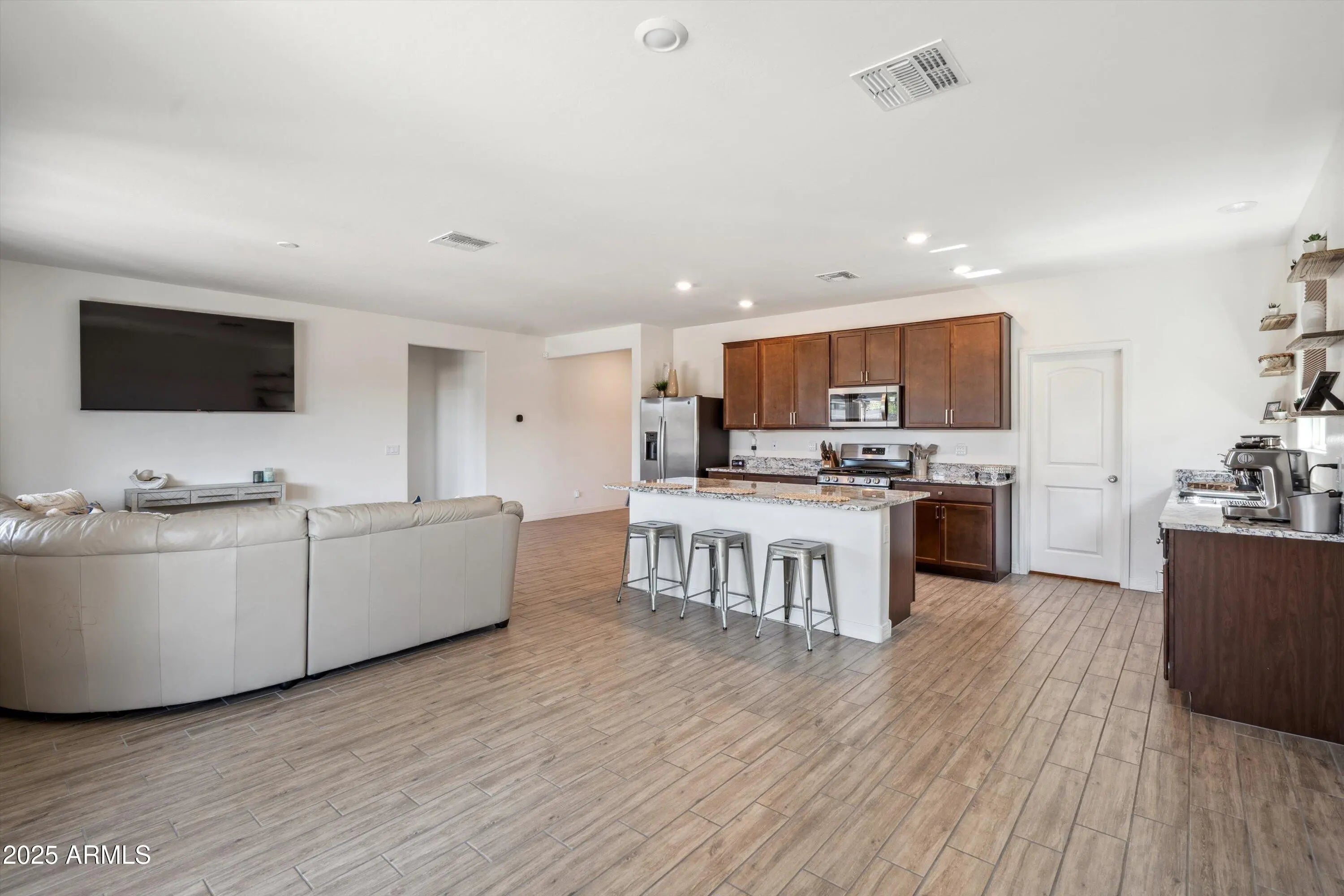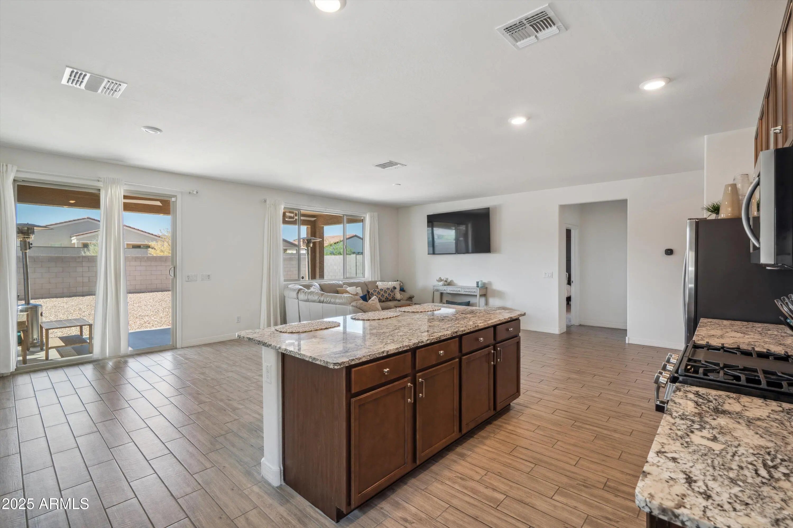 Welcome to this beautifully designed 4-bedroom, 2-bath home offering the perfect blend of comfort, style, & functionality. 9-foot ceilings & a huge foyer, this home greets you with an open & airy ambiance from the moment you walk in. Split floor plan offers privacy & flexibility, w/wood-look tile flooring throughout the main living areas & plush carpet in the bedrooms. Open concept layout connects the living, dining, & kitchen areas. At the heart of the home is a chef's dream kitchen featuring granite countertops, a center island, walk-in pantry, and sleek finishes throughout. Both bathrooms boast dual vanities & master suite includes a spacious walk-in closet, upgraded super shower. Extended patio & zero-scape backyard. 2-car garage & all appliances included.