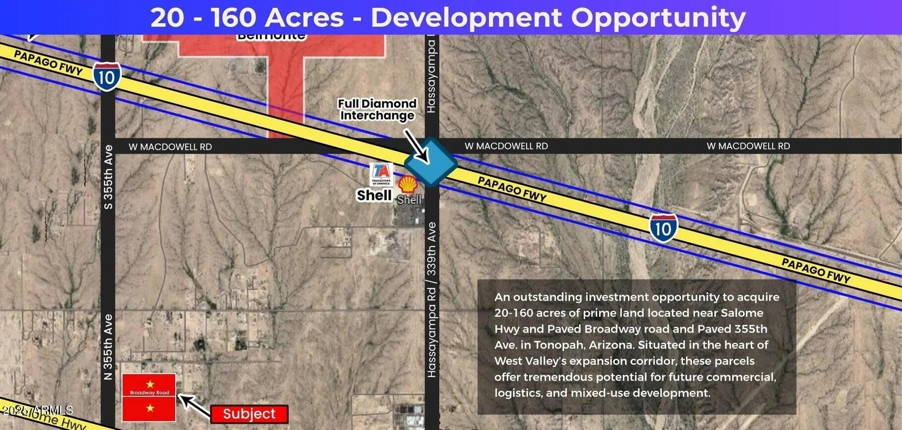 Location Advantages; Corner lot on paved Broadway and paved 355th ave. - potential commercial Located near major infrastructure corridors including 1-10. Salome Hwy and the future 1-11 Highway. Just west of fastest growing Buckeye city Strong potential for commercial traffic given future highway expansion and regional connectivity. Surrounding Development: Close proximity to the proposed $900 Million Desert Movie Studio Project. Part of the greater West Valley expansion area, fueled by Bill Gates; Smart City (Belmont) initiatives. Growth driven by new industrial, logistics, and residential developments proposals. Desert Whisper Master Plan: 960.7 acres. Investment Potential: Current R-43 zoning with strong commercial rezoning potential. Pricing positioned competitively for investors and developers. Excellent long-term appreciation expected as 1-11 and West Valley projects mature.