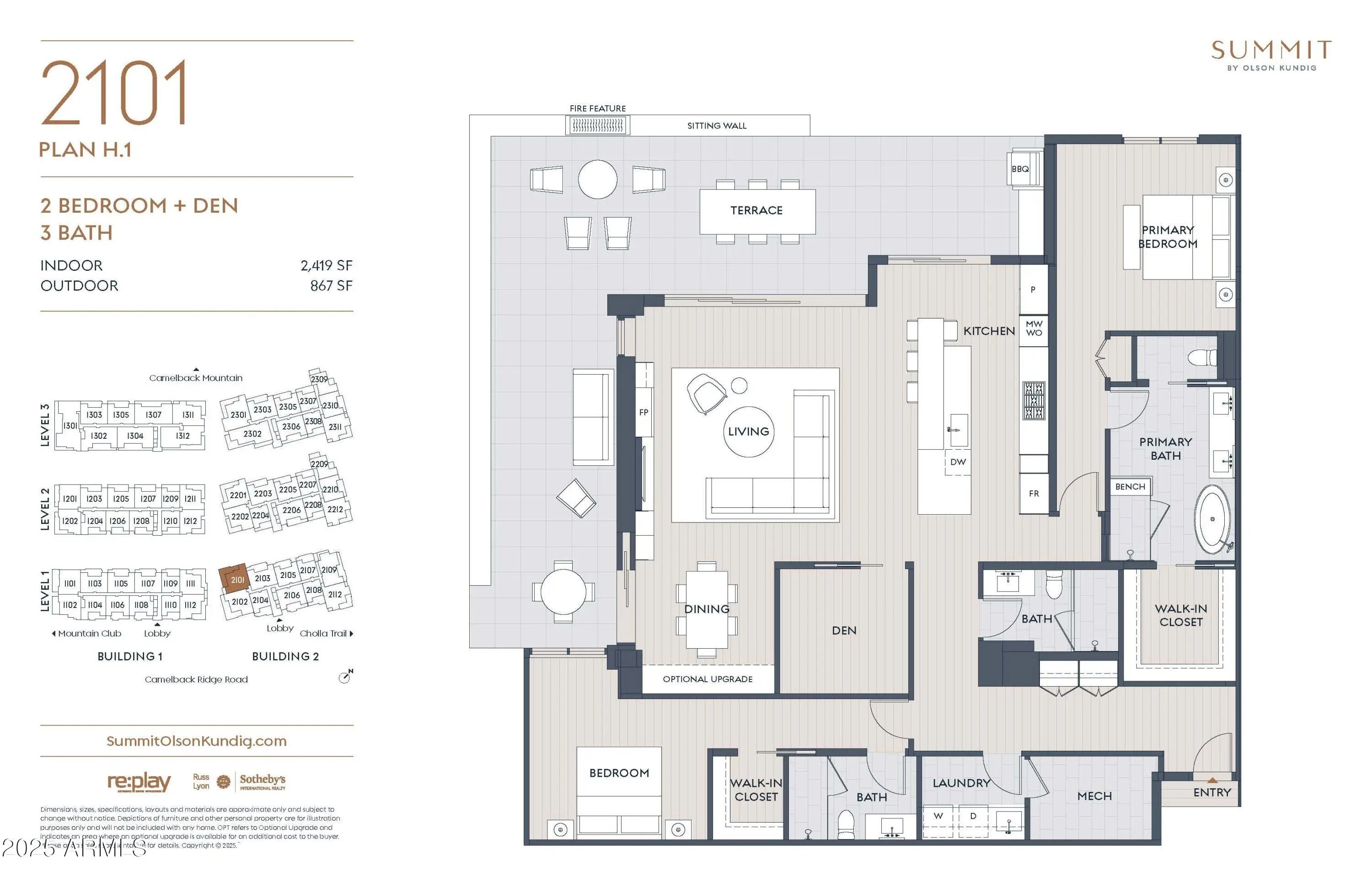 Residence 2101 is a 2-bedroom + den, 3-bath residence offering 2,419 sq ft indoors and an expansive 867 sq ft terrace with sweeping views of Camelback Mountain. The chef's kitchen, spa-like baths, and seamless indoor-outdoor living make this a true architectural retreat.