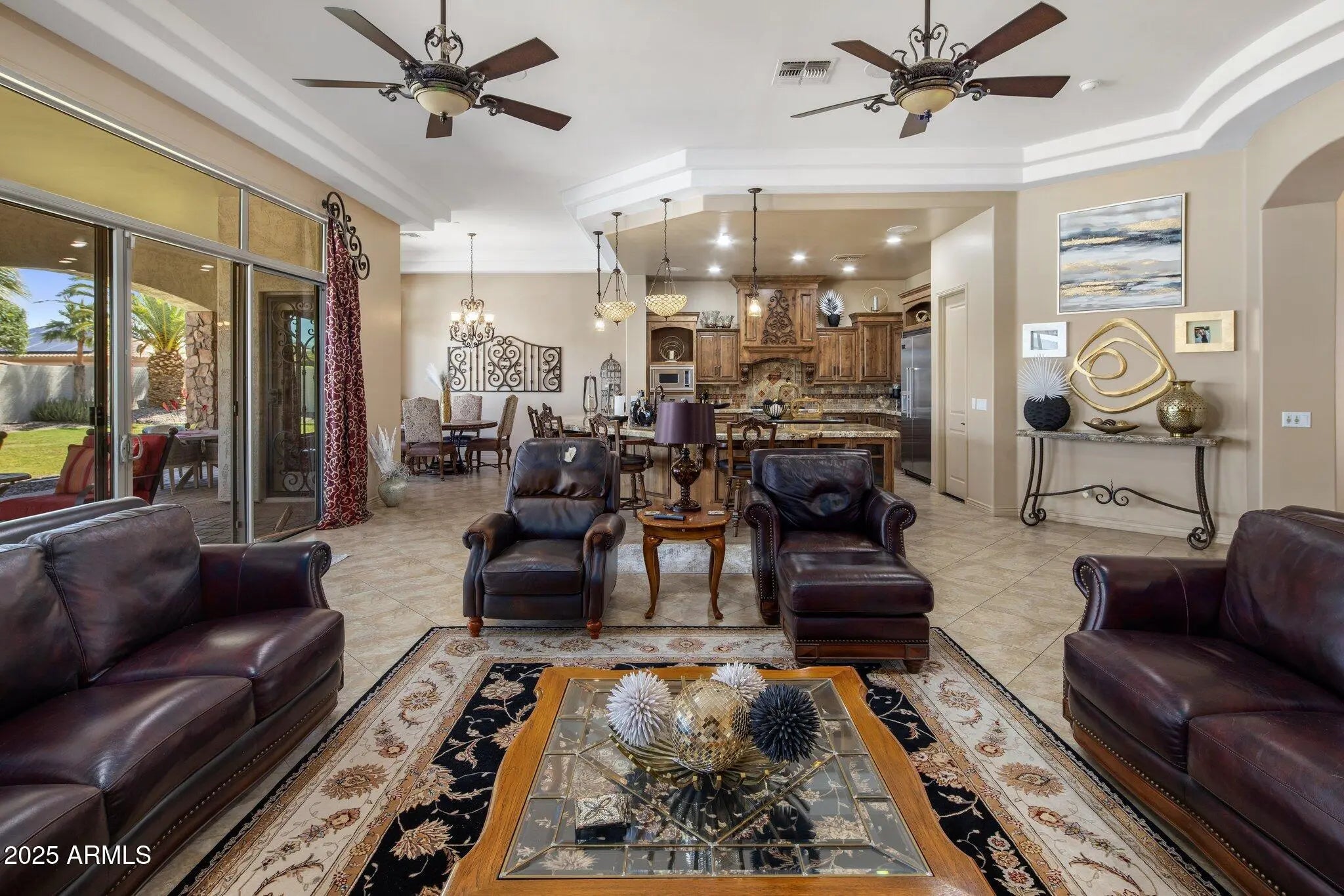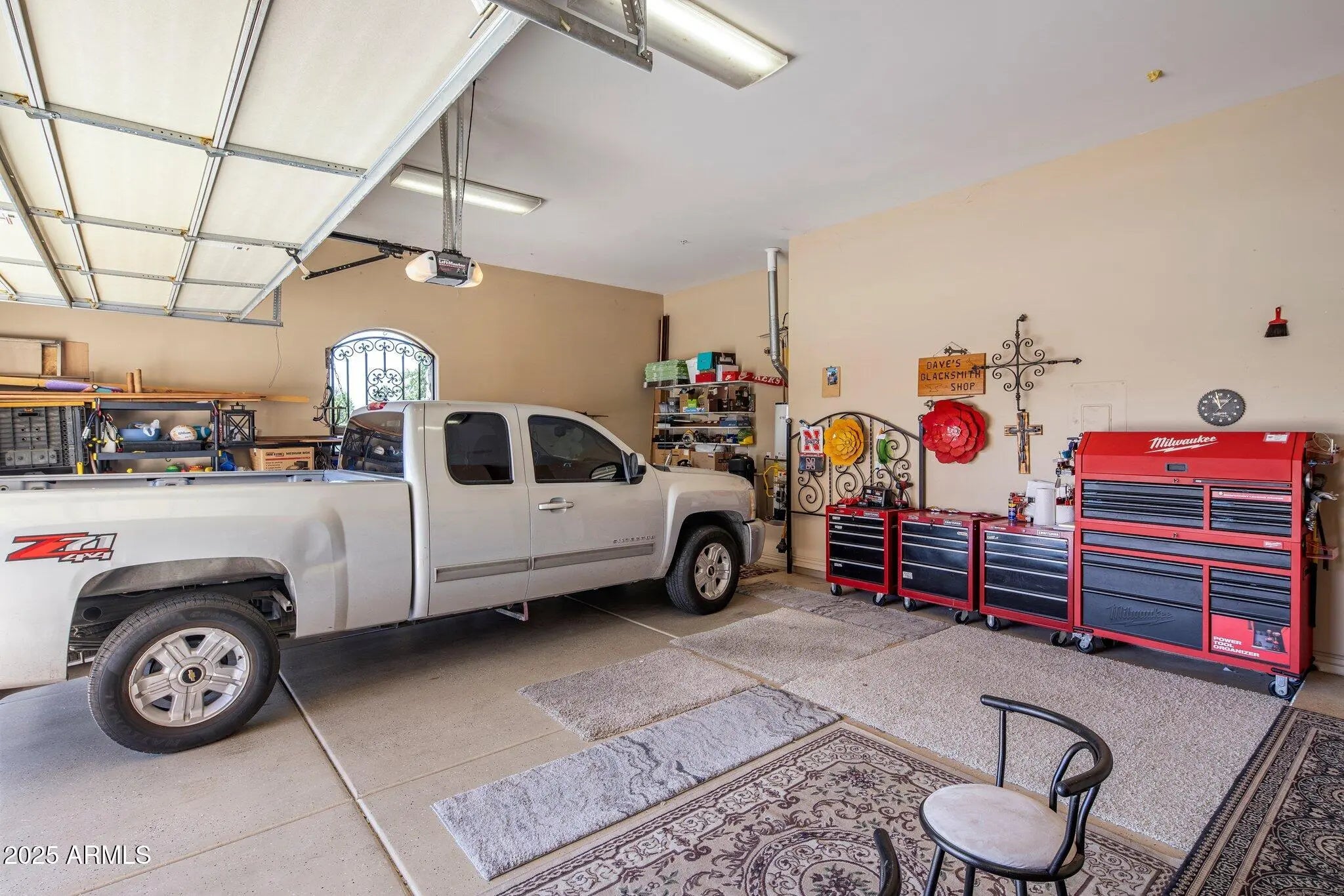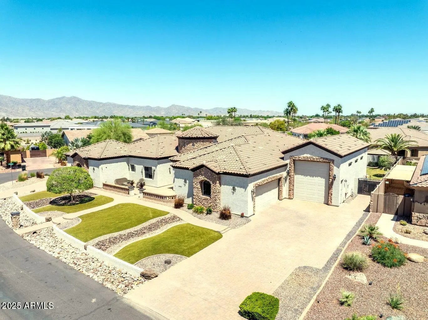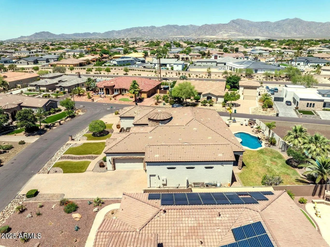 Car Lover's Dream Home Move-In Ready. This elegant, gated Russell Ranch home offers the best of Arizona living with two oversized double garages and a spacious RV garage with extensive shop space, room for 8 cars or more! All fully furnished if you wish. Located on a corner lot with a South facing lot and mountain views. This four bedroom, 3 ½ bath home features a gourmet kitchen with granite countertops and a massive granite kitchen island, all Viking fixtures, commercial level extraction and a pot filler. The open floor plan includes a wet bar, a breakfast nook, a family area around the open-hearth fireplace and a walk in pantry. The sweeping glass wall and sliding doors lead to the wide covered patio and the sparkling pool with a waterfall feature, a gas barbeque island and outdoor entertaining area. The spacious master bedroom has pool access, a walk in master closet, and a bathroom featuring a jetted spa bath, a drive through shower, double vanities with marble countertops. Three additional bedrooms are split from the master. Added rooms include a formal dining room, an office or media room, and a laundry room with washer and dryer. The owner is a talented blacksmith artist whose extensive decorative wrought iron work complements the gleaming tile floors and graceful artwork throughout this stunning home. Recent upgrades this year includes all freshly painted, all new Trane AC units, refurbished lot irrigation, new pool motor.