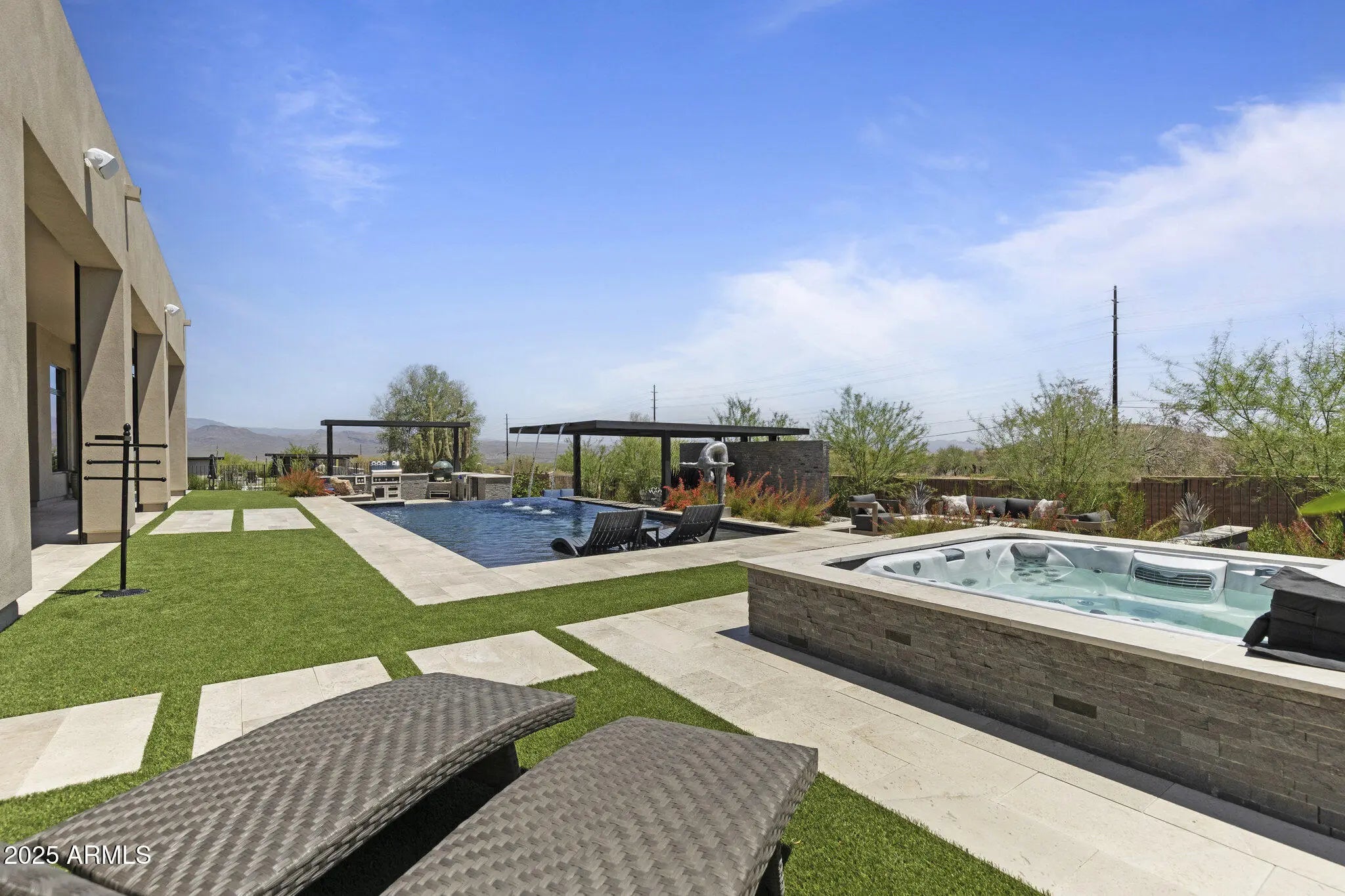 Stunning Toll Brothers home in the gated Trilogy community, thoughtfully upgraded throughout. This 4-bed, 4.5-bath entertainer's dream home seamlessly connects indoor and outdoor living areas. Chef's gourmet kitchen with waterfall island, Control4 smart home system, Sonos speakers, and Hunter Douglas electric shades. Owners added travertine around the pool, a hot tub, upgraded grill station with Hestan appliances, Green Egg, five motorized patio shades, epoxy garage floor, RO and soft water systems. Professionally painted interior, three fruit trees, and pre-piped for future pool chiller. Enjoy breathtaking views and proximity to Verde River Golf & Social Club—memberships available for golf, dining, and social events. Desert living at its absolute finest.
