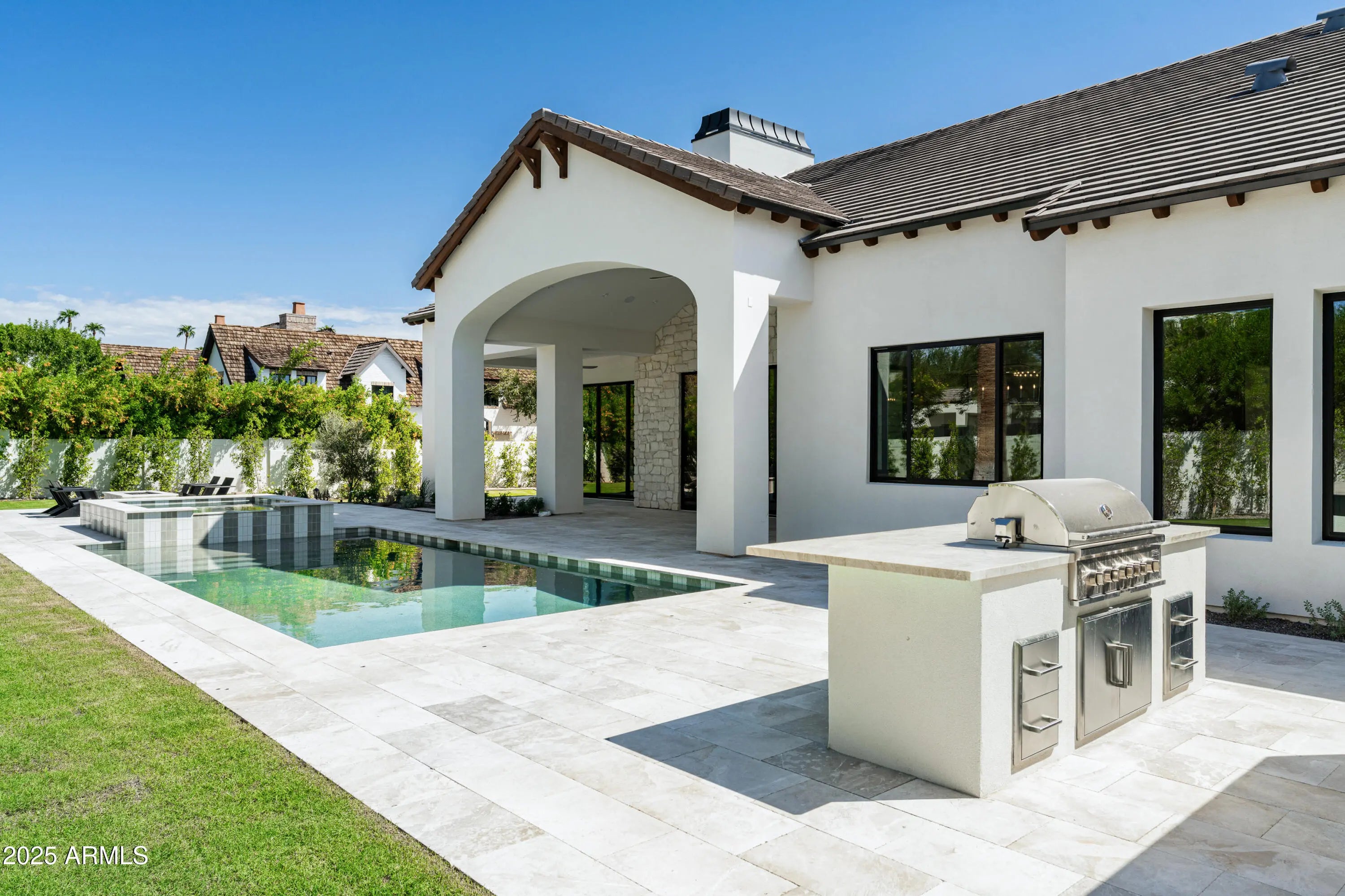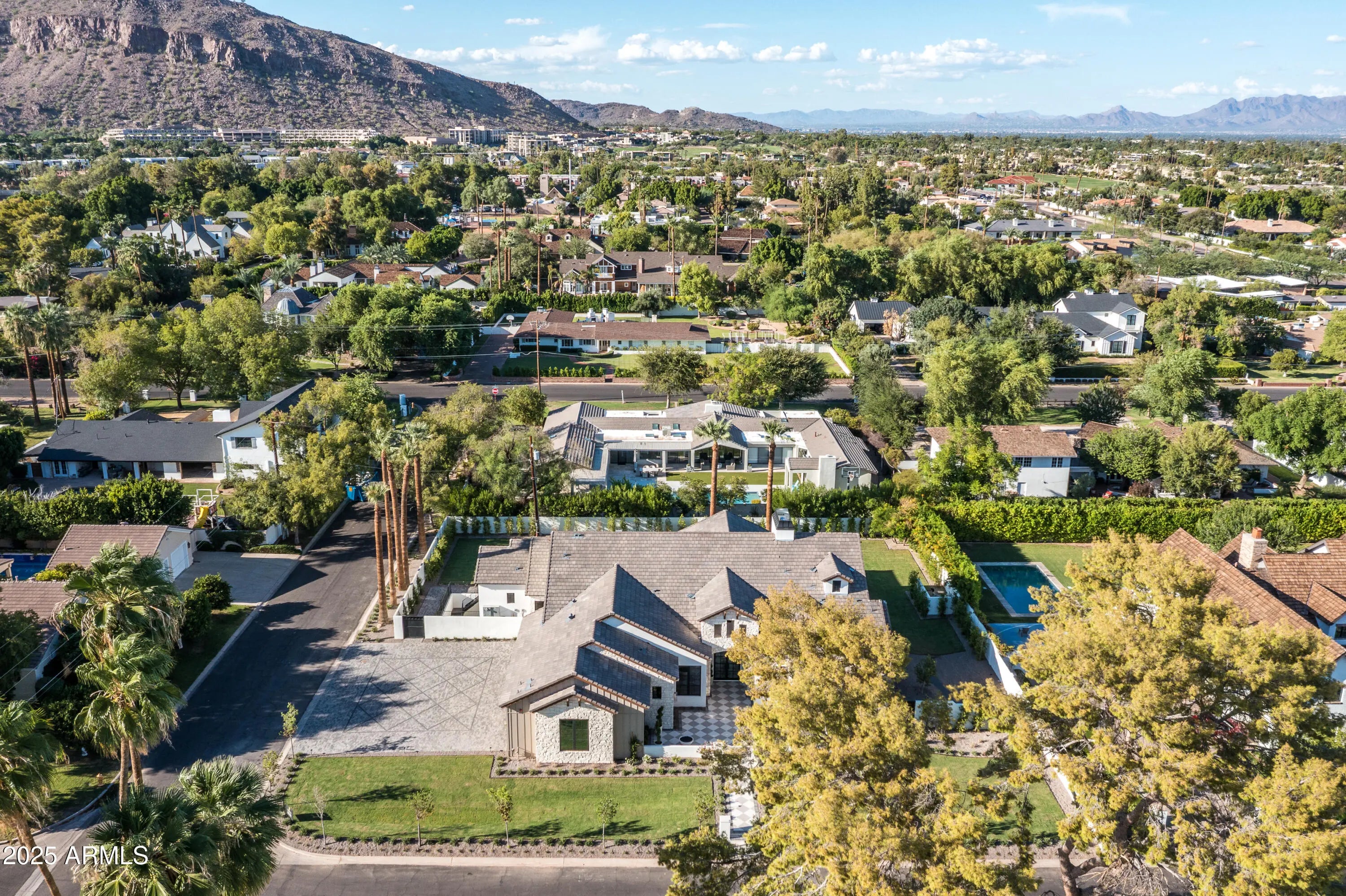Located in the prestigious Arcadia Proper neighborhood, this exceptional new build by Travis Custom Homes sits on a spacious half acre lot just blocks from the infamous Phoenician Resort. Offering 5,673 sq ft of meticulously designed living space, this timeless estate features 5 bedrooms, 5.5 bathrooms, plus an oversized 4-car garage, blending luxury and functionality throughout. The main level spans 4,332 sq ft, showcasing open-concept living with a dedicated office, a versatile den/teen lounge, and a gourmet kitchen that seamlessly connects to expansive living and dining areas—ideal for modern living and entertaining. The finished basement adds 1,341 sq ft and includes a large game / bonus room, a flex room ideal for an additional guest suite bedroom or home gym, powder room, and a walk-out patio with stairwell leading to a well manicured resort style backyard thoughtfully designed for year-round enjoyment. The sparkling pool + spa, built-in BBQ with bar seating, outdoor fireplace, and room for an optional sport court make it so you will never want to leave home. Crafted with exceptional attention to detail, this estate embodies the signature quality, elegance, and livability that define Travis Custom Homes. This is an extraordinary opportunity to live in one of Arcadia's most coveted communities.