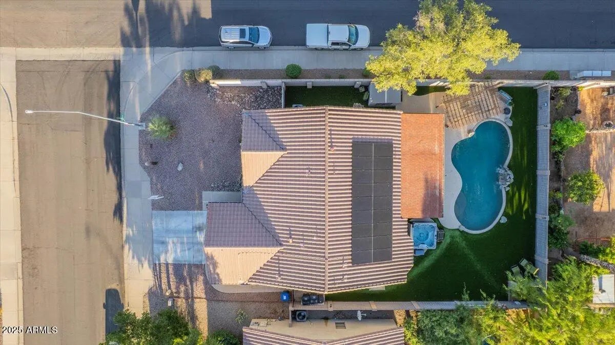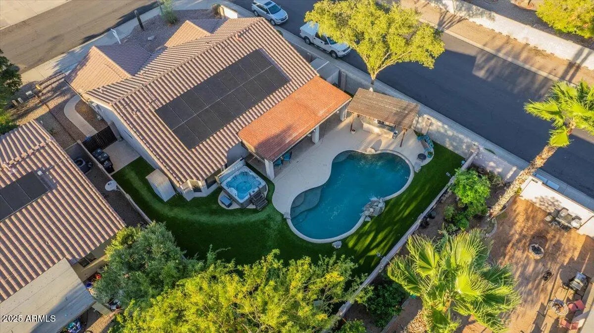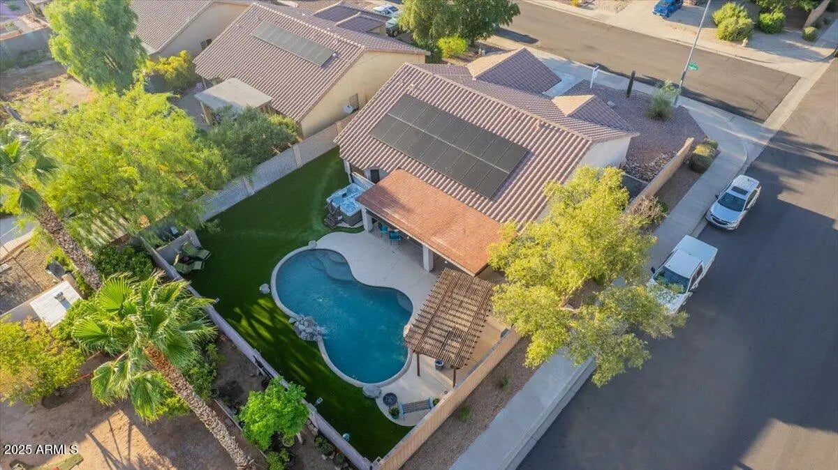 Resort-style living with efficiency built in! This Mesa home shines with a private pool and waterfall, outdoor kitchen under a shaded pergola, and multiple spaces to entertain. Inside, enjoy vaulted ceilings, a remodeled kitchen with quartz counters and stainless appliances, and a spacious primary suite with soaking tub and walk-in closet. solar panels, new AC, and a tankless water heater keep costs low. On a corner lot with mountain views and low HOA fees — this home is move-in ready and designed for both comfort and fun.