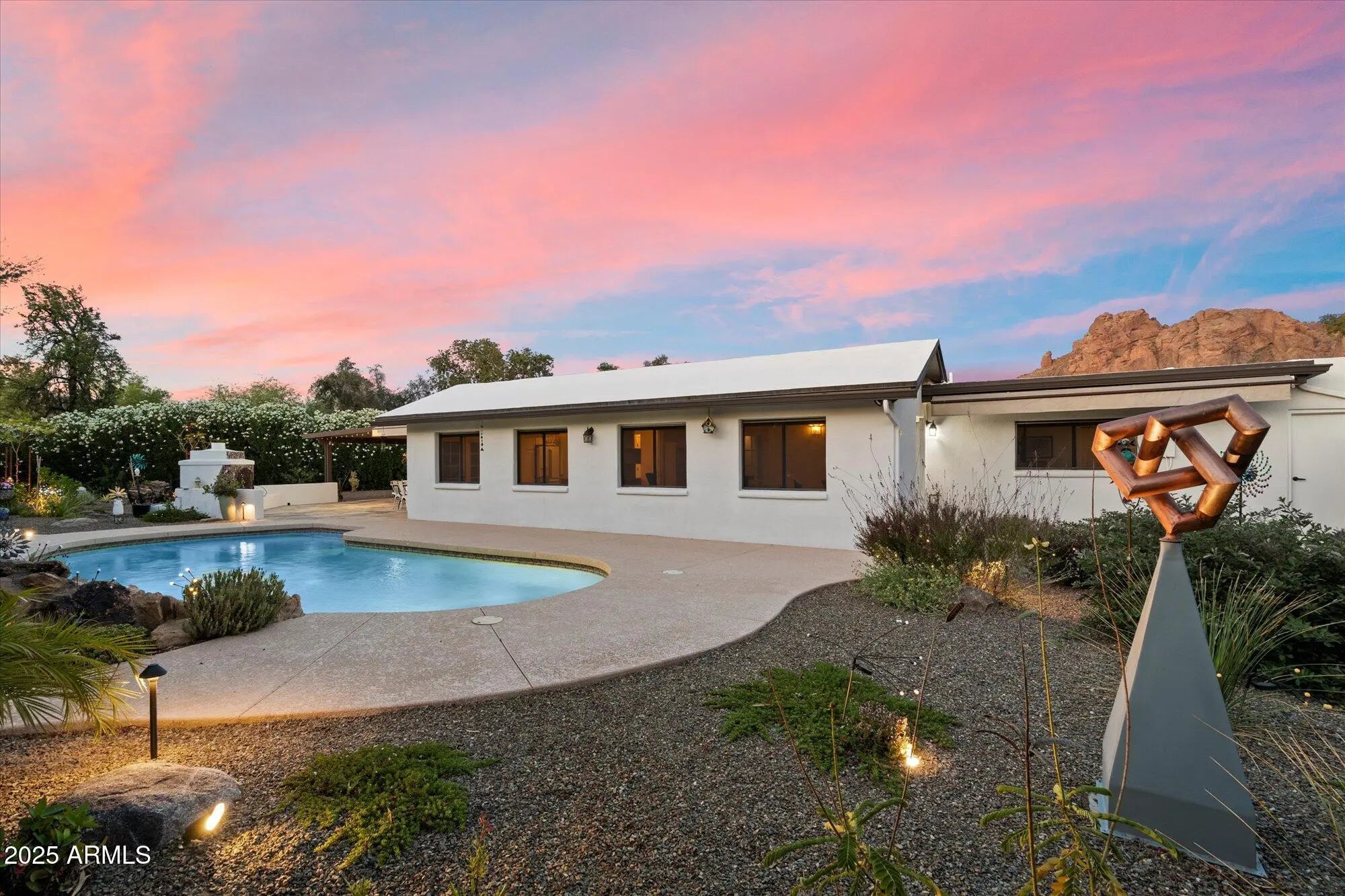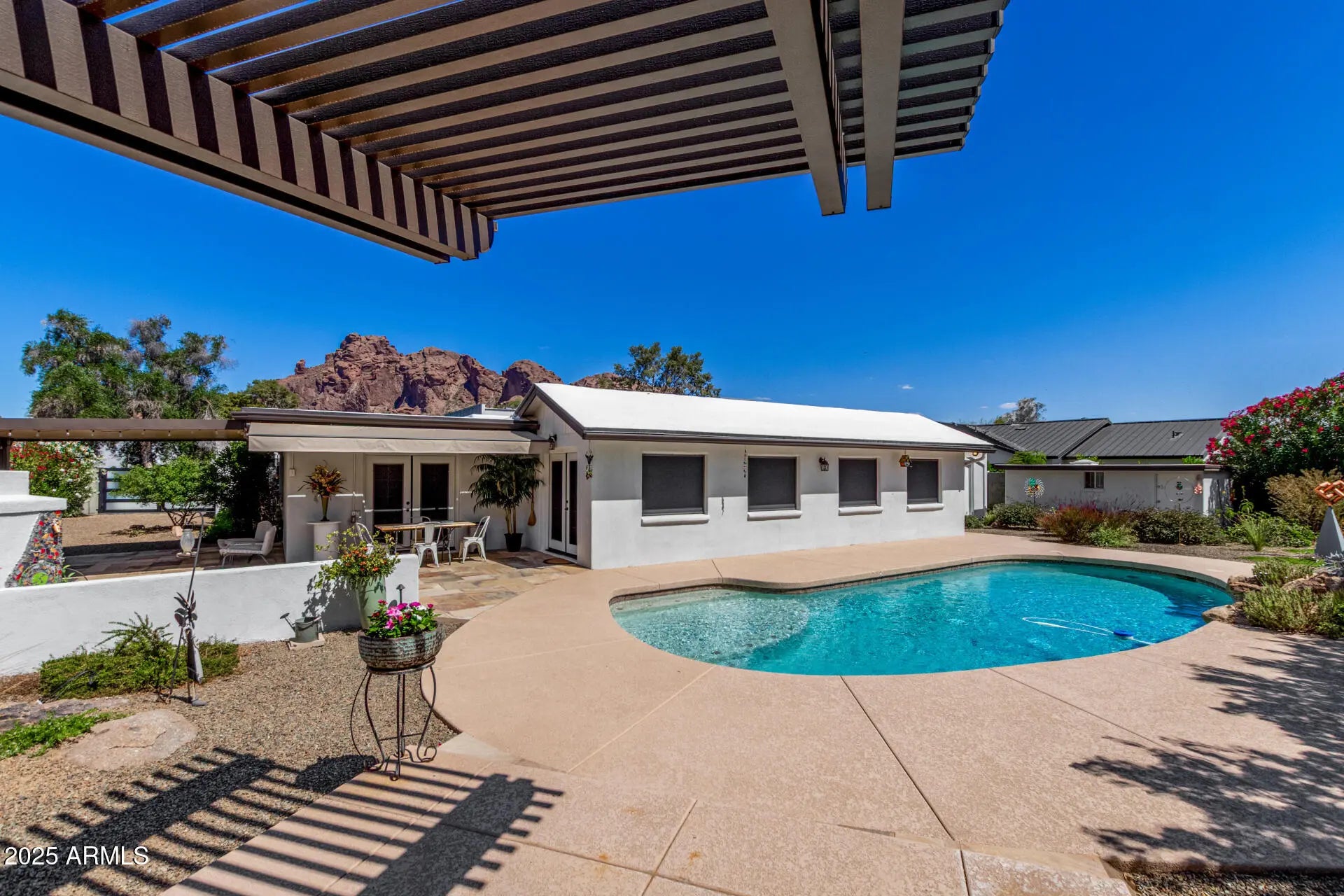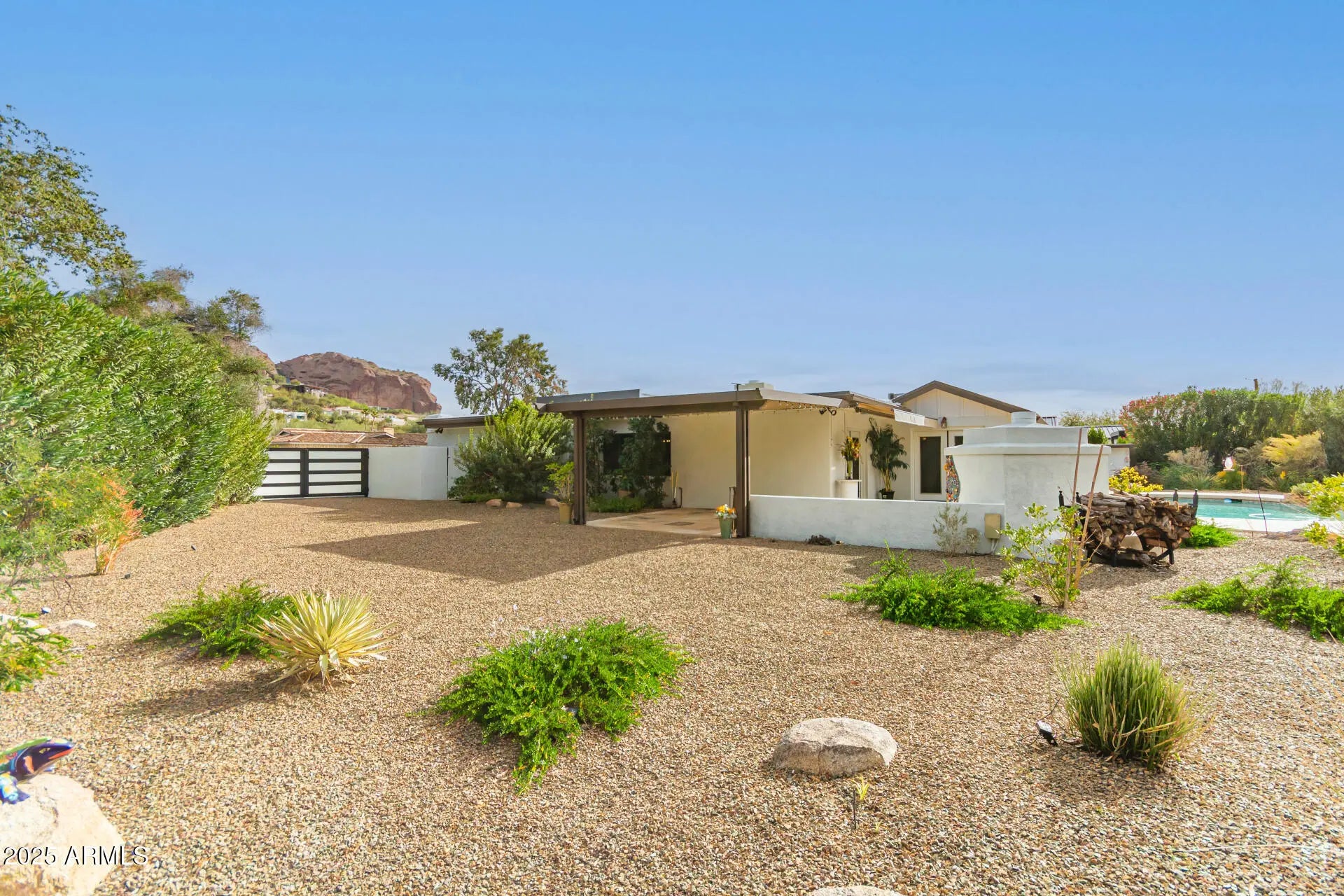 Stunning remodeled modern home with breathtaking Camelback Mountain views! Enjoy seamless indoor-outdoor living with sliding doors opening to a serene front patio with firepit. The open floor plan connects the family room, dining area, kitchen & breakfast room - perfect for entertaining. French doors lead to a resort-style backyard with a pool, waterfalls, walking gardens with night lighting, fireplace, & covered patio. Features 4 beds, 2.5 baths, Den, 2 AC Units & Split Unit, Skylights, Tile Flooring, Tankless Water Heater, 2-car Garage with Epoxy Floors, Cabinets, EV charger; Large Temperature-controlled Storage Unit, RV Gate and ultimate privacy. Second main bedroom has separate private entry. Walk to Camelback Canyon Trails, The Ambassador, Steak 44, The Henry & more. A must-see gem!