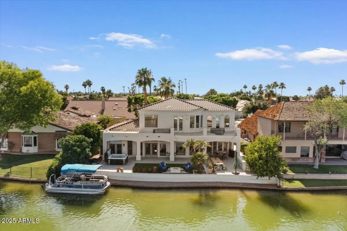 Experience luxury lakefront living in this gated, custom-built Mediterranean home, ideally situated on a private cul-de-sac point lot with panoramic views of the water. Designed with elegance and comfort in mind, this residence boasts countless custom features and high-end finishes throughout. Upon entering the grand foyer, you're immediately drawn to the breathtaking views of the lake—so close, it feels like it's right at your back door. The east-facing backyard fills the home with soft morning light, perfect for enjoying your coffee on the private balcony just off your home office. The main level features a serene Master Suite designed as a spa-like retreat, complete with dual vanities, dual walk-in closets, marble floors, and a luxurious primary bathroom. Escape to your lakeside above-ground spa off the private access to the back yard patio. The gourmet kitchen offers new appliances, a large center island, and a spacious dinette area, seamlessly flowing into the open-concept family roomall with stunning lake views. Upstairs, you'll find three private bedrooms, a full bathroom, and a cozy loft space, ideal for a reading nook or study area. Step outside into your backyard oasisexpertly designed for entertaining and relaxation. The space features elegant travertine pavers, an outdoor kitchen, a gas firepit, above-ground spa with heater, and a maintenance-free artificial turf lawn with mature lemon, orange & fig trees. Your private boat dock allows for effortless access to the lake, completing the ultimate waterfront lifestyle. Additional highlights include an oversized three-car garage with over-height ceilings and custom-built suspension storage, ideal for maximizing space and organization. This is a rare opportunity to own a one-of-a-kind waterfront retreat where every detail has been thoughtfully curated. Welcome home.