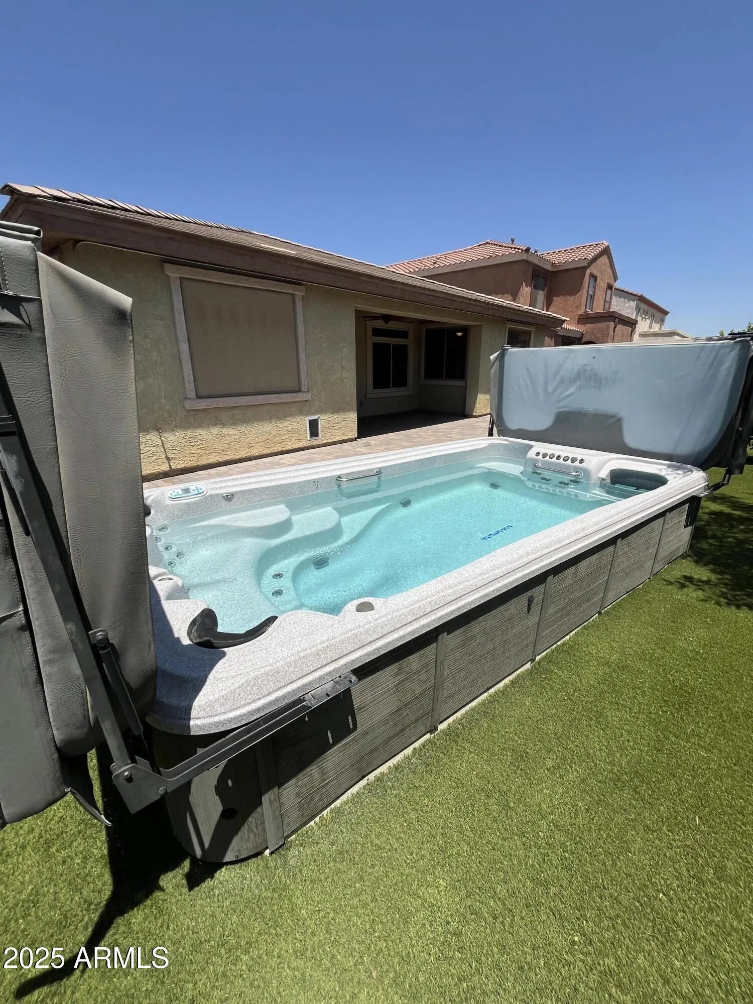Welcome to this beautiful property nestled perfectly on a corner lot. Artificial turf, fruit trees, covered patio w/brick pavers, auto water filter system and swim spa. More amenities include but not limited to: PAID Solar, split floorplan, bath for every bedroom, breakfast/coffee/wine bar, newer water heater and newer AC unit, tiled & LPV floors & Sep Den. Newer kitchen appliances. Right across the street from a beautiful park with ramada, walking trails and kids play area, upgraded and maintained well. Come see for yourself how beautiful this home really is before it slips away!