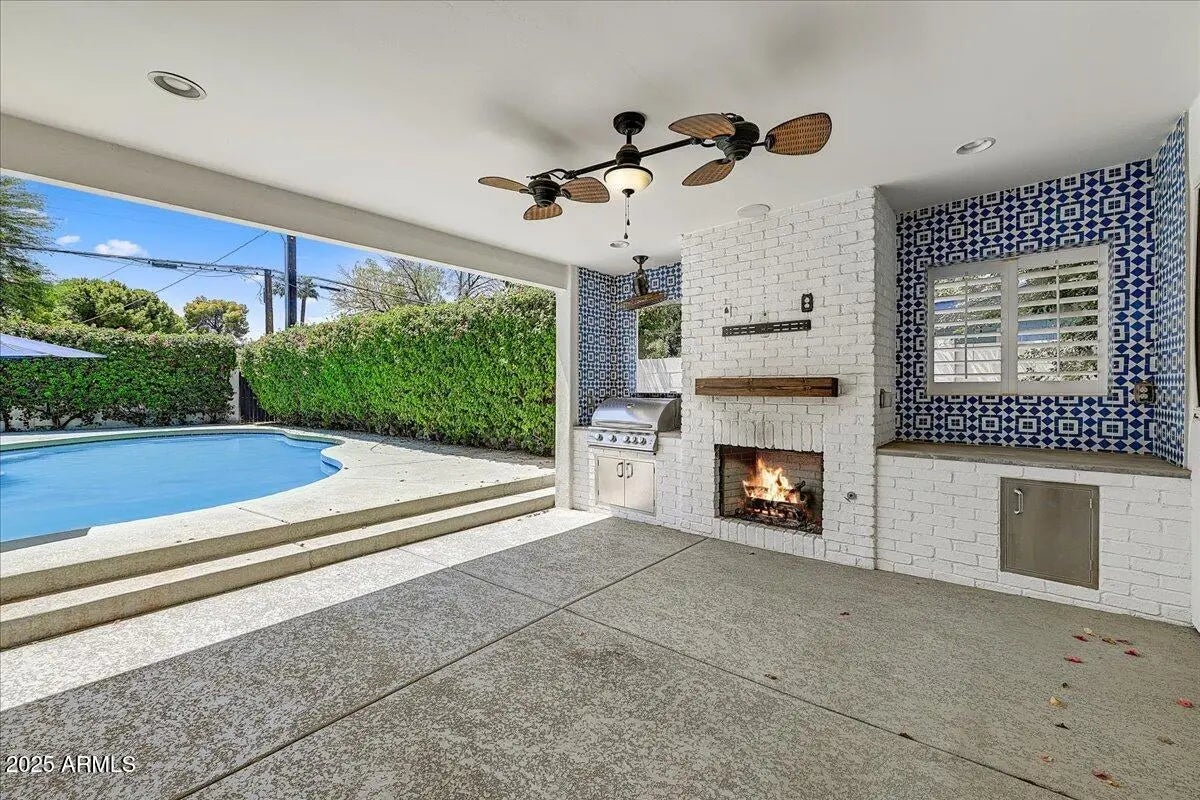 Best deal in the Arcadia Osborn neighborhood and completely updated throughout. With 4 bedrooms, 3 baths plus a den/office there is ample room for all. The open concept floor plan allows for effortless living and entertaining. The kitchen boasts marble counters, Bosch appliances, wine fridge and a large island at the center. The owner's retreat features a spacious sitting room, fireplace and an expansive bathroom with dual vanities, marble floors, soaking tub and a walk-in closet. The backyard is the ideal place to relax or enjoy spending time with friends and family. Cool off in the pool or lay back under the covered patio, complete with built in BBQ, fireplace and TV area. Grassy play area, 2-car garage all in the heart of Arcadia Osborn.