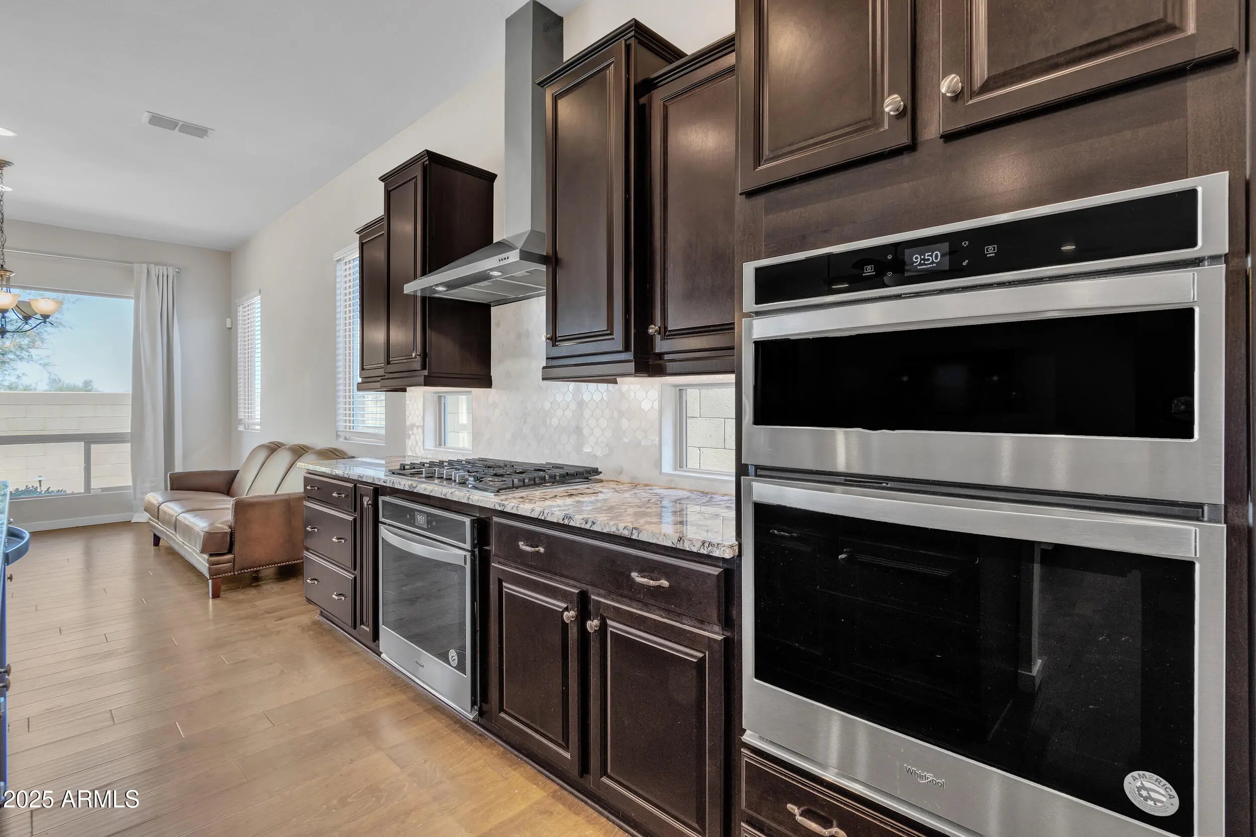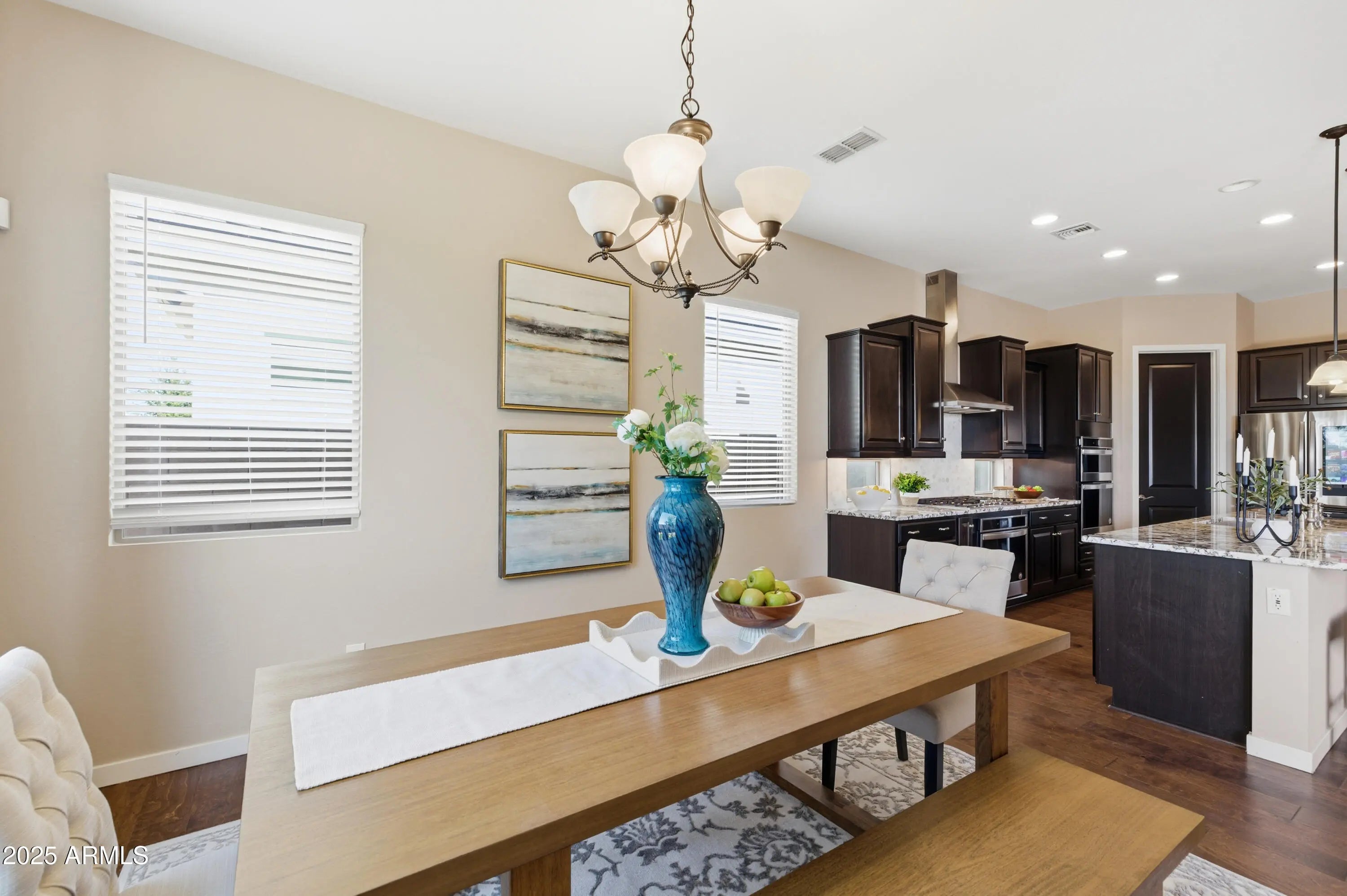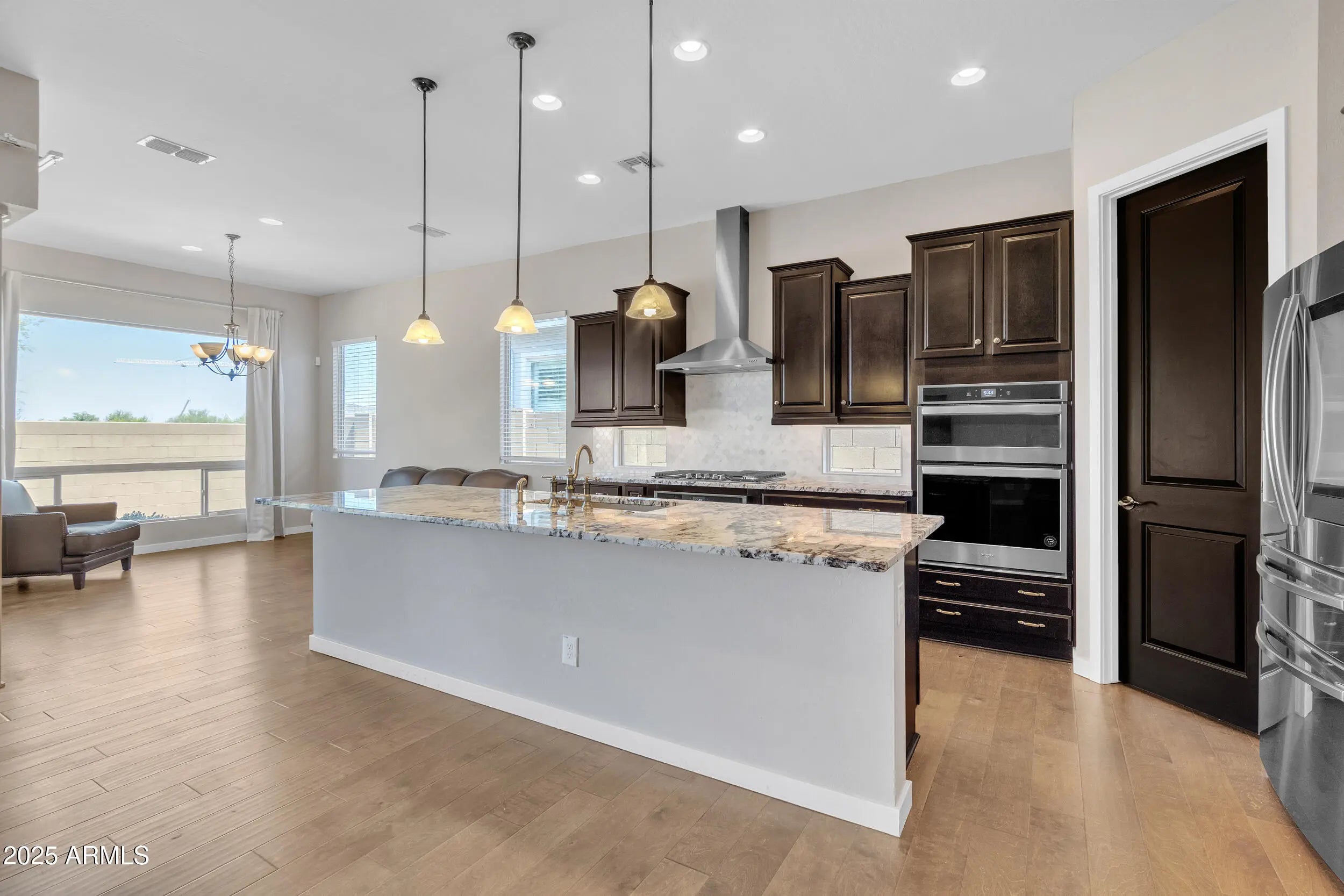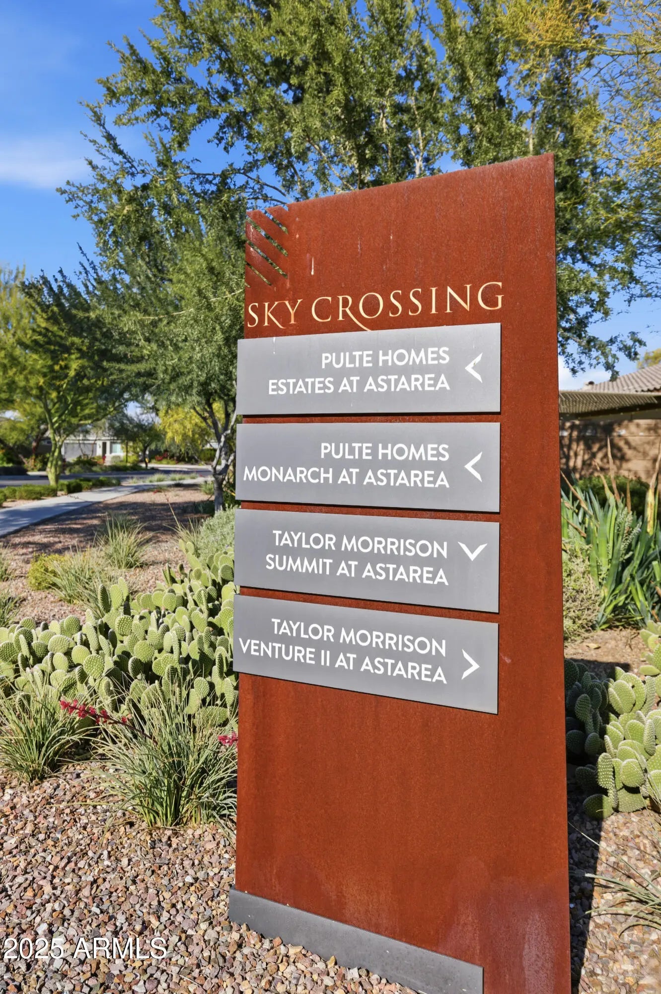 Welcome to refined desert living in the exclusive, gated enclave of Astarea at Sky Crossing. This exquisite 3-bedroom, 2.5-bath residence offers a thoughtfully designed open floor plan that effortlessly blends sophisticated entertaining with everyday comfort. The chef's kitchen is a true showpiece, featuring an oversized island with granite countertops, custom designer lighting, and a massive walk-in pantry. Premium stainless steel appliances include a Samsung smart refrigerator, gas cooktop, and dual ovens—perfectly complemented by a separate beverage bar with built-in wine fridge. Spacious eat-in kitchen OR utilize the separate office space for a private dining room if you entertain more! Retreat to the expansive primary suite, where breathtaking mountain views greet you from the window. The en-suite bath showcases upgraded hardware, luxury fixtures, and a serene spa-inspired design. A spacious laundry room with Samsung washer and dryer adds convenience with style. Enjoy seamless indoor-outdoor living with a corner sliding glass wall that opens completely to a covered tile patio, offering unmatched privacy with no neighbors behindthe perfect space for relaxing or hosting under the Arizona sky. Residents of Sky Crossing enjoy resort-style amenities, including a sparkling community pool, state-of-the-art fitness center, clubhouse, playgrounds, lush parks, and an on-site elementary school. Ideally located just minutes from Desert Ridge Marketplace and City North, this home offers the perfect blend of luxury, comfort, and convenience.
