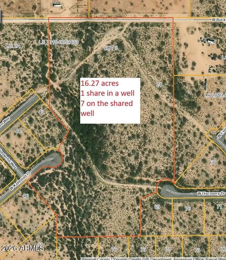 STUNNING 16.27 ACRES OF BEAUTY. ONE SHARE IN THE WELL. THE VIEWS ARE AMAZING! LOCATED OFF OF HWY 89, BETWEEN WICKENBURG AND CONGRESS. . GREAT LOCATION. YOU CAN RIDE OUT AND ENJOY ENDLESS MILES OF LAND. LOTS OF HORSE PROPERTIES IN THE AREA. BUILD YOUR MINI DREAM RANCH..LOTS OF ROOM FOR YOUR ARENA, BARN, STALLS, HOME AND MUCH MORE. IF YOU ARE NOT A HORSE PERSON, THERE ARE MILES OF WALKING AND EXPLORING. LOTS OF QUADING, JEEPING OR JUST ENJOYING THE PEACE AND QUIET. AMAZING POTENTIAL. PROPERTY CAN BE SPLIT.