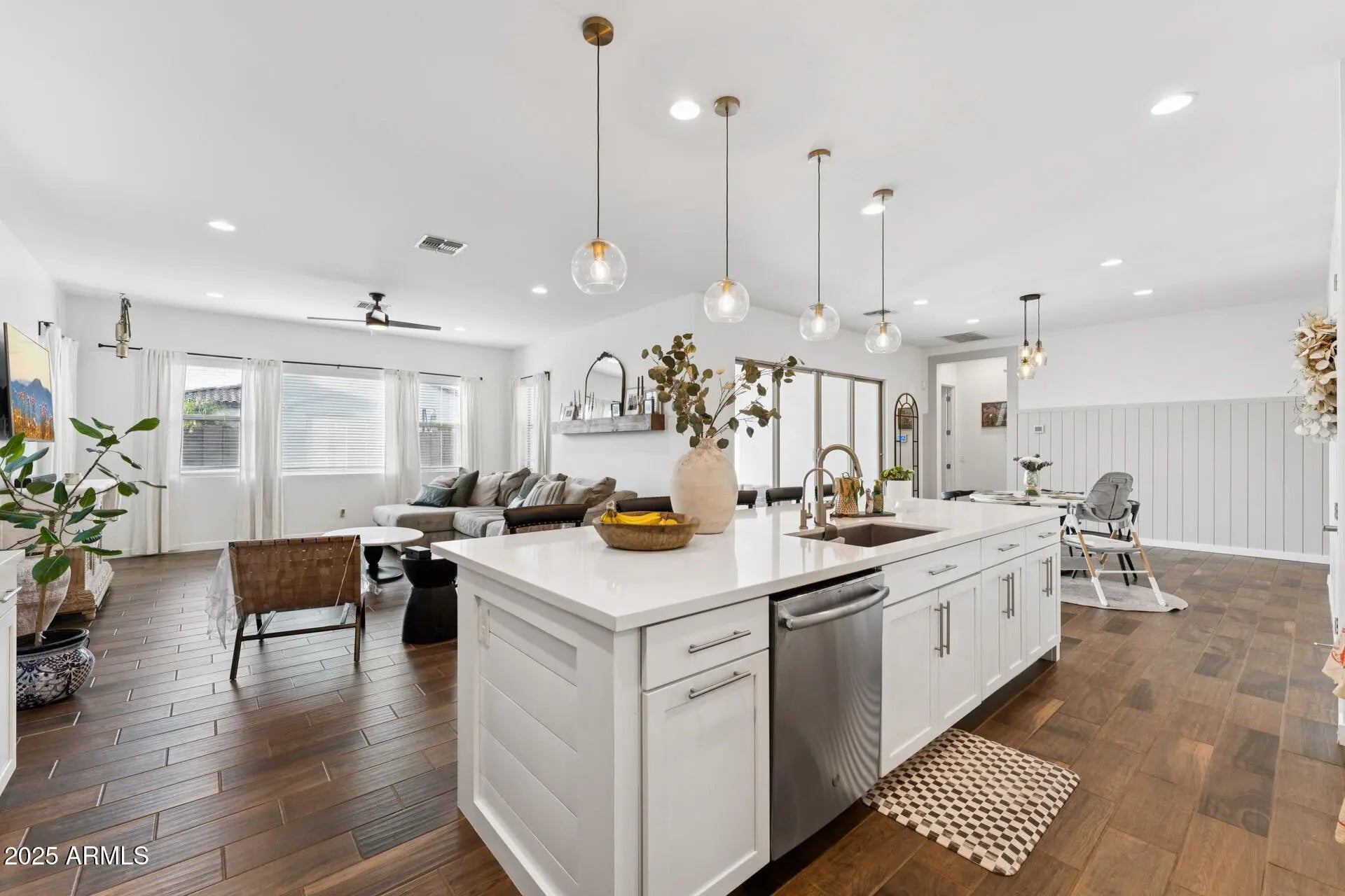 Beautifully updated (4) bed, (3) bath and (3) car garage home! Scandinavian style interior w/ brown wood plank tile throughout, quartz countertops, white cabinets, wall oven/microwave, gas cook top, walk-in pantry, beautiful custom built in shelving/desk unit in master bedroom, large walk-in shower, large laundry & mud room. Water softener & RO, large double sliding door opens to large covered patio, synthetic grass and pavers in backyard. Home is close to shopping, restaurants, and great schools etc!
