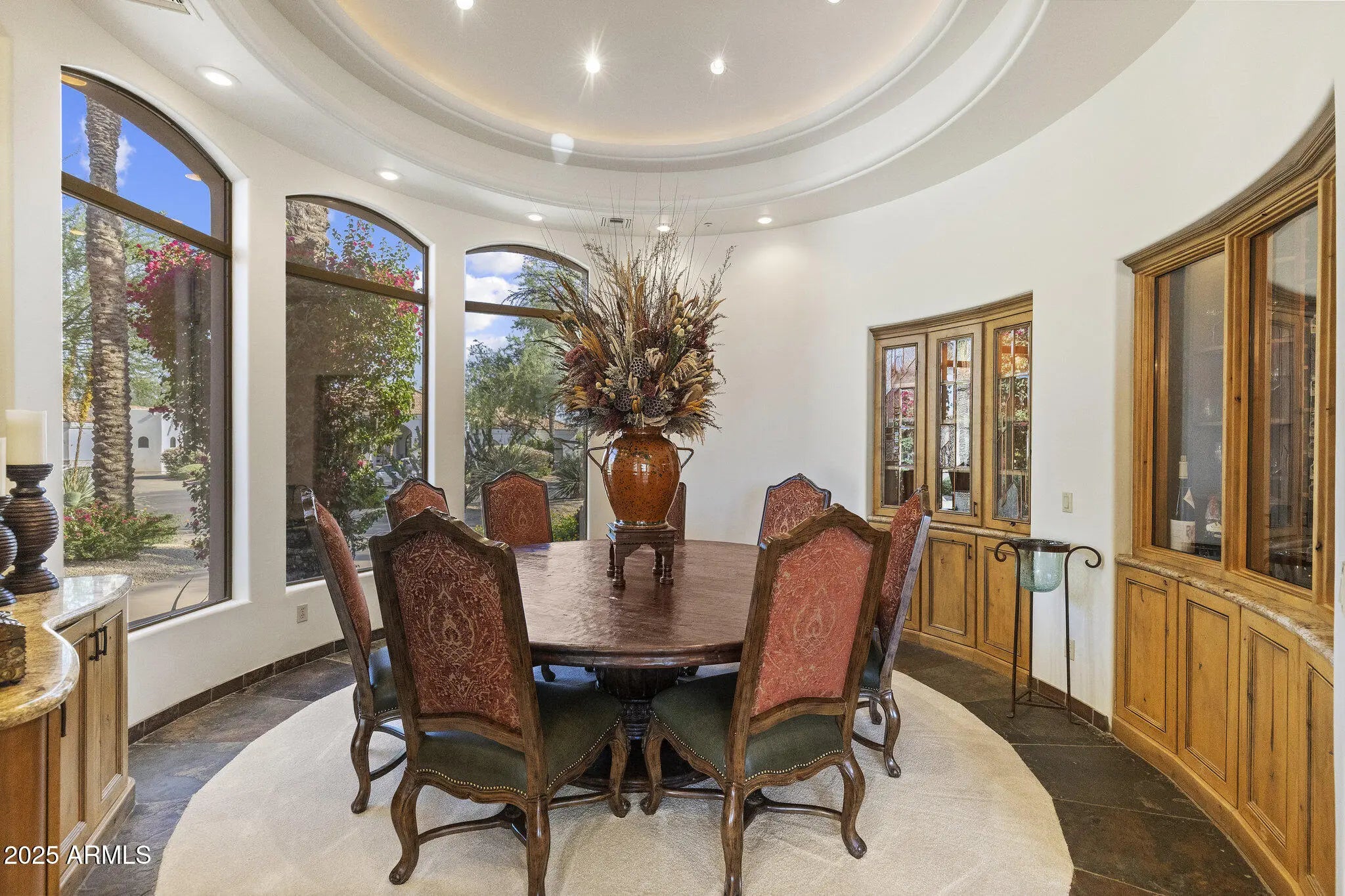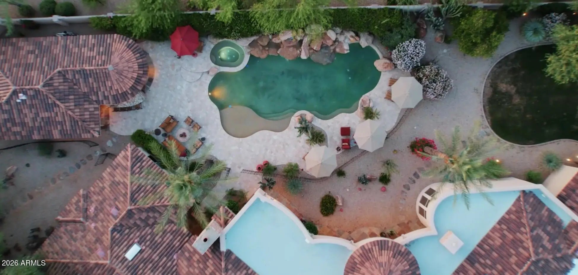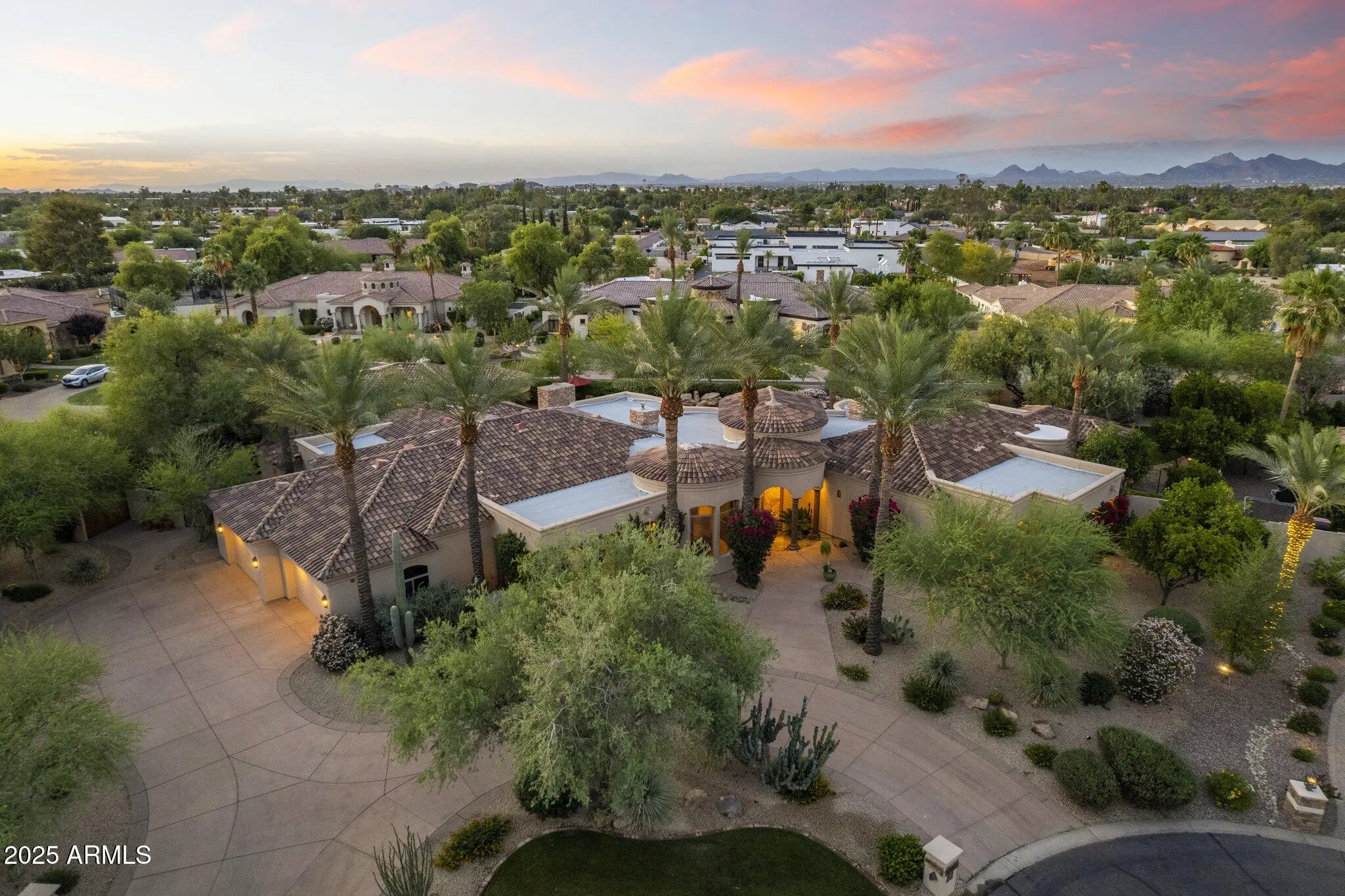 NEW PRICE $525/SQFT GATED CACTUS CORRIDOR ESTATE HIDDEN IN THE HEART OF SCOTTSDALE. Located within Portales del Sol, a private enclave of ten custom estates, this property offers exceptional privacy with no neighbors on three sides while remaining minutes from Scottsdale Rd, Hayden Rd, and Loop 101. This 6295 SQFT custom estate plus 645 SQFT detached guest house sit on a 35,116 SQFT lot and feature six ensuite bedrooms, eight bathrooms, multiple private wings, and a four-car garage, offering exceptional flexibility for family living, guests, or multigenerational use. Built in 2001 with exceptional construction quality and recently improved with a brand-new roof, fresh interior and exterior paint, new shower, new carpet, and fully serviced and inspected systems. Original architectural plans convey on sale, offering the next owner the ability to personalize the space. ENTRANCE into Portales del Sol begins through a private gated, tree-lined drive leading into a lush cul-de-sac of custom estates. Mediterranean-Southwestern architecture blends with European-inspired elegance where a fountain and bougainvillea-wrapped columns frame the custom mullion-glass front door. A dramatic rotunda entry with copper-inlay flooring introduces the refined craftsmanship found throughout the home. EAST WING serves as a private retreat anchored by the grand primary suite with fireplace, sitting area, and French doors opening directly to the gardens and pool. Dual walk-in closets and a spa-style bath with dual vanities, soaking tub, and walk-in shower create a luxurious setting. This wing also includes a richly finished private office, a dedicated exercise room, and an additional ensuite bedroom ideal for guests or extended family. WEST WING offers three oversized ensuite bedrooms, each with walk-in closets, private baths, built-in shelving, and charming window seats. The bedrooms surround a spacious game room that can be closed off for privacy and includes two built-in desks with task lighting and a dedicated exit to the pool and patio. CHEF'S KITCHEN sits at the center of the home and showcases dual granite islands, Sub-Zero and DACOR appliances, dual stoves, dual warming drawers, dual dishwashers, dual pantries, and a custom handcrafted copper hood. Just beyond the kitchen, a private patio overlooks a lush garden and waterfall -- an ideal setting for morning coffee or an early evening cocktail while embracing Scottsdale's seamless indoor-outdoor lifestyle. FORMAL ENTERTAINING SPACES include an elevated rotunda dining room with a custom mesquite table for 8-12 guests, an adjacent 900-bottle wine room, a private living room with fireplace ideal for a grand piano or post-dinner conversation, and a beautifully designed custom bar with hammered copper sink that becomes a natural focal point when hosting larger gatherings. OUTDOOR LIVING evokes the feeling of a private resort. The tropical diving pool features a rock waterfall, diving rocks, extended Baja shelf, and heated spa surrounded by lush landscaping. Expansive lawn areas, mature citrus trees, and stately palms create a rare garden environment. A covered entertainment portico with built-in BBQ and fireplace provides an ideal setting for outdoor dining. With no neighbors on three sides and double-gated side yards, the property offers exceptional privacy and flexibility. DETACHED GUEST HOUSE includes its own private entrance with bedroom, bathroom, living room, kitchenette, and laundry hookups -- perfect for extended family, long-term guests, live-in staff, or a private studio. ADDITIONAL FEATURES include CAT5 wiring, EERO WiFi mesh system, Golden Eagle security, WiFi-enabled garage openers, Spotify-connected surround sound inside and out, and custom iron pool safety fence. LOCATION is minutes from Scottsdale's premier dining, shopping, golf, major medical centers, and the Loop 101 freeway, offering convenient access to Scottsdale Airport and Phoenix Sky Harbor for business or leisure travel. Private location to host friends during Barrett Jackson Car Auction, Phoenix Waste Management Open and Spring Training Baseball. The property is also convenient to several highly regarded private schools including Rancho Solano Preparatory School and Scottsdale Christian Academy.