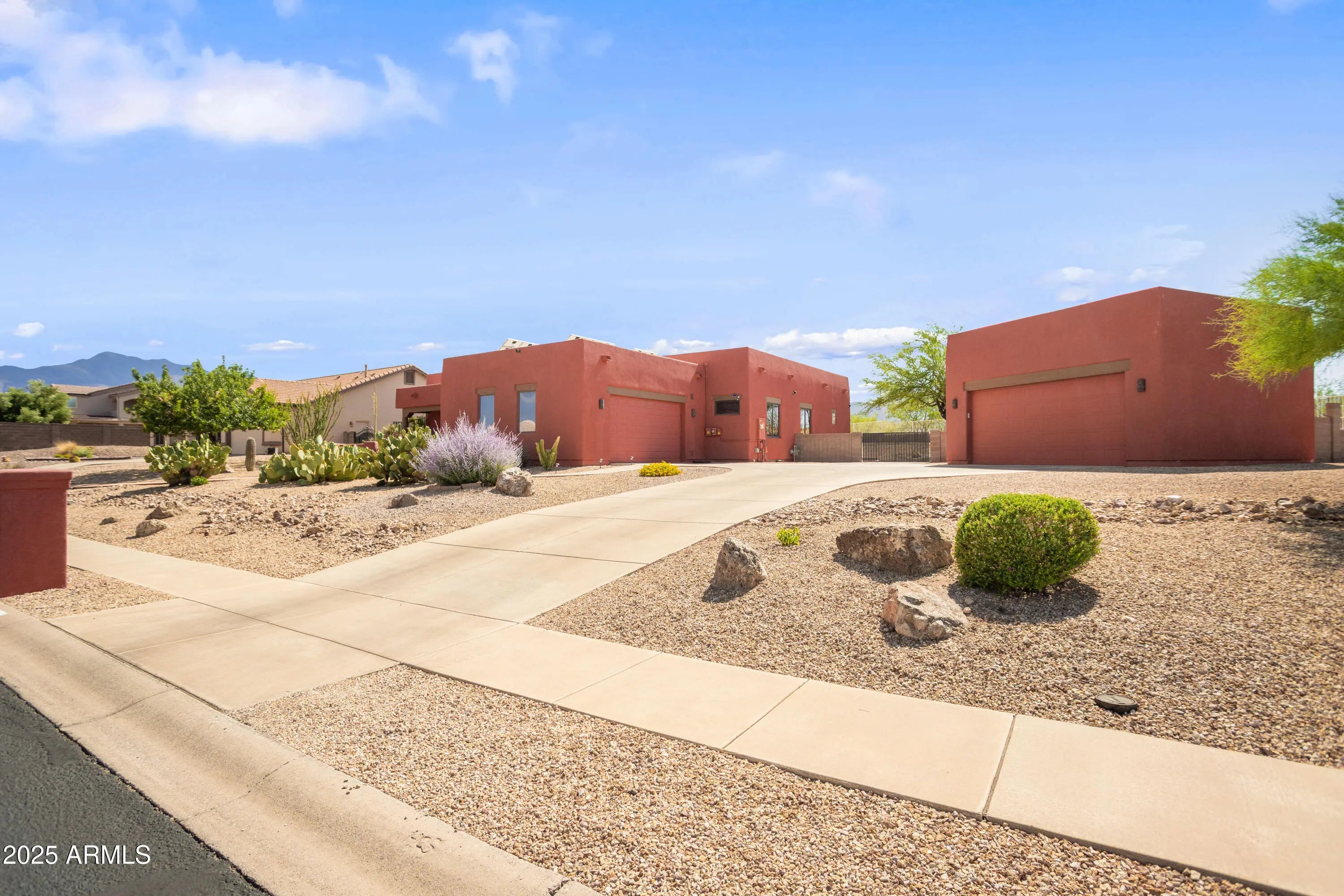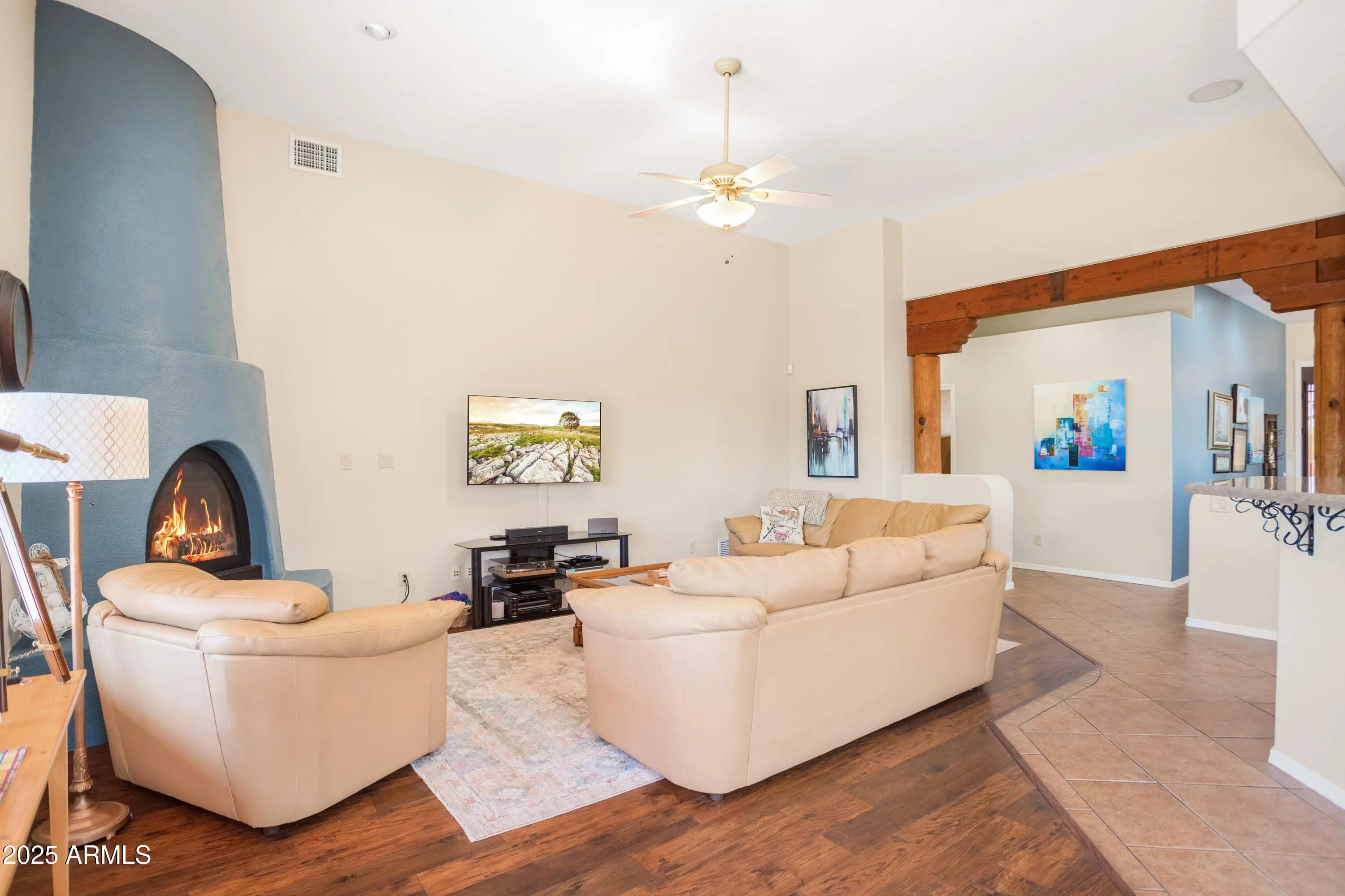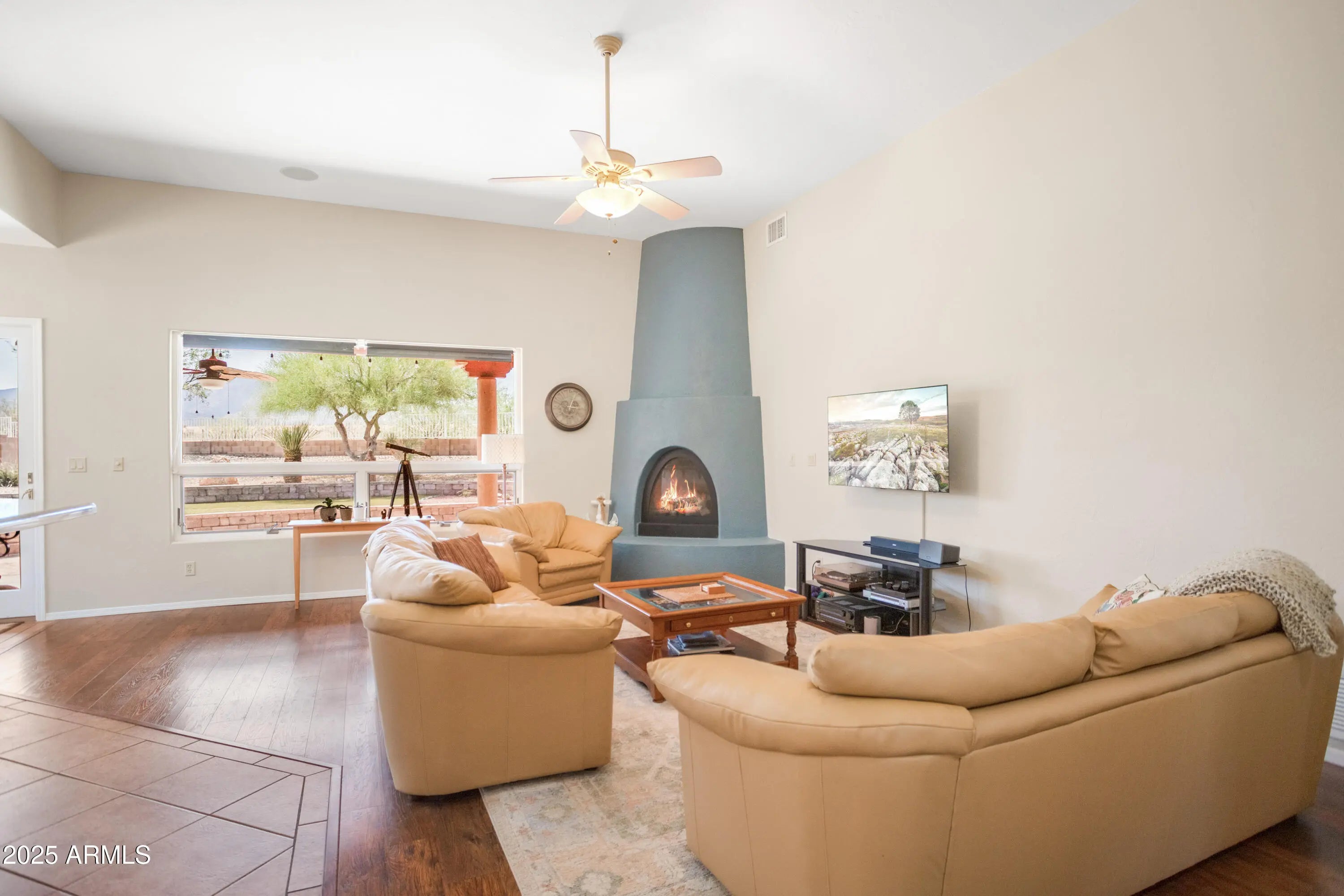 Discover this elegant custom Walston home in Sierra Vista: a 4 bedroom, 3 bath spanning 2,819 sqft including a 250 sqft heated & cooled workshop/gallery converted from the back portion of the detached garage. The home features formal living and dining areas, a great room with fireplace and custom blinds, and an updated kitchen with stainless steel appliances, abundant cabinetry, and quartz counters. Vaulted ceilings and hardwood-style ''Vegas'' floors flow throughout, complemented by dual-pane windows for efficiency and a brand new hot water heater. Recent updates include fresh interior/exterior paint, upgraded landscaping, and modern lighting. Outside, resort-style, low-maintenance landscaping reveals panoramic mountain and city-light views.