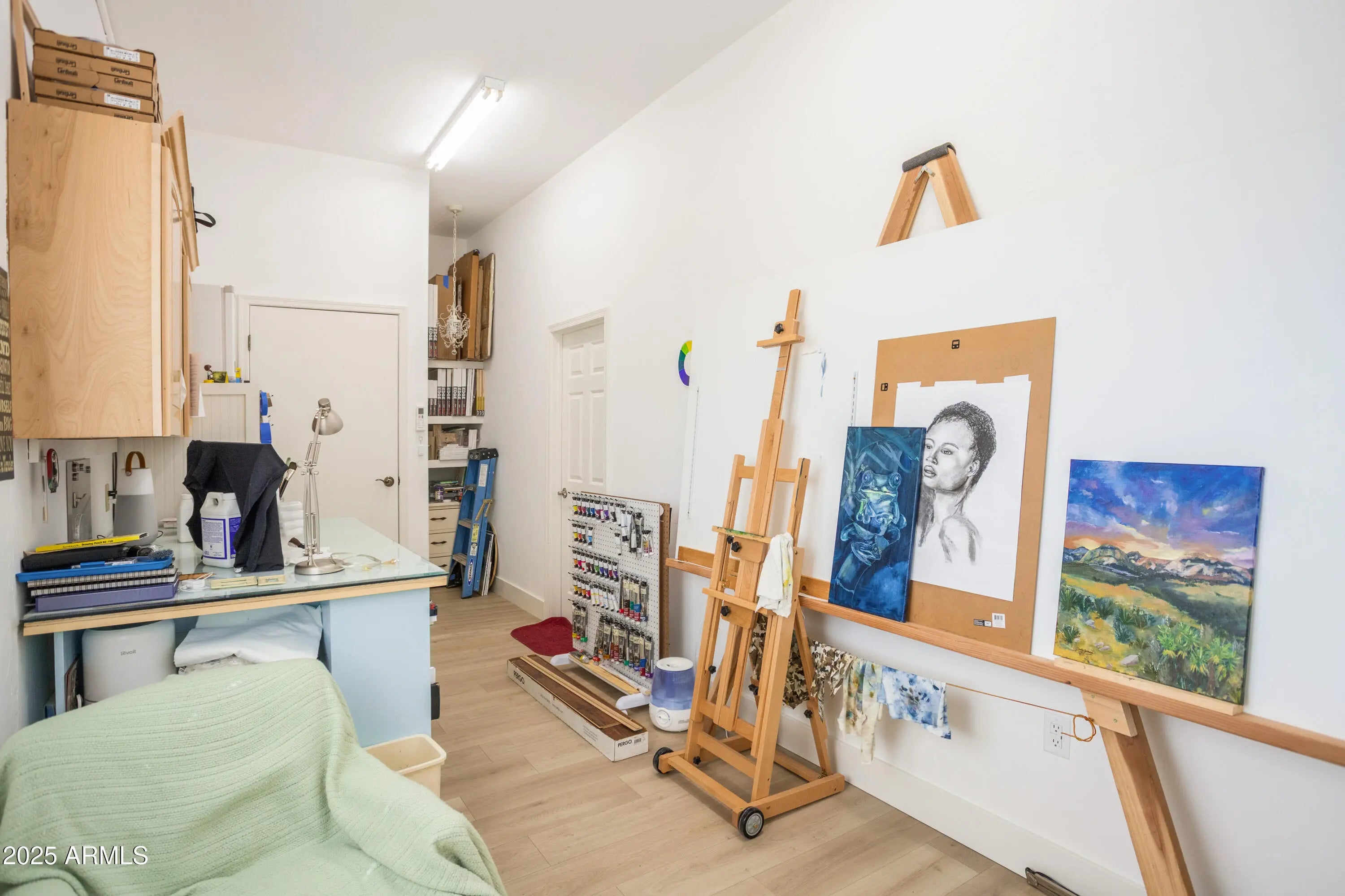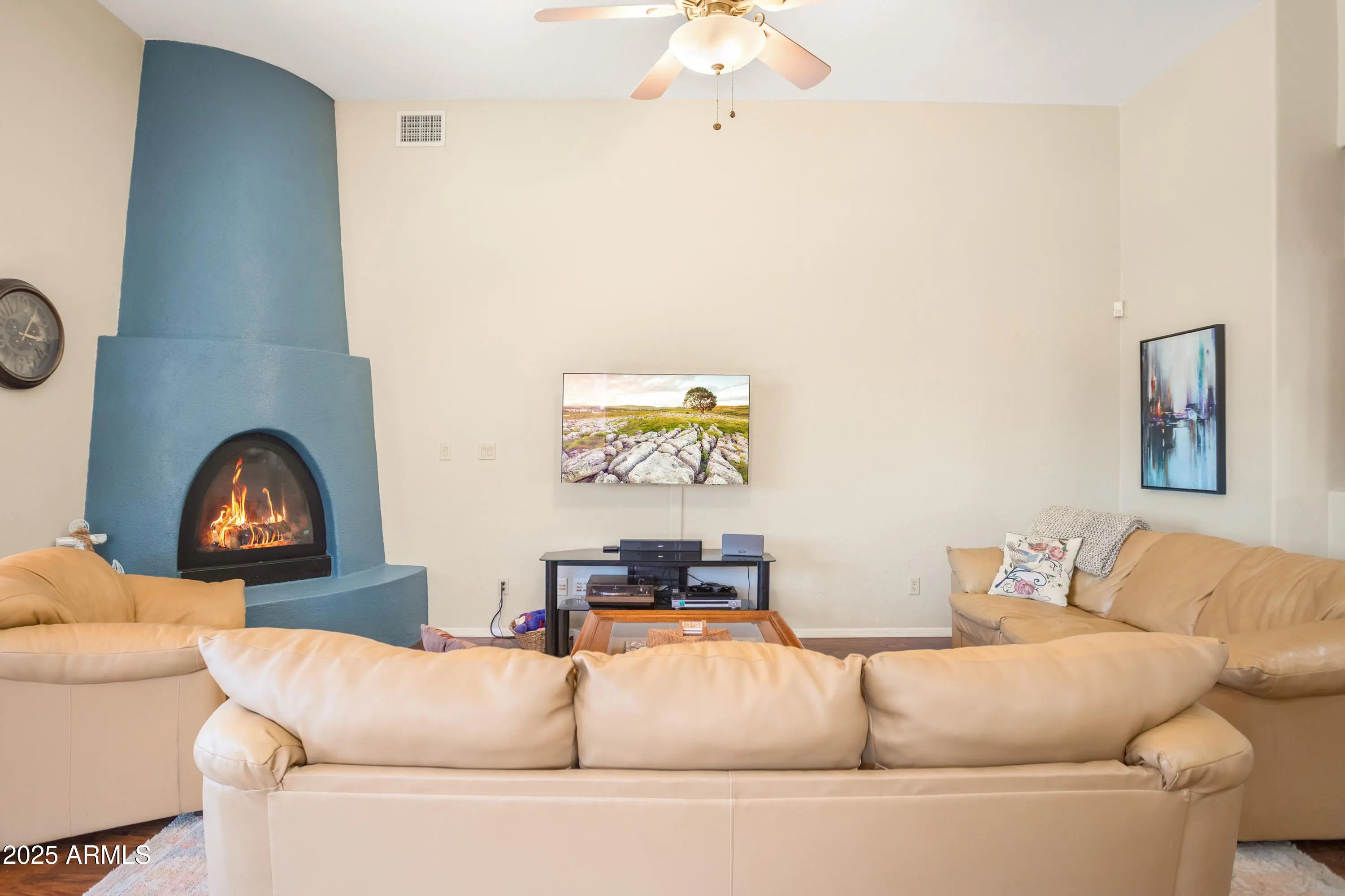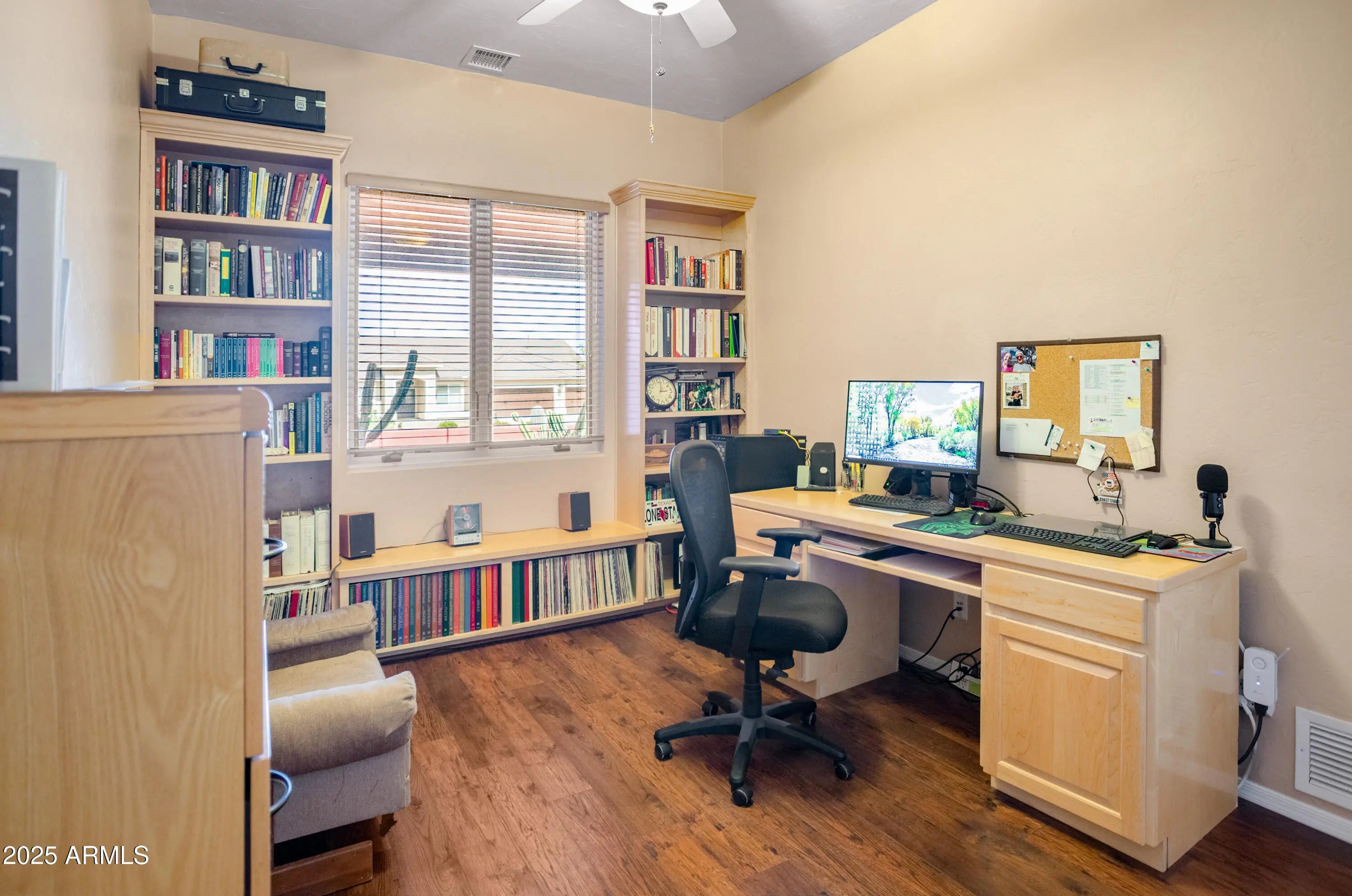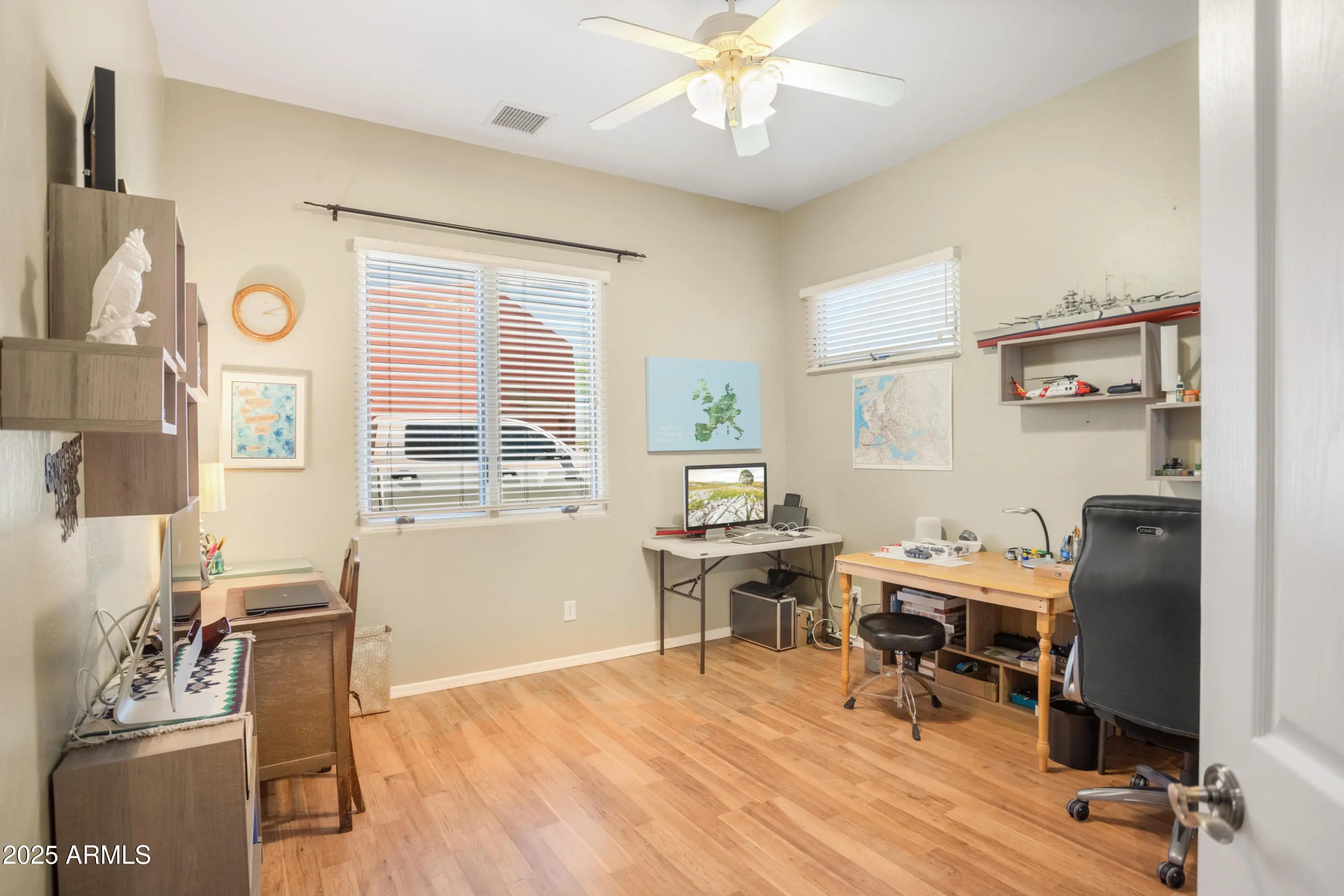 Discover this elegant custom Walston home in Sierra Vista: a 4 bedroom, 3 bath spanning 2,819 sqft including a 250 sqft heated & cooled workshop/gallery converted from the back portion of the detached garage. The home features formal living and dining areas, a great room with fireplace and custom blinds, and an updated kitchen with stainless steel appliances, abundant cabinetry, and quartz counters. Vaulted ceilings and hardwood-style ''Vegas'' floors flow throughout, complemented by dual-pane windows for efficiency and a brand new hot water heater. Recent updates include fresh interior/exterior paint, upgraded landscaping, and modern lighting. Outside, resort-style, low-maintenance landscaping reveals panoramic mountain and city-light views.
