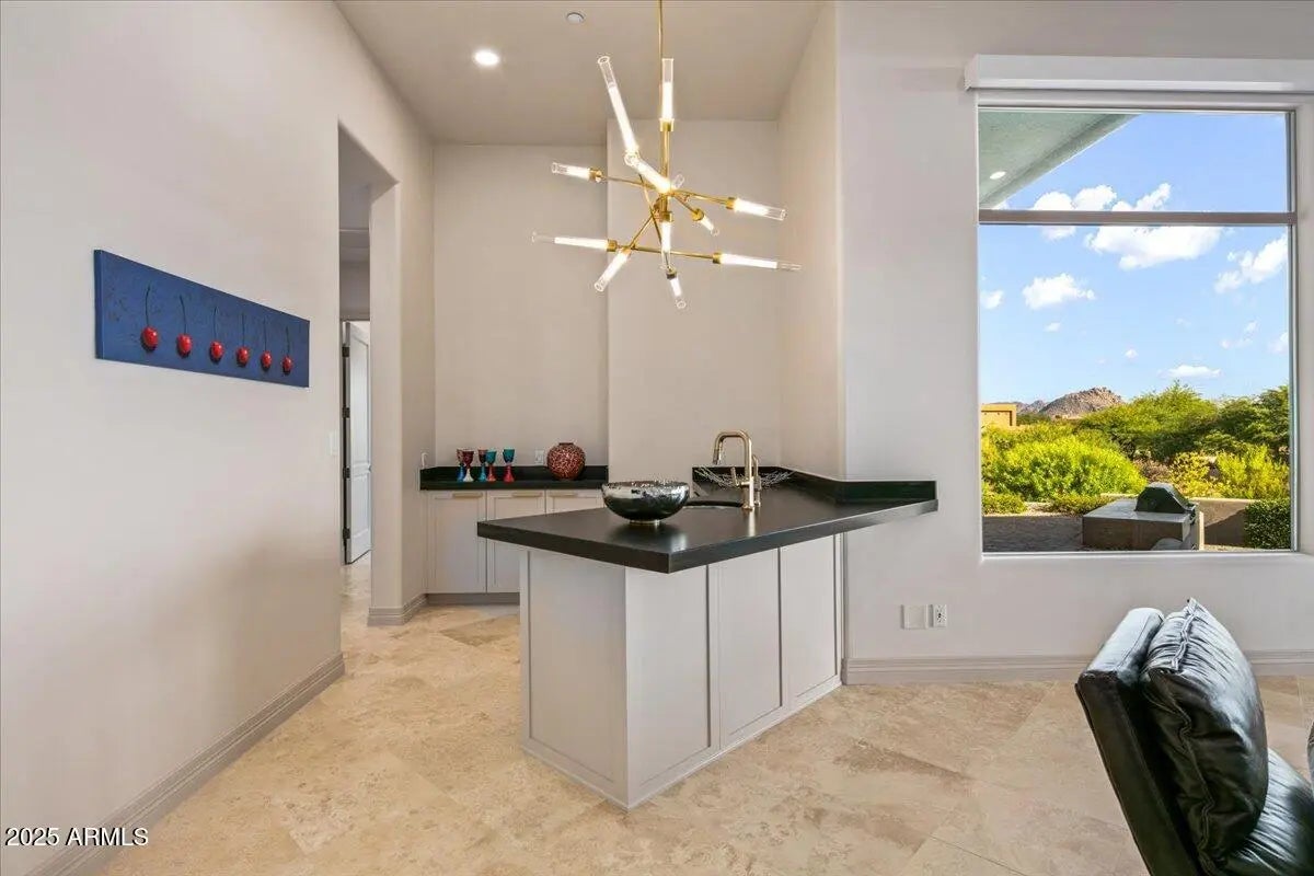 Perched on an elevated 1.3-acre lot with sweeping views of Pinnacle Peak, this fully remodeled home offers luxurious single-level living and stunning mountain vistas from every room. The residence features a completely updated kitchen, modernized bathrooms, and new flooring throughout. Soaring 22-foot ceilings enhance the spacious, open layout, which flows effortlessly from the great room and bar to a vast covered patio with a negative edge pool, spa, outdoor kitchen, and fire pit—perfect for entertaining. The thoughtfully designed split floor plan includes two private offices and a spacious primary suite featuring dual walk-in closets, dual water closets and a versatile bonus room ideal for a gym, meditation space, or massage room. An attached guest casita with its own entrance and patio offers privacy and comfort. Enjoy panoramic views of Pinnacle Peak, Troon Mountain, and the McDowell Mountains from every corner of this exceptional property, complete with a 4-car garage.