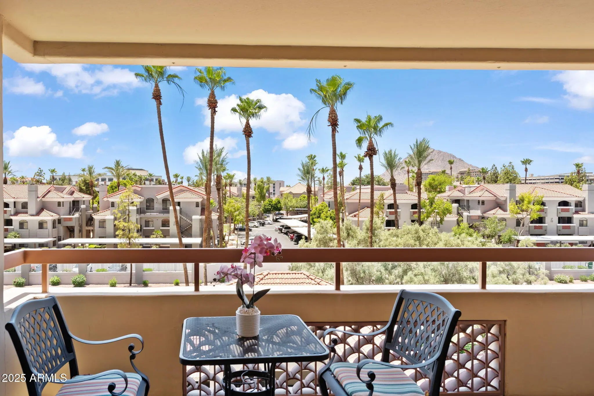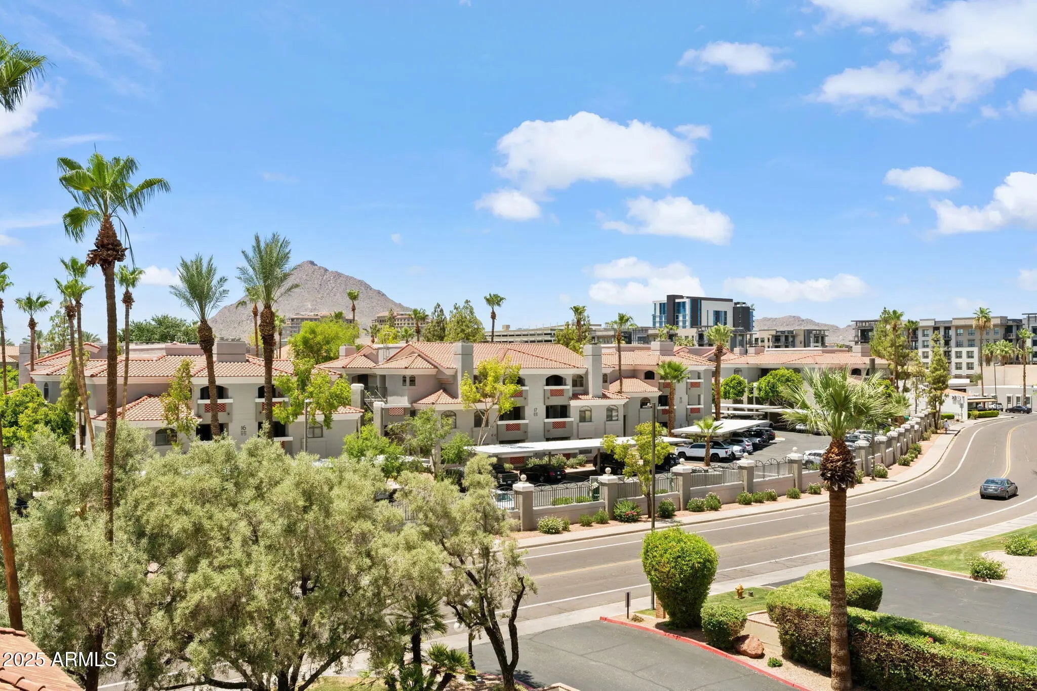 CAMELBACK MOUNTAIN VIEWS! Resort style, upper level 2 Bedroom, 2 Bathroom condominium at the Scottsdale Marquessa * Perfect location minutes to Fashion Square Mall, Waterfront and across the street from ''coming soon'' Whole Foods Market *Very close to Old Town Scottsdale *A couple of blocks from Baseball Spring training *New Lenox Air Conditioner in 2021 *Spacious unit with 114 square feet of living space and move in ready *Fully furnished *Remodeled kitchen and bathrooms. Dark Maple cabinetry (2 newer cabinets), stainless appliances, granite counters, in-ceiling lighting and breakfast bar. Unit features all tile flooring, ceiling fans. Primary bedroom includes walk-in closet, tiled shower and double sinks. Secondary bedroom adjoins upgraded hall bath for two primary suites if desired! Large balcony with great views, storage closet, laundry with side-by-side washer/dryer. One of two community libraries is right next to unit. Gated & assigned parking. HOA fee includes water and cable TV with prime channels, two resident lounges (one with fully equipped kitchen), fitness room, libraries, conference room, yoga room. Also close to Waterfront, Golf Courses, Fine Dining, Galleries, Shops, Cafes, Sprouts, TJ Maxx, PetSmart, Spring Training Venues! Fantastic location to get anywhere in the Valley! See today!