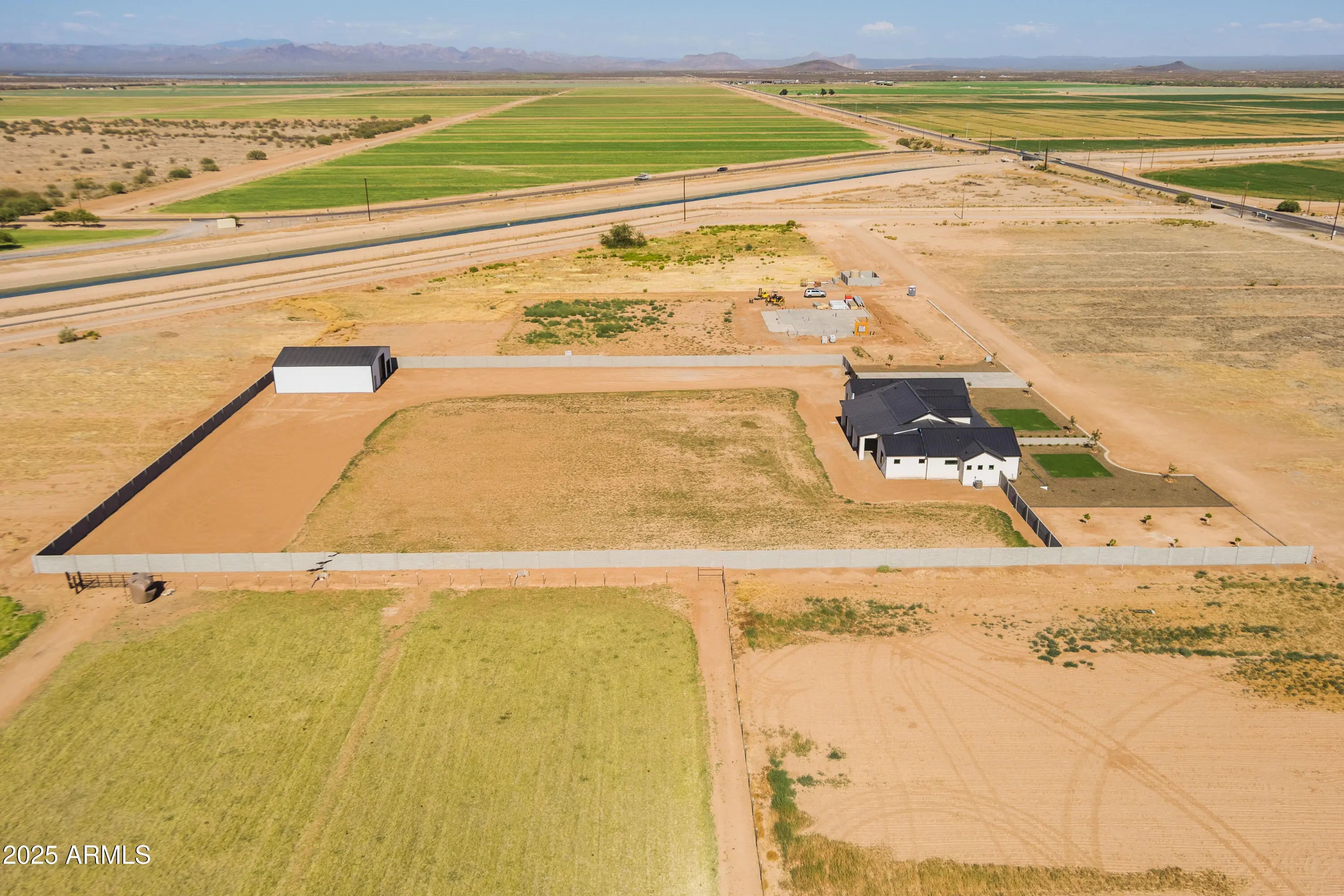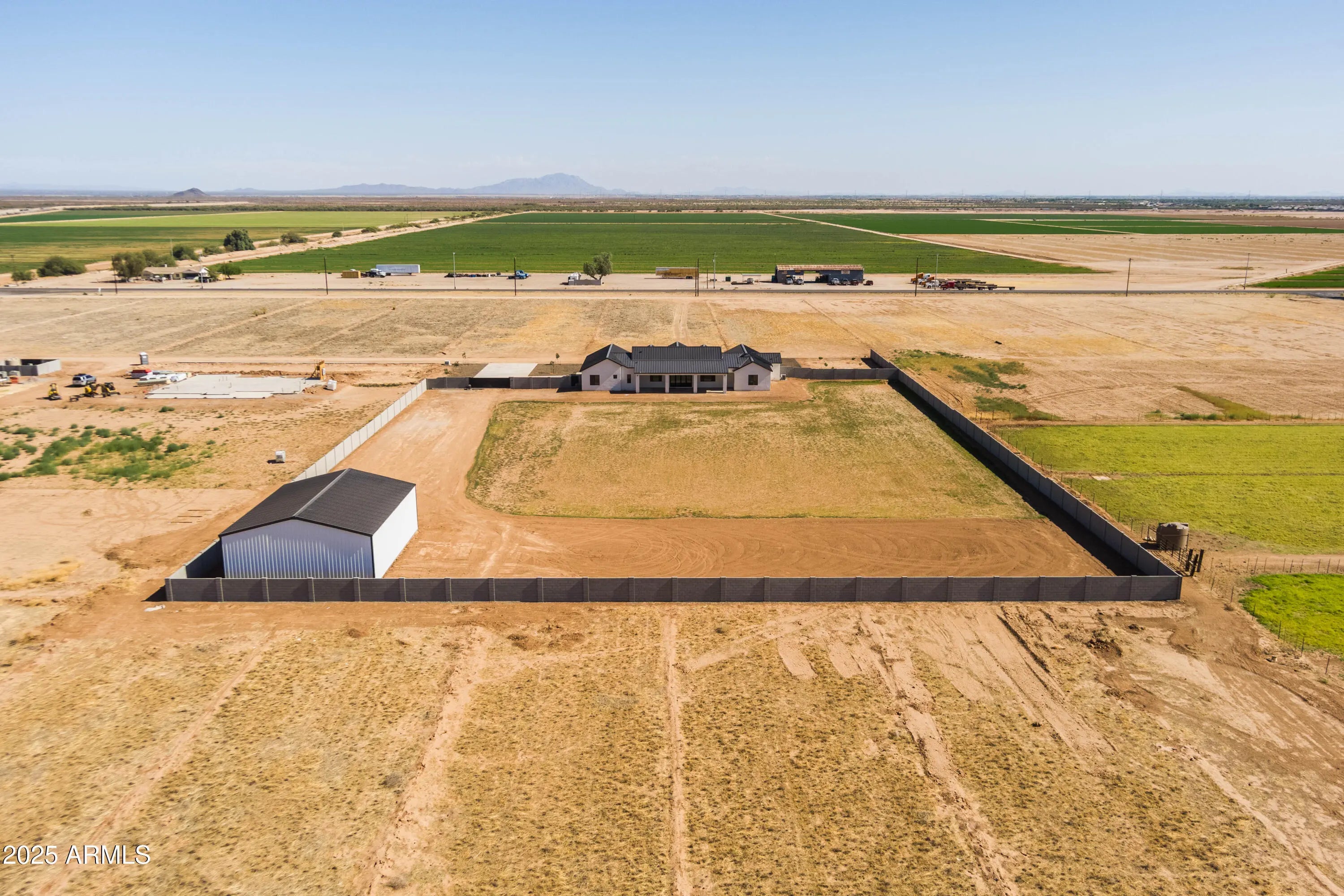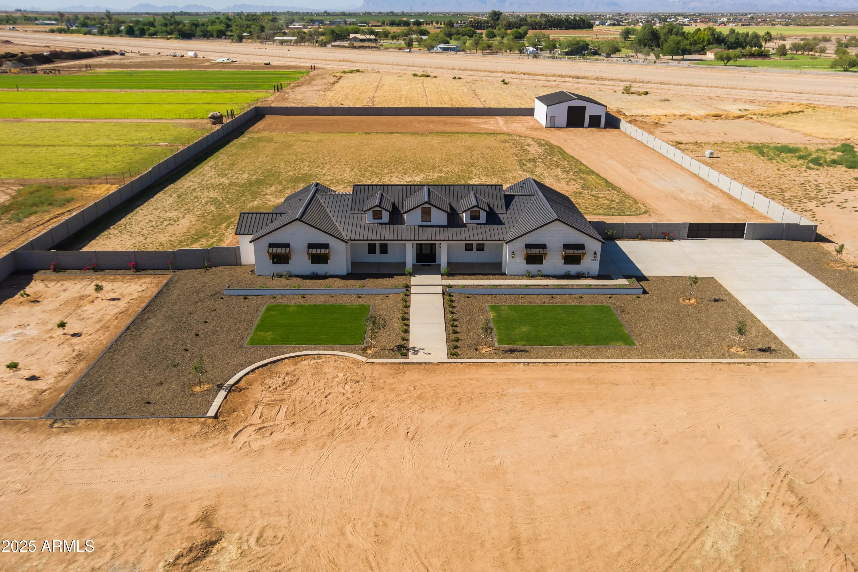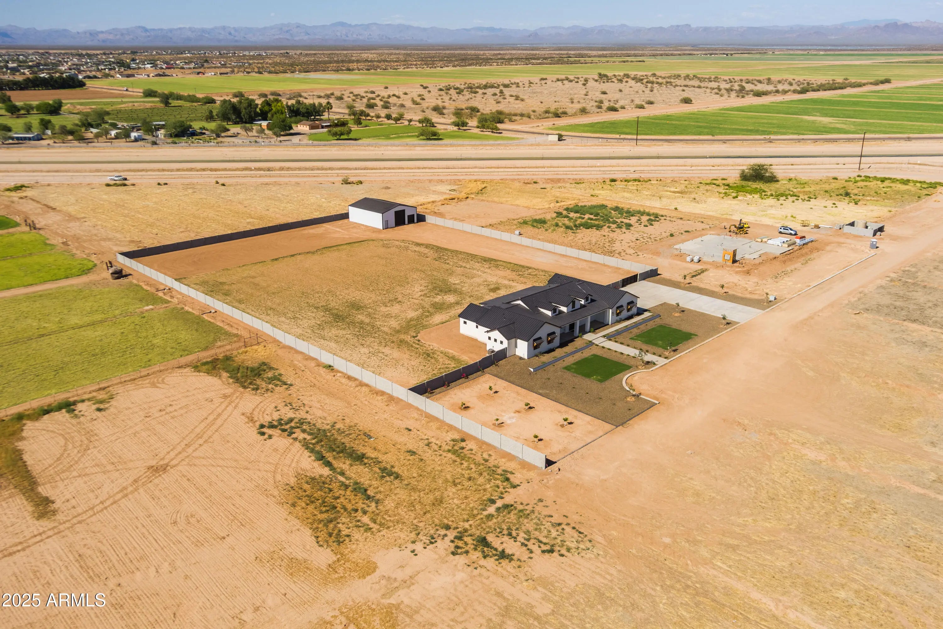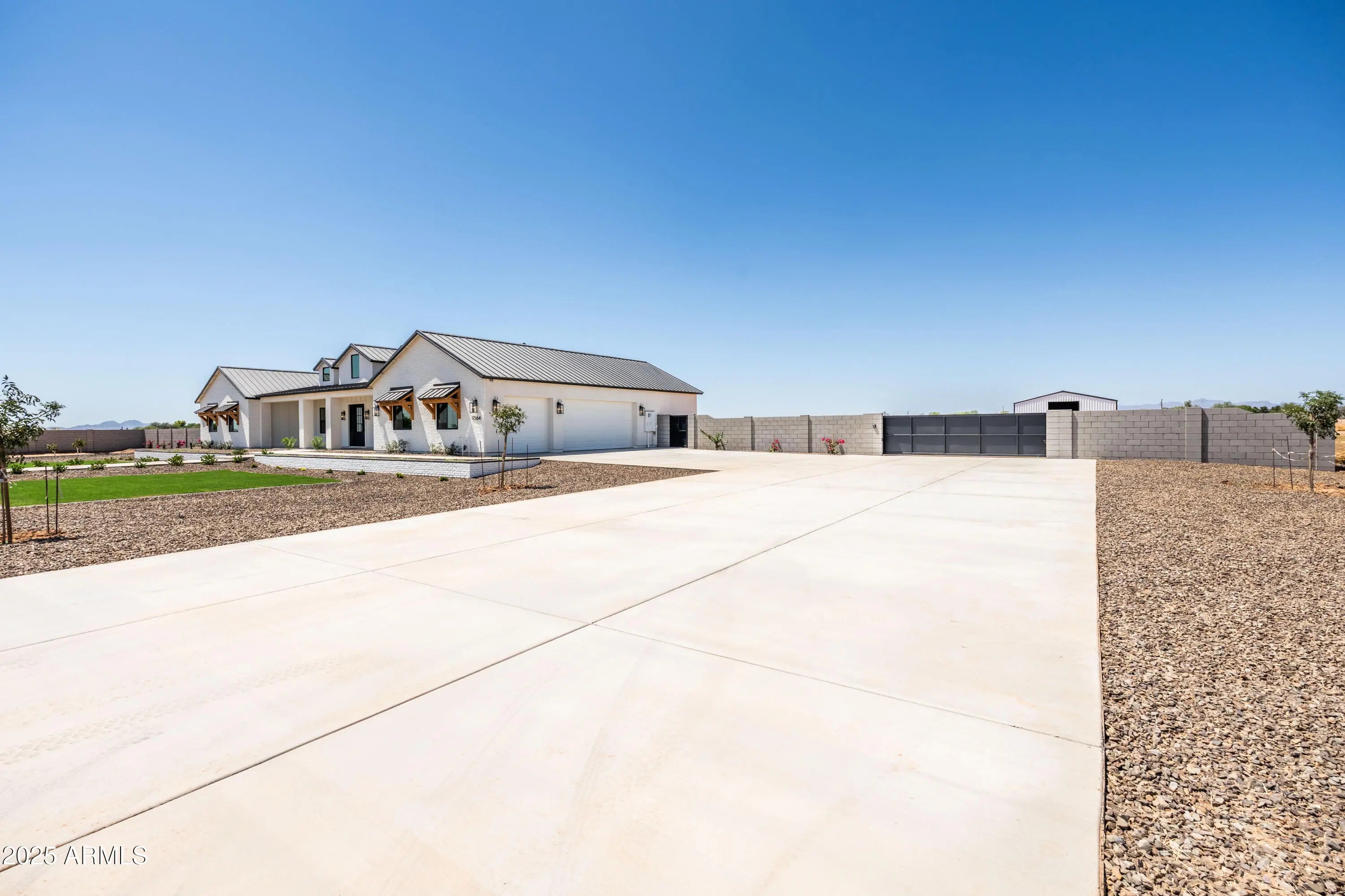 This is the one you've been waiting for - custom new construction on 2.5 acres with space, style, and substance. This 3,315 sf single-story home blends thoughtful craftsmanship with modern design, featuring 4 spacious bedrooms, 3 bathrooms, and an open-concept layout built for comfort and connection. Step inside and you'll immediately feel the difference—1' x 5' wood-look plank tile throughout, custom crown molding and upgraded trim at every turn, and an accordion-style patio door that opens wide to a scenic desert backdrop. The living room is anchored by a sleek fireplace and custom bookshelf, while the chef-inspired kitchen is the heart of the home with 42'' cabinetry with soft-close and dovetail drawers, stainless steel appliances, electric cooktop farmhouse apron sink, a large waterfall edge island, crisp quartz countertops and R/O system. Built with longevity and efficiency in mind, the home features spray foam insulation, 2"x6" framing (interior and exterior), 16" on-center construction, synthetic stucco, a durable metal roof system, and is electric car ready. The oversized 3-car garage includes extended depth and epoxy floors, perfect for storage or hobbies. Step outside and you'll appreciate the fully enclosed property, surrounded by a block wall with a 20' rolling automatic gate. The 2,000 square foot detached shop with a 14' door is a dream setup for a car enthusiast, horse owners, small business or anyone needing serious space. Front landscaping is already complete, and the entire property is on irrigation. And SAVE money with low well water bills! Location matters and this one is ideally situated just one mile from the planned Hwy 24 expansion, offering convenience without sacrificing the peaceful, open feel this property provides. The ideal buyer will love the space, freedom and flexibility this home offers whether you're looking to spread out, store your toys, or simply enjoy room to breathe.