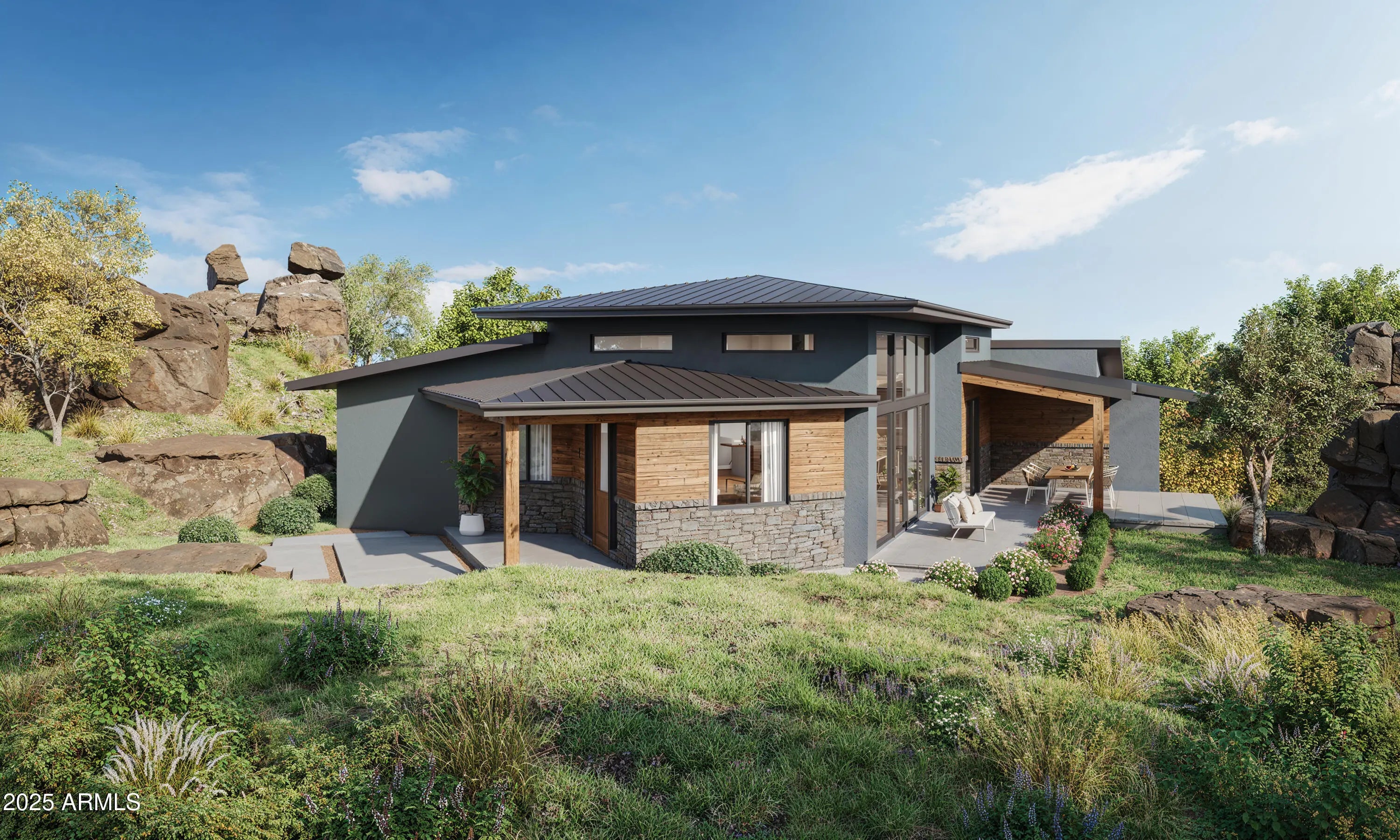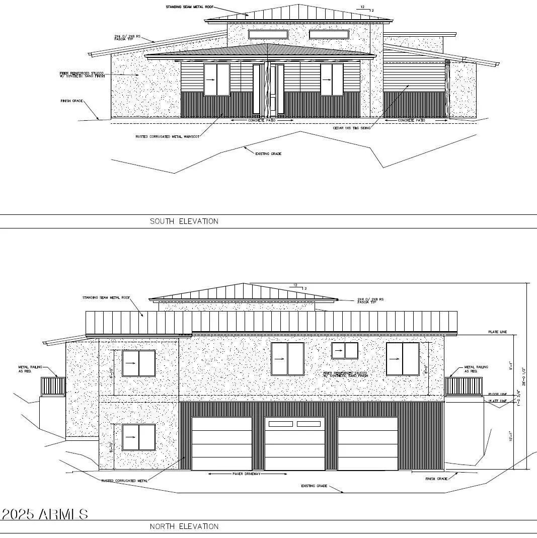 Vacant land BUILD TO SUIT. Concept plans ~3000sqft 4 bd/2.5ba home w/ 6 car garage in Arizona's Garden of the Gods. FEATURES INCLUDE: ~2500 sq ft single level living - 4 bd & 2.5 bath with an optimum split floor plan layout and great room with distinct space separation and grand 12-14 ft ceilings ~500 sq ft garage floor flex room for private gym/spa, workshop, speakeasy/wine room, craft room, etc. with independent HVAC unit -6 car garage (3 tandem stalls ~1720sqft) -Front guest entrance through a private slot canyon -Option to modify design, to add 3rd full bath; -3 car garage +~500sq ft or +3 car garage to 9 and -~500 sq ft -Huge storefront style windows bring the outside in & provide winter ''passive solar'' -Home completely hidden from the street Exclusive community in a hidden and historic Prescott location known as Arizona's Garden of the Gods features community pool, private trails leading to 1300-acres of open space, gated with access to full utilities. Don't settle for a SPEC HOME when you can have TOTALLY CUSTOM BUILT TO SUIT high-quality luxury for the same price. The experienced team of builders will work to turn your dream home into a reality or just buy the land and build when you are ready. No minimum build time. -Elevated foundation provides distant rock views of the Dells -Orientation provides complete privacy in Master bedroom, great room, kitchen and backyard -TOO MANY OTHER FEATURES TO LIST, but some including: pre-wired for Level 2 EV charger, pre-wired and plumbed for natural gas whole house backup generator, pre-wired for Ethernet, large eaves protect house and reduce maintenance, standing seam metal roof, massive kitchen island, separate formal dining area off kitchen with private "coffee" patio, large double sided natural gas fireplace separates the great room from kitchen, large covered patio with natural gas for BBQ / firepit, hot water circulator, and more. Although high end finishes have been designer selected, these can be easily modified at this phase. Structural / architectural changes can also be arranged with the builder as desired, such as a larger flex room or larger garage, additional full bathroom, etc. Foundation preparation is nearly complete including grading permits issued, surveys, soil testing, utilities run from street, chipping/blasting rock removal excavation, and more.