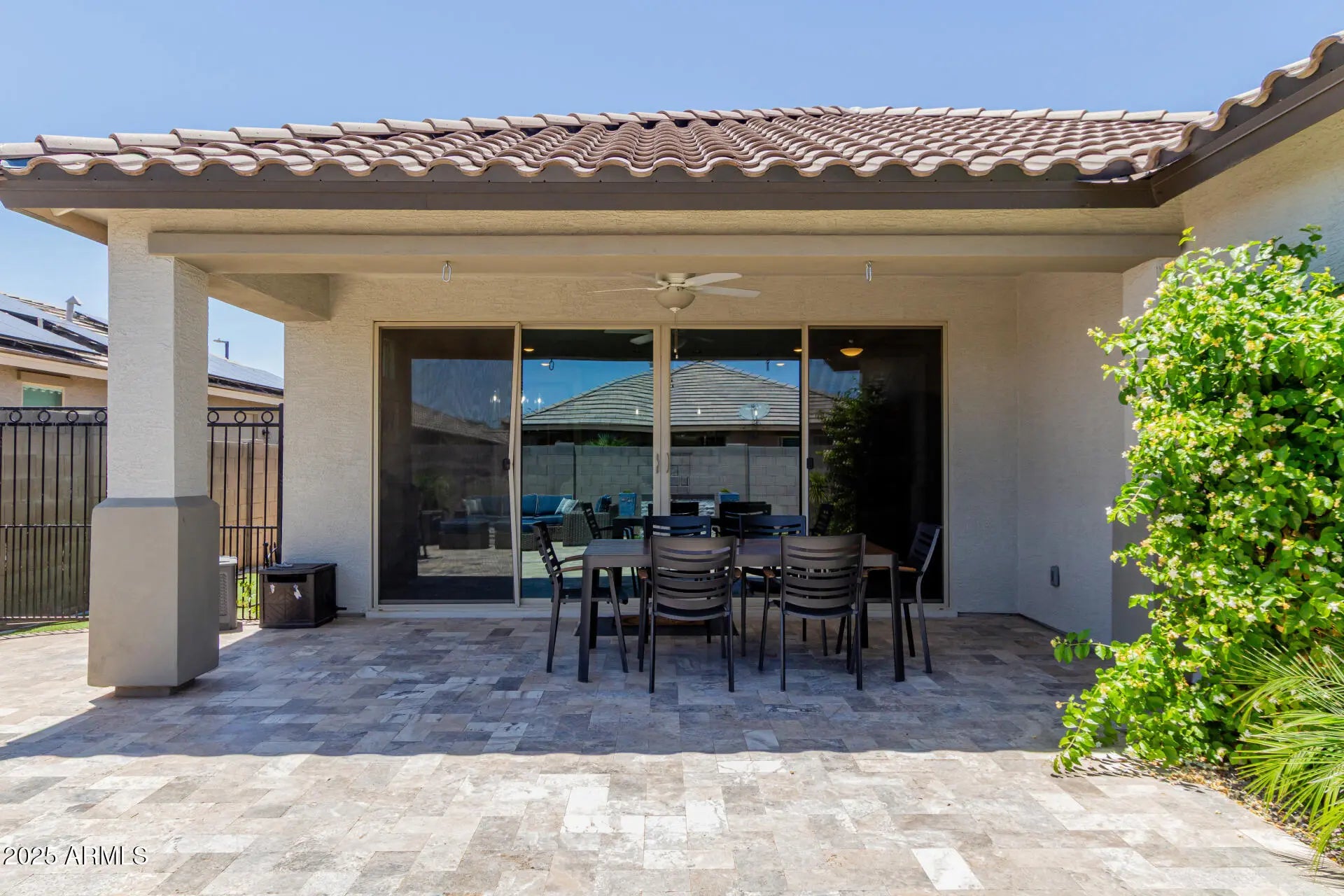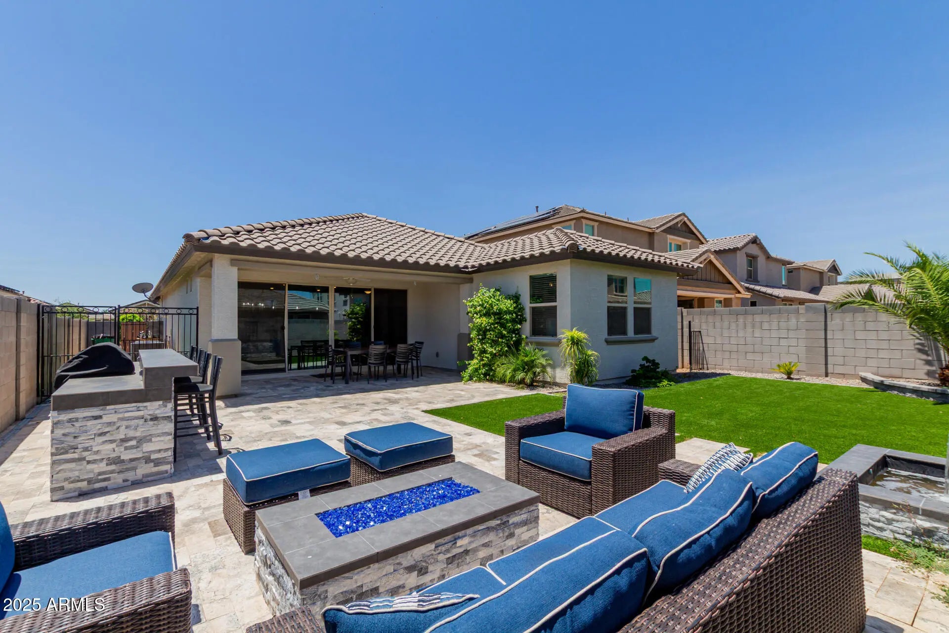 Own this desirable, energy-efficient 3-br, 2.5ba home nestled in the Estrella Commons Community. Charming interior boasts tile flooring in high-traffic areas, neutral palette, and abundant natural light. Modern open floor plan offers multi-sliding glass doors that provide seamless indoor-outdoor living. Impeccable kitchen includes espresso cabinetry w/crown moulding, granite counters, a walk-in pantry, and a prep island w/a breakfast bar. Sizable primary bedroom comes w/a private ensuite w/dual sinks, a make-up desk, & a walk-in closet. Finally, the large backyard features a covered patio, paver seating, fire pit, and a built-in BBQ, perfect for relaxing or entertaining. Excellent Community amenities await. Near parks, restaurants, freeways and more! Don't miss