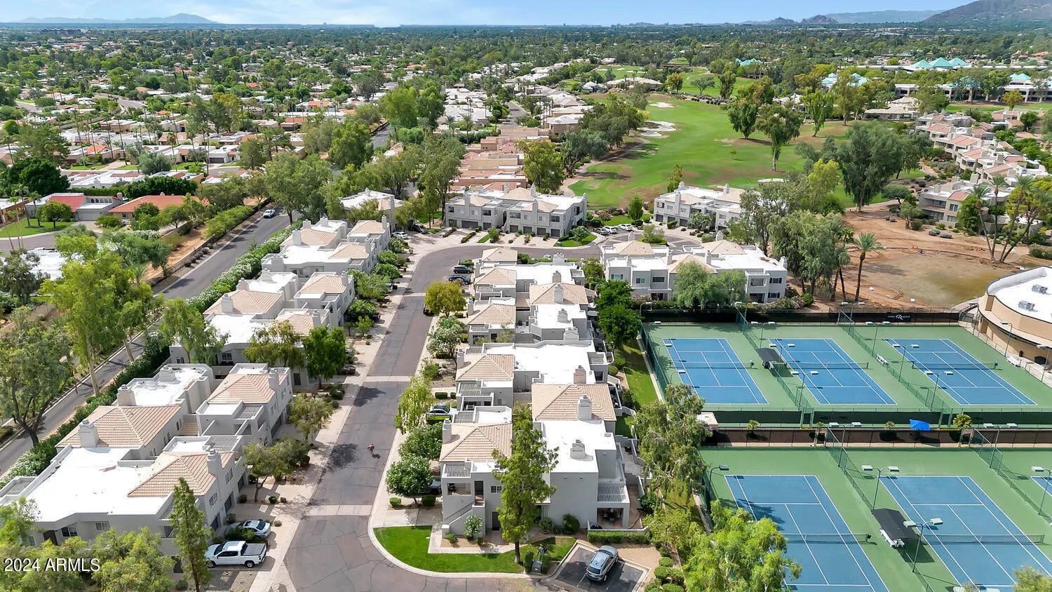 * The Courts at Gainey Ranch; Exclusive Guard-gated Community in Heart of Scottsdale * Sunset & Mountain Views from Great Room Picture Window & Balconies; Open Layout is Light & Bright Featuring Updated Kitchen, Baths, Lighting/Fans, Custom Shades, Security/Screen Doors, Trex-style Deck off Great Room, Fireplace, Large Laundry Room with Full Sized Washer/Dryer, Private Garage with Storage, Private Balconies * Amenities include Tennis, Pickleball, Renovated Estate Club w/ State of the art Fitness Center, Rec/Entertainment, Indoor/Outdoor Bar, Olympic-sized Heated Pool & Spa; Tree-lined Paths & Park, Additional Private Courts Community Heated Pool & Spa steps away * 24/7 Security, Perfect for your Lock & Leave Lifestyle * HOA covers almost everything * Don't miss it! *