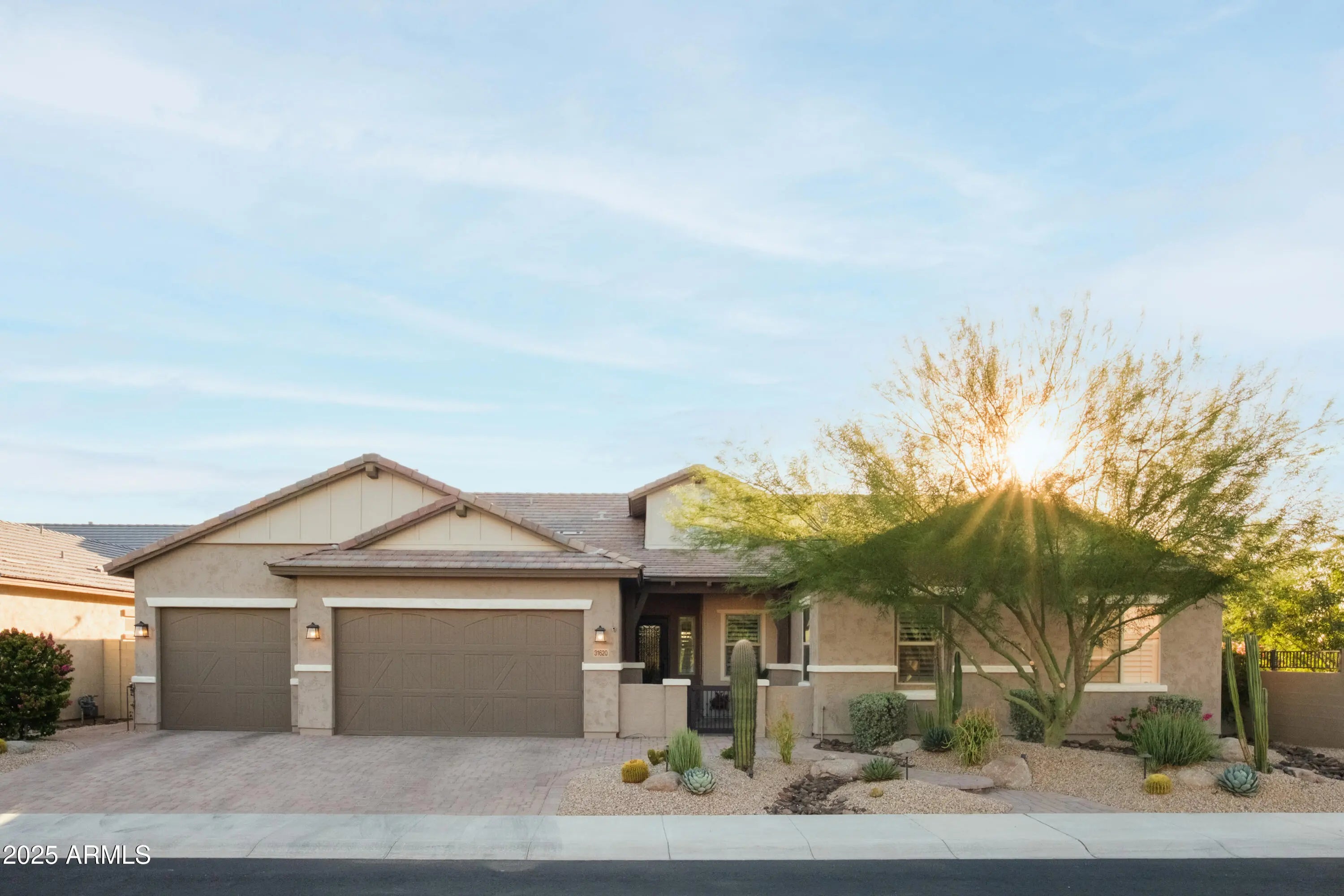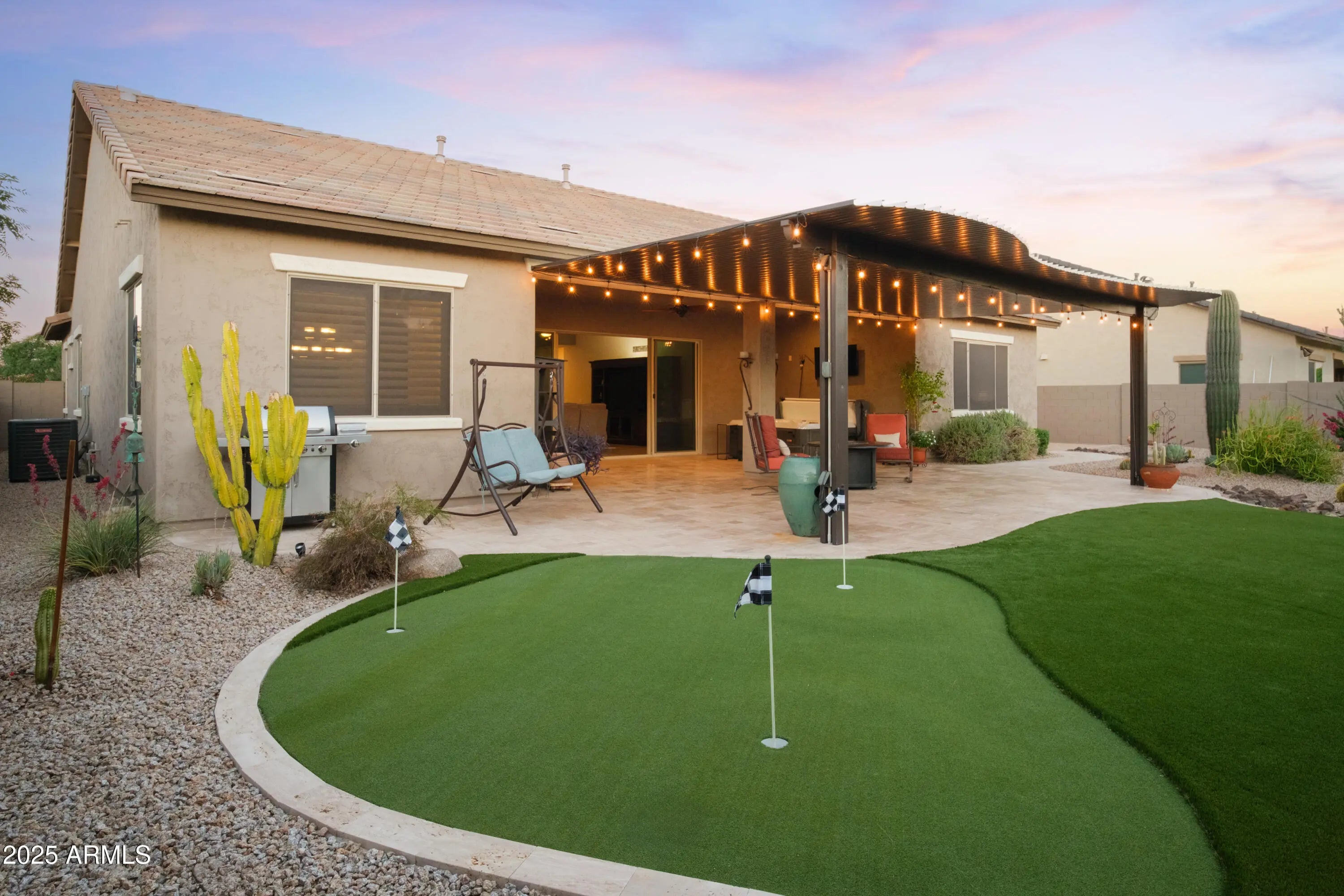 Desert Paradise Awaits! Indulge in sensory bliss in the 2020-built masterpiece nestled in Cave Creeks coveted, upscale La Placia- a boutique gated haven of just 30 homes. At 2806 livable sq ft, enjoy 4 bedrooms, 2.5 baths, and a 4-car tandem garage for vehicles. storage or your dream workshop. The entertainer's kitchen, with its grand island, flows into an expansive living space. Oversized French doors reveal a resort backyard: custom putting green, bubbling Jacuzzi, twinkling ambient lights, colorful desert flora and an extended covered patio for crackling fireside nights and mesmerizing sunsets. Upgraded to perfection, this home dazzles every sense. Your must-see retreat!