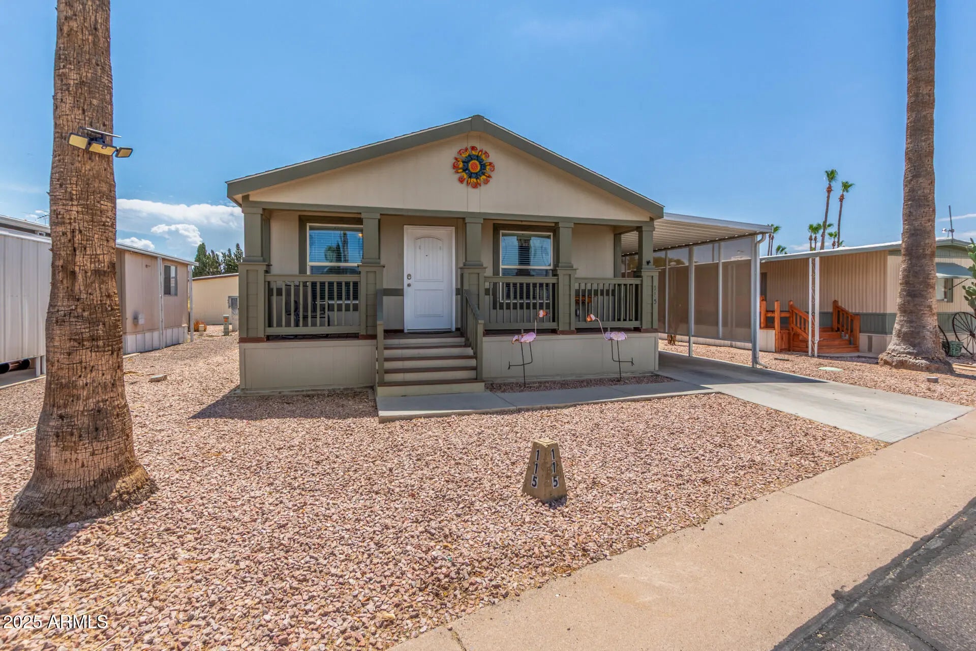 This beautiful 2/2, double-wide, manufactured home, built in 2019, is one of the newest homes in the park—offering peace of mind, modern convenience, and low maintenance. Located in a well-kept 55+ community, it's just steps from extra guest parking, the clubhouse & sparkling pool—perfect for meeting people & enjoying some sun-soaked relaxation. From the moment you arrive, you'll be charmed by the adorable front porch and immaculate curb appeal. A covered carport protects your car & home from the AZ sun, and a ramp adds easy accessibility. Inside, the neutral tones & move-in ready condition make this home a breeze to personalize. All appliances are included! The open-concept floor plan maximizes your space, while the primary suite features a walk-in shower for added comfort. Whether you're downsizing, looking for a winter escape, or planning your permanent retirement haven, this double-wide home checks all the boxes. Don't miss your chance to enjoy AZ's unbeatable winter weather while others are shoveling snow! This home is readyall it needs is you!