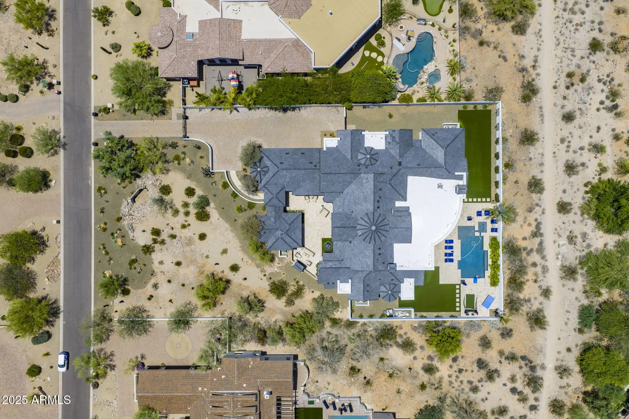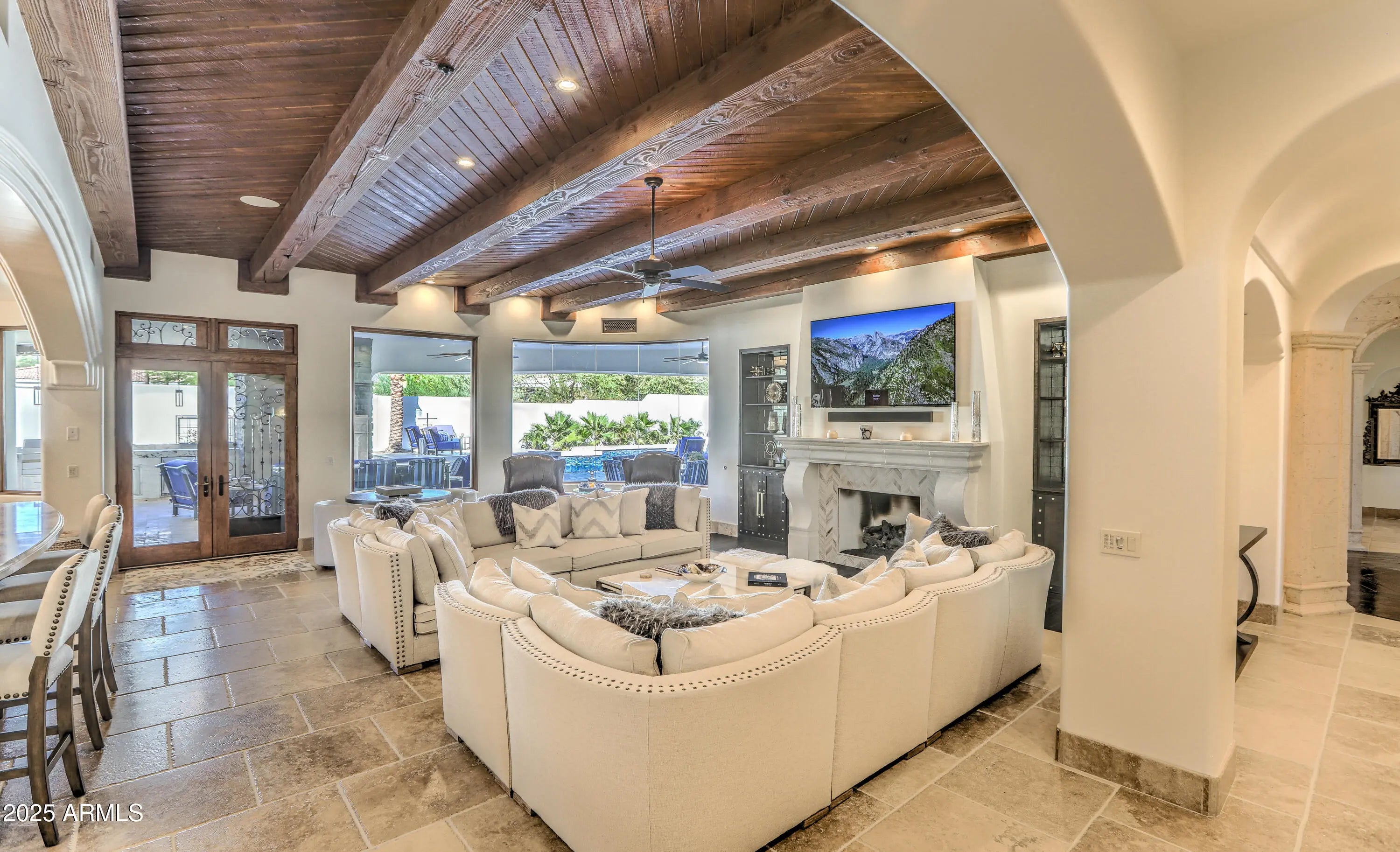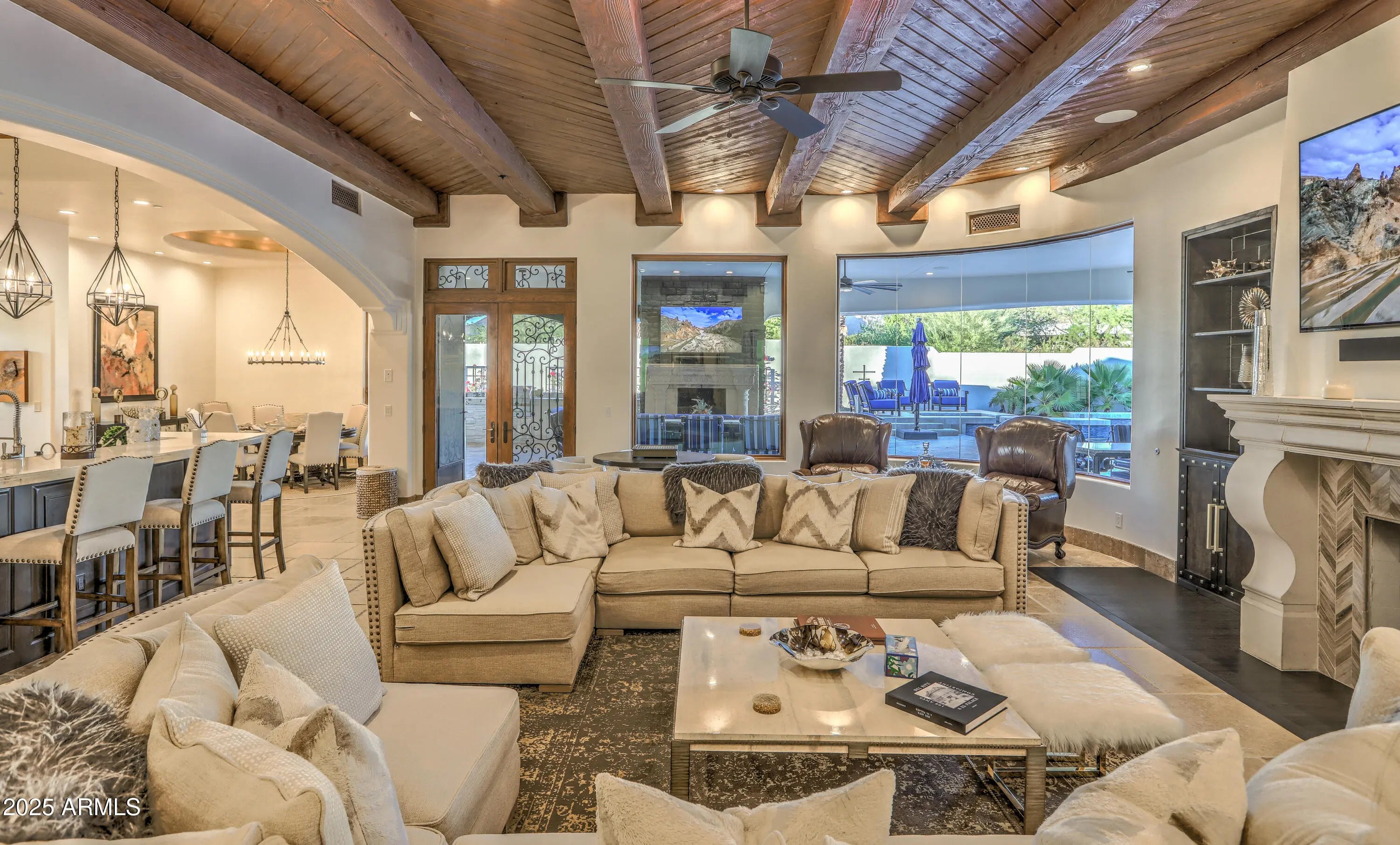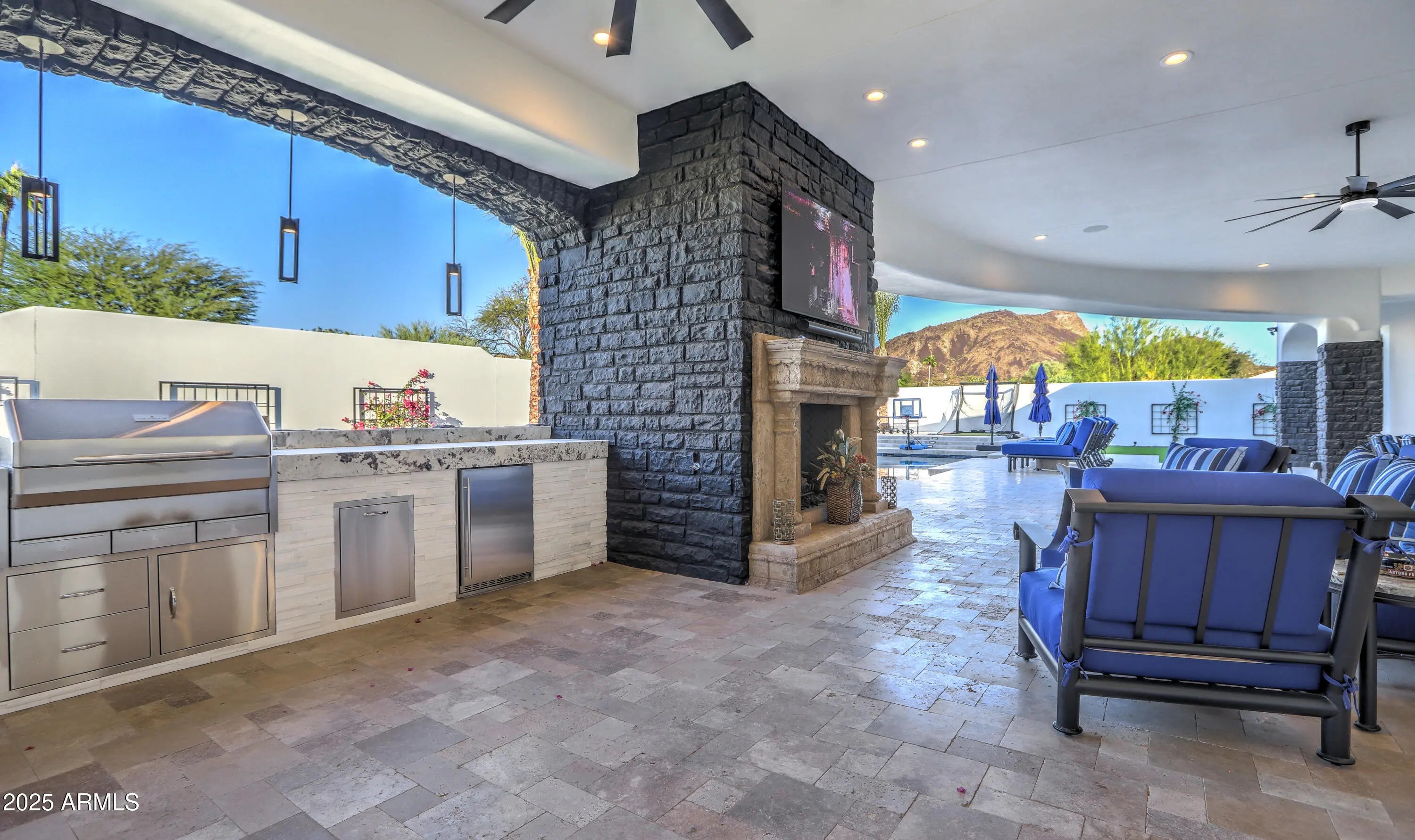 Behind a private gated entry driveway on quiet cul-de-sac this no-HOA spectacular estate has been fully transformed, offering opportunity to own a designer-finished home inside and out that lives like new. This property features more than $1.1 million in recent upgrades, including private travertine outdoor living with water/fire feature, 6 outdoor sound systems, 12-foot backyard walls sculpted to maximize privacy & mountain views, pool/spa, turf & hardscape, huge covered patio, multiple TVs, surround sound, fireplaces, and outdoor kitchen. A designer home w/ full chef's kitchen, soaring architectural ceilings, rotundas, curated finishes, sanctuary primary suite w/ 2 sitting areas, dual-sided fireplace, 2 generous walk-in closets, dual water closets, and a spa-caliber bath w/ sauna & gym. This property truly is architectural brilliance meeting turnkey luxury in a Scottsdale Mountain view estate. This spectacular estate has been fully transformed, offering the rare opportunity to own a fully designer-finished home and outdoor living spaces. Set against a breathtaking 360° backdrop of rugged mountain peaks and brilliant desert skies, this is where timeless design meets effortless resort living. This property features a newly refinished travertine courtyard with its own full-size gated entry, a fireplace, a unique water/fire feature and a full outdoor sound system. The courtyard leads to a dramatic arched entry, where a custom over-sized iron door opens into interiors defined by soaring beamed and barrel ceilings, two rotundas, rich textures, and curated finishes. A Restoration Hardware-featured fireplace anchors the formal living room, setting the tone for spaces that are as architectural as they are welcoming. At the heart of the home, a custom chef's kitchen stuns with dual marble-topped islands, glazed cabinetry, a mother-of-pearl backsplash, and top-of-the-line Wolf, and Sub-Zero appliances, w/ a separate bar and wine room in the family room. Whether hosting a crowd or cooking solo, every detail is designed to elevate the everyday. The primary suite is a sanctuary of scale and serenity. Enjoy a private sitting area, dual-sided fireplace, two generous walk-in closets, dual water closets, and a spa-caliber bath complete with sauna and fitness room. Each guest suite offers its own luxe ensuite bath and walk-in closet, while the detached casitaw/ kitchenette, full bath, and walk-in closetwelcomes guests or extended family with style and privacy. Modern luxury is woven into every corner: an upgraded Savant smart home system integrates lighting, sound, HVAC and AV throughout. Ten ultra-thin Sony 4K TVs, Sonos soundbars, architectural speakers throughout the entire house and exterior, and a newly upgraded 8K projector in the custom home theater deliver an immersive entertainment experience. A commercial-grade Cox Gigabit hardwired WI-FI internet system ensures seamless connectivity. The resort-caliber backyard feels like a private retreat, complete w/ a newly resurfaced Pebble Tec pool and spa, brand-new turf and hardscape, a dramatic outdoor fireplace, and a newly outfitted kitchen with built-in grillall set beneath a covered travertine patio with new ceiling fans and a surround sound TV system. Major enhancements include a complete reimagination of the entire outdoor area of this 1-acre estate, enlarged car parking area, new gated driveway with connected walls for privacy and security, all-new exterior and interior paint, a new concrete tile roof with a 15-year warranty and all new flat roof w/ 12-year warranty, and five new HVAC systems, EV charging outlet in the garage, updated Savant system, new speakers and sound bars throughout, new theater AV equipment, newly imagined family room built-ins and fireplace, with updated lighting, cabinetry and countertops throughout. From sweeping views to sophisticated details, every inch of this property has been elevated. This is more than a homeit's a design-forward lifestyle and a rare opportunity to own one of the most refined and turnkey estates in the desert.