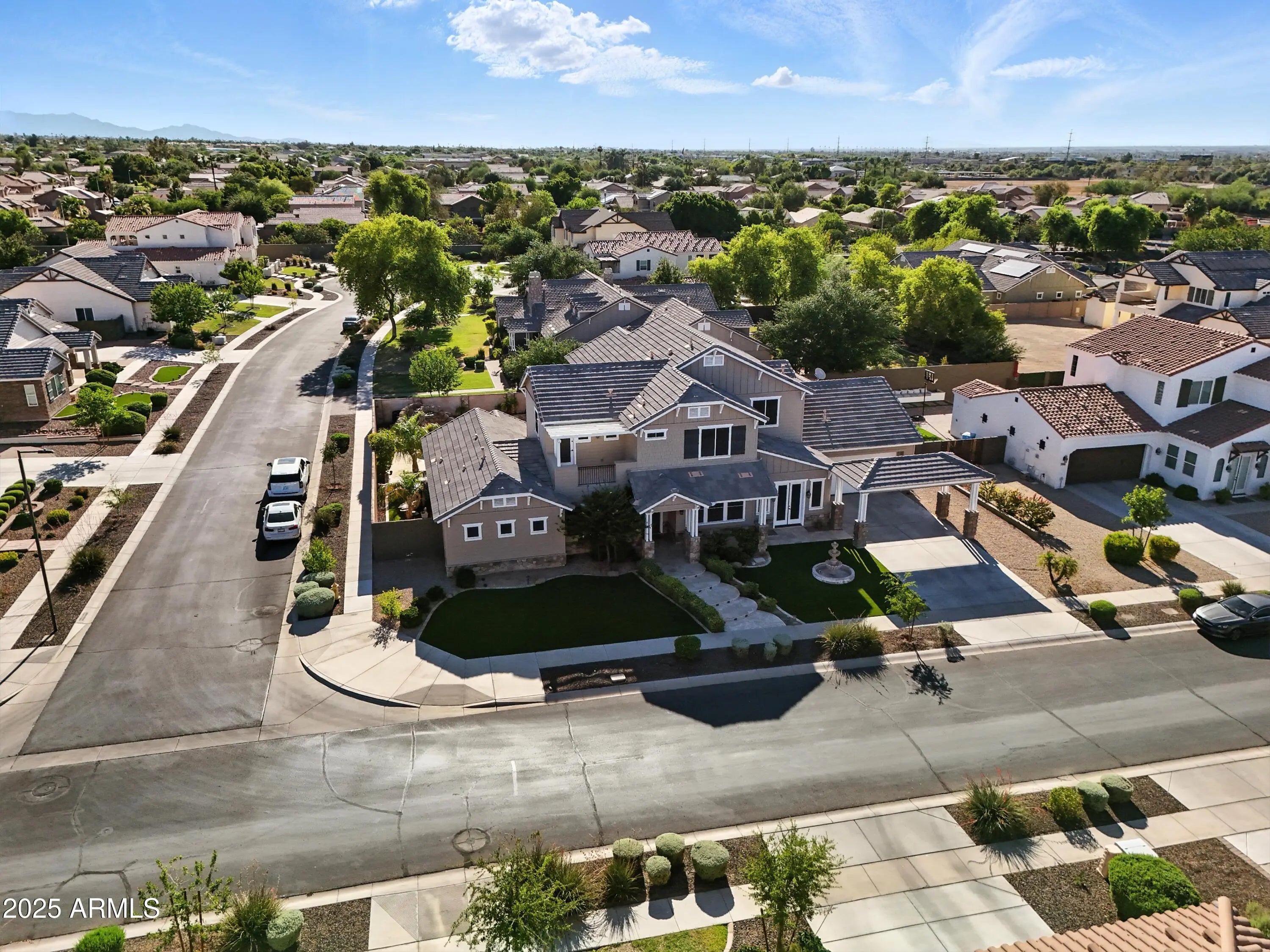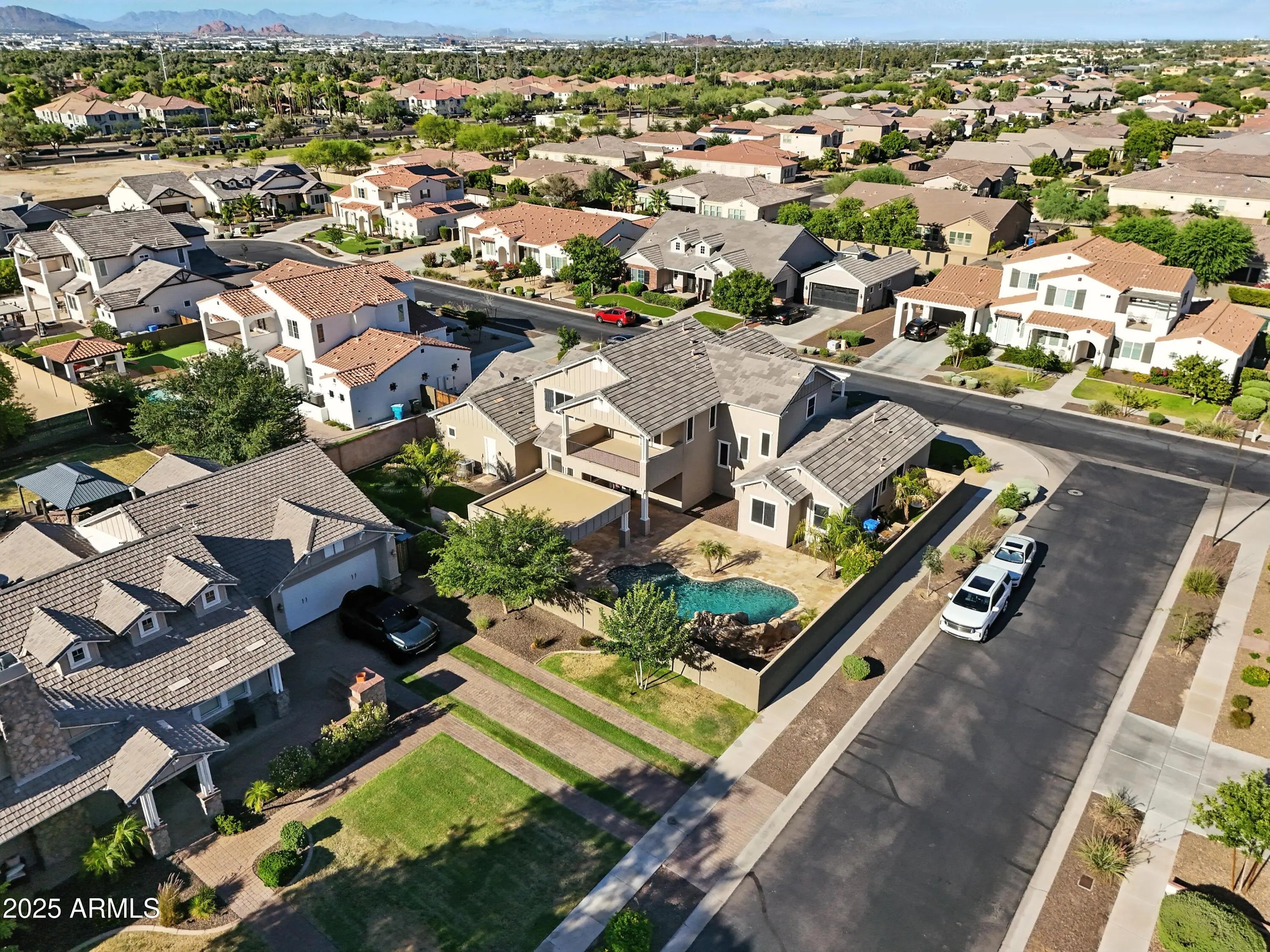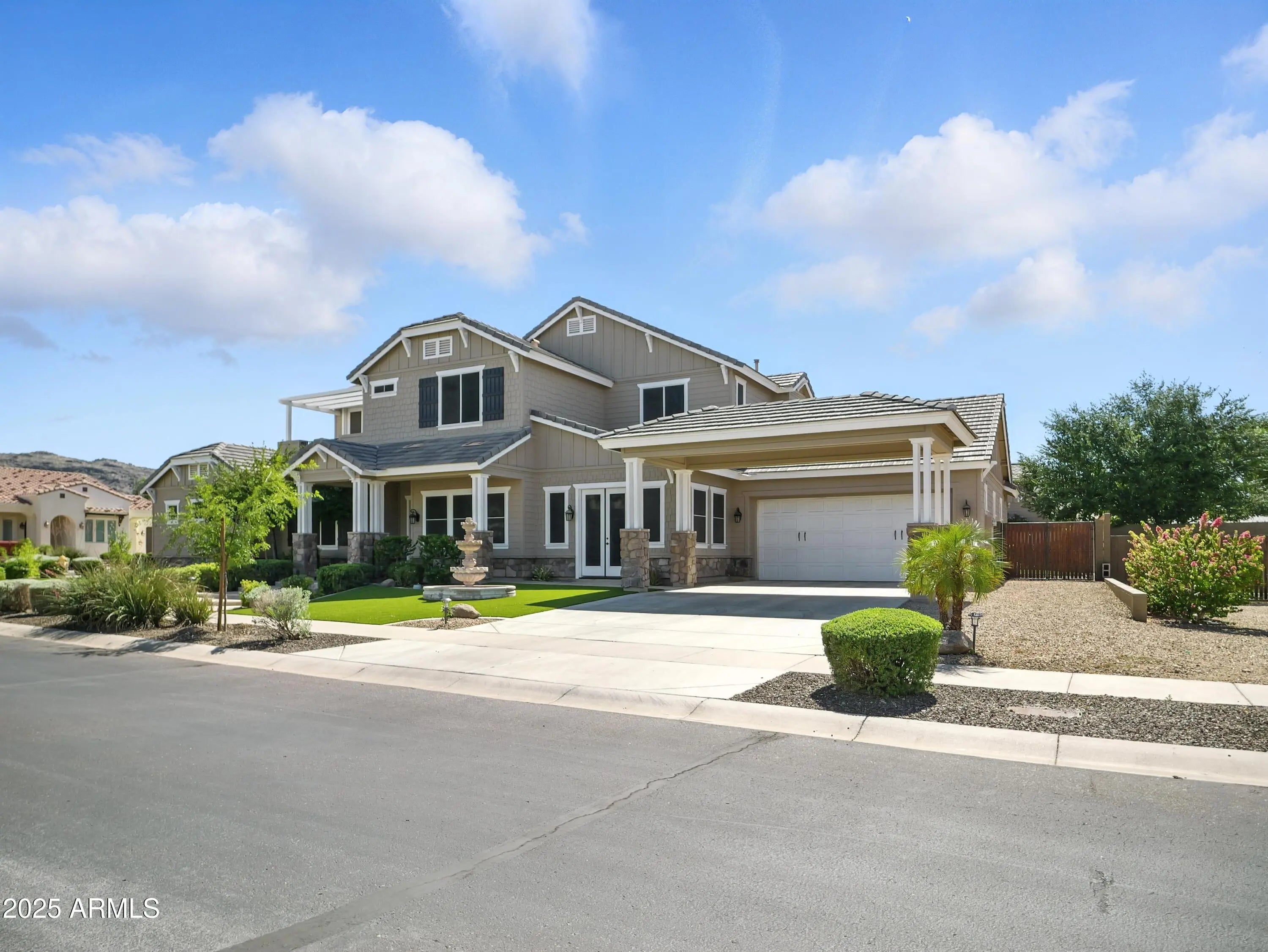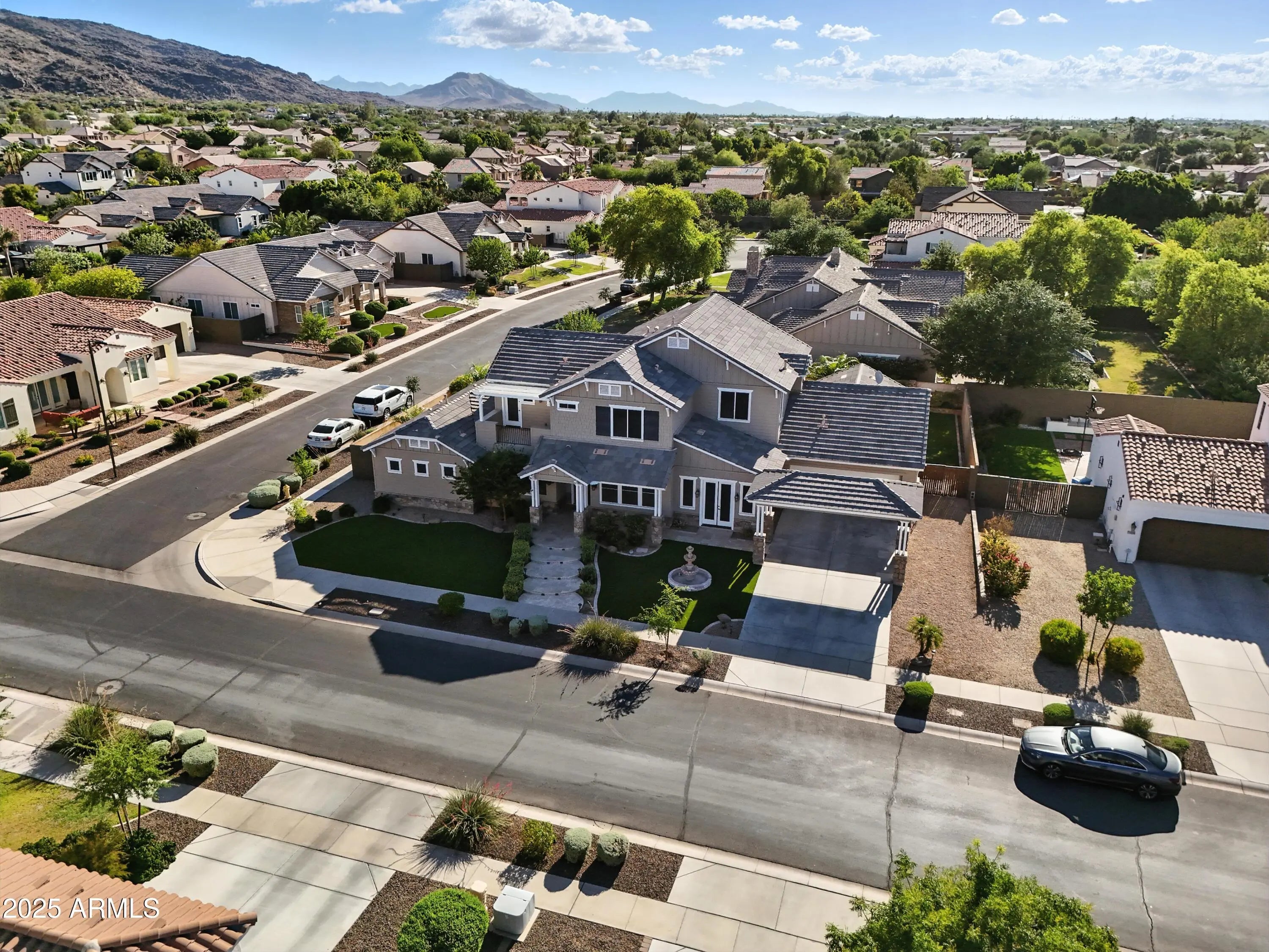 Experience the perfect blend of luxury, functionality, and design in this stunning 4,333 sq ft modern craftsman estate, perfectly situated on a premium corner lot in the highly sought-after gated community of Arboleda Ranch, an intimate enclave of only 31 custom homes offering an Arcadia-like charm in the heart of the East Valley. Built in 2012 and offered by its original owner, this 4-bedroom, 3 full bathroom, 2 half bathroom residence is a true showcase of quality craftsmanship and thoughtful design. Inside, you'll find soaring 11ft ceilings, smooth Venetian plaster finishes, and refined details throughout. The chef's kitchen features granite countertops, rich dark wood cabinetry with crown molding, and a custom stone-wrapped range hood, designed for both beauty and functionality. All bedrooms feature spacious walk-in closets, and the primary suite, located on the main level, offers a spa-like retreat with a walk-in glass shower. Every bathroom in the home has been finished with elegant marble walls and granite countertops, creating a cohesive, luxurious experience from top to bottom. Upstairs, two private balconies showcase breathtaking South Mountain views, while the backyard delivers a true resort experience complete with lush turf, outdoor travertine flooring, a sparkling pool, built-in BBQ island with stainless steel appliances, and a dedicated full outdoor bathroom for guests. Additional features include a 3-car tandem garage with built-in storage, a 2-car carport, and an RV gate. Located just minutes from Legacy Golf Resort, The Raven Golf Club, and Arizona Grand Resort, this one-of-a-kind estate delivers the ideal balance of luxury, privacy, and convenience in one of the East Valley's most exclusive gated communities.