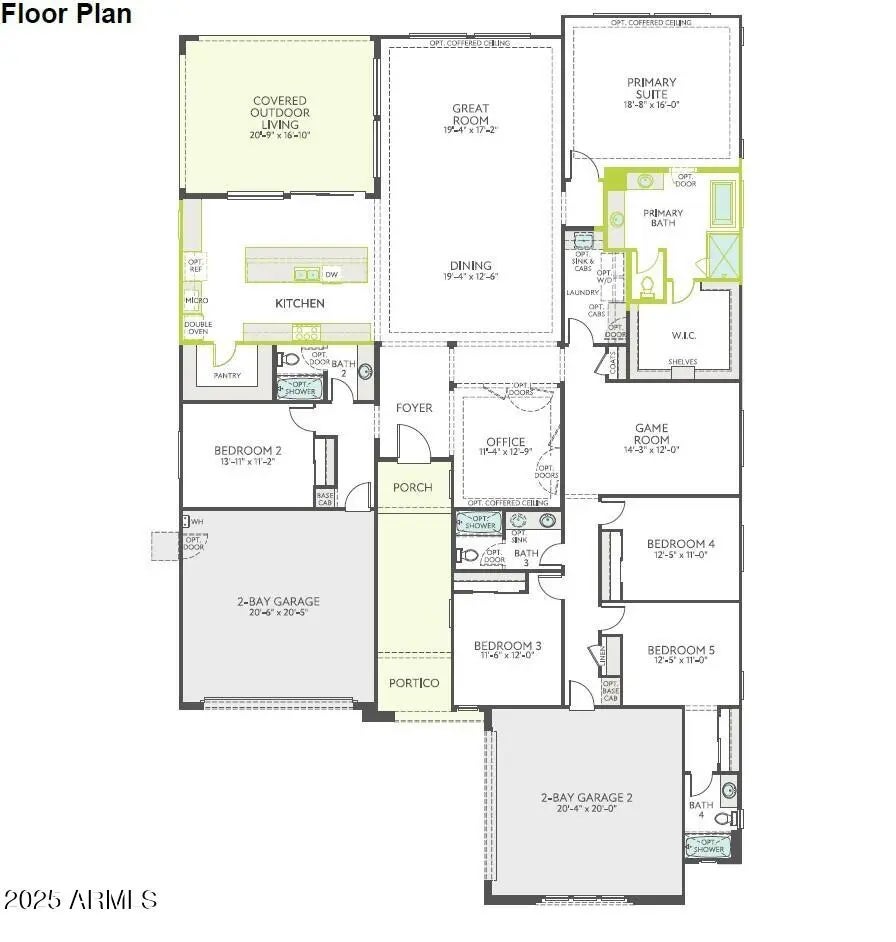 Beautiful, new, single-story home, loaded with designer selections and upgrades! The spacious 5 bedroom home also features 4 bathrooms, an office, game room, outdoor living spaces, a front loading 2-bay garage, a side loading 2-bay garage, and so much more! The kitchen, which is open to the great room and an extended dining area, boasts an Executive appliance package with a 36'' gas cooktop, double stacked kitchen cabinets, custom backsplash, and Della Terra Citrine Quartz countertops. Other special features include upgraded Benton Birch Quill cabinets, a spa bath and custom tile surrounds in the primary bath, smart home features, LEED certified, 12' ceilings in the kitchen, great room, and dining room, 18'' x 18'' tile flooring with carpet at the bedrooms, and pavers at the driveway.
