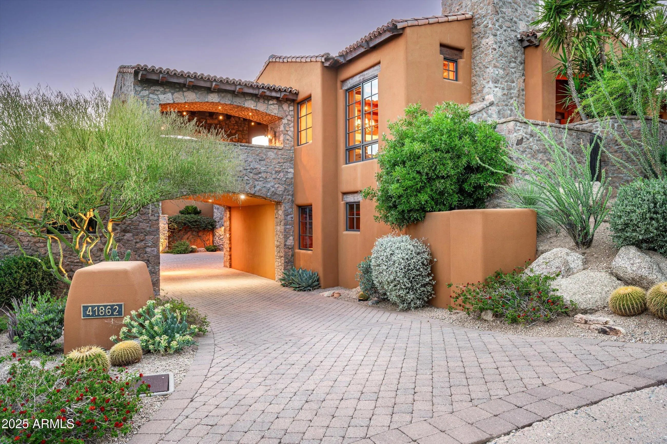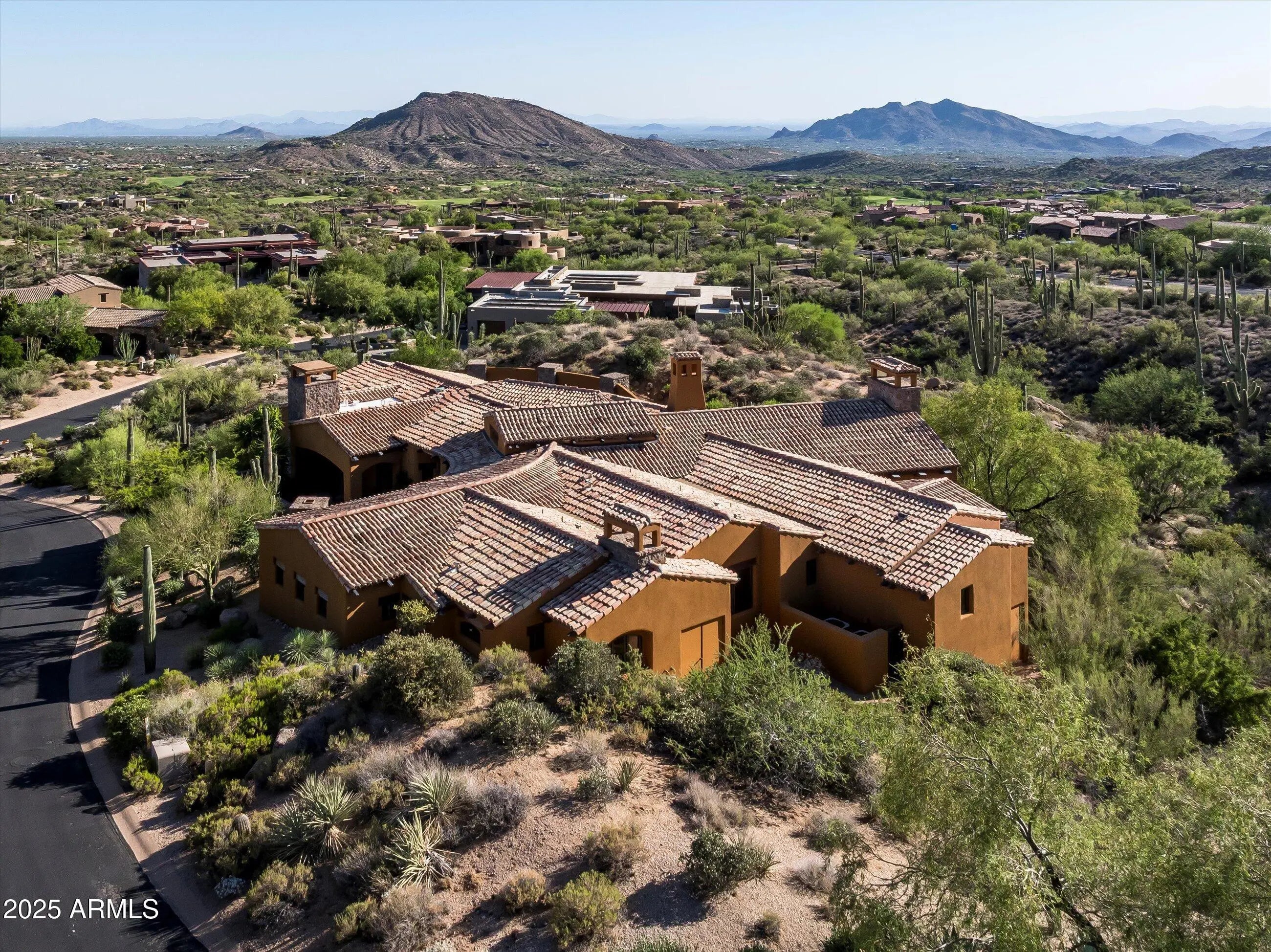 DESERT MOUNTAIN GOLF MEMBERSHIP AVAILABLE. Embrace a casual yet elegant resort lifestyle in the stunning Mediterranean hillside home in Village of Saguaro Forest within the prestigious guard-gated Desert Mountain Club in North Scottsdale, AZ. This home showcases the Lee Hutchison design with a floor plan that perfectly accommodates entertaining and family living in & out. The great room welcomes you to a gorgeous stone wall & Cantera fireplace, vaulted beamed ceilings and inviting bar. A raised grand dining room overlooks living room and valley views beyond. Chef's Kitchen and cozy Hearth room offer panoramic mountain & city views. Primary suite has its own private patio with fireplace. Game/Media Room can be 5th Bedroom w/en-suite bath. Pristine craftsmanship throughout.