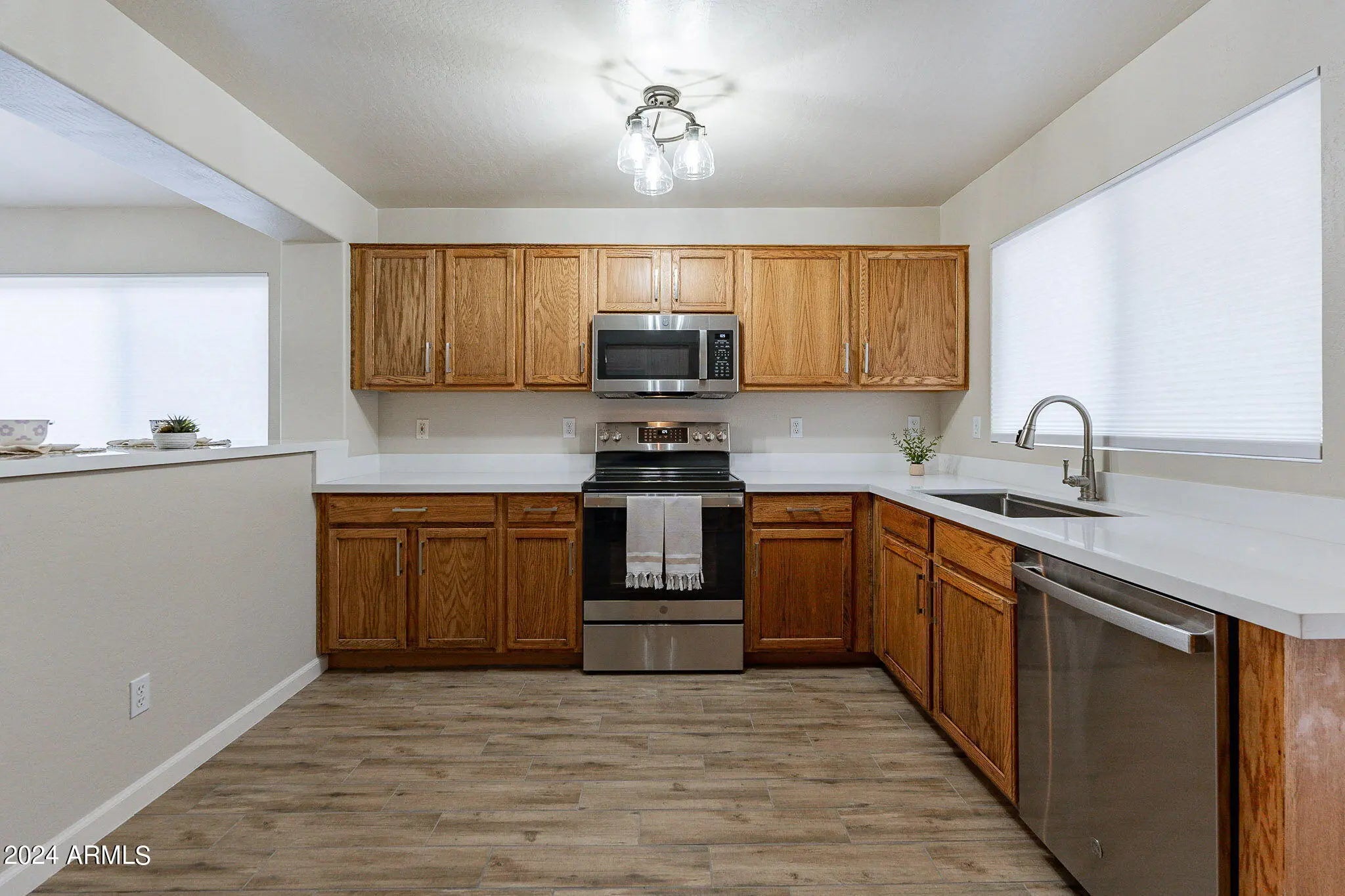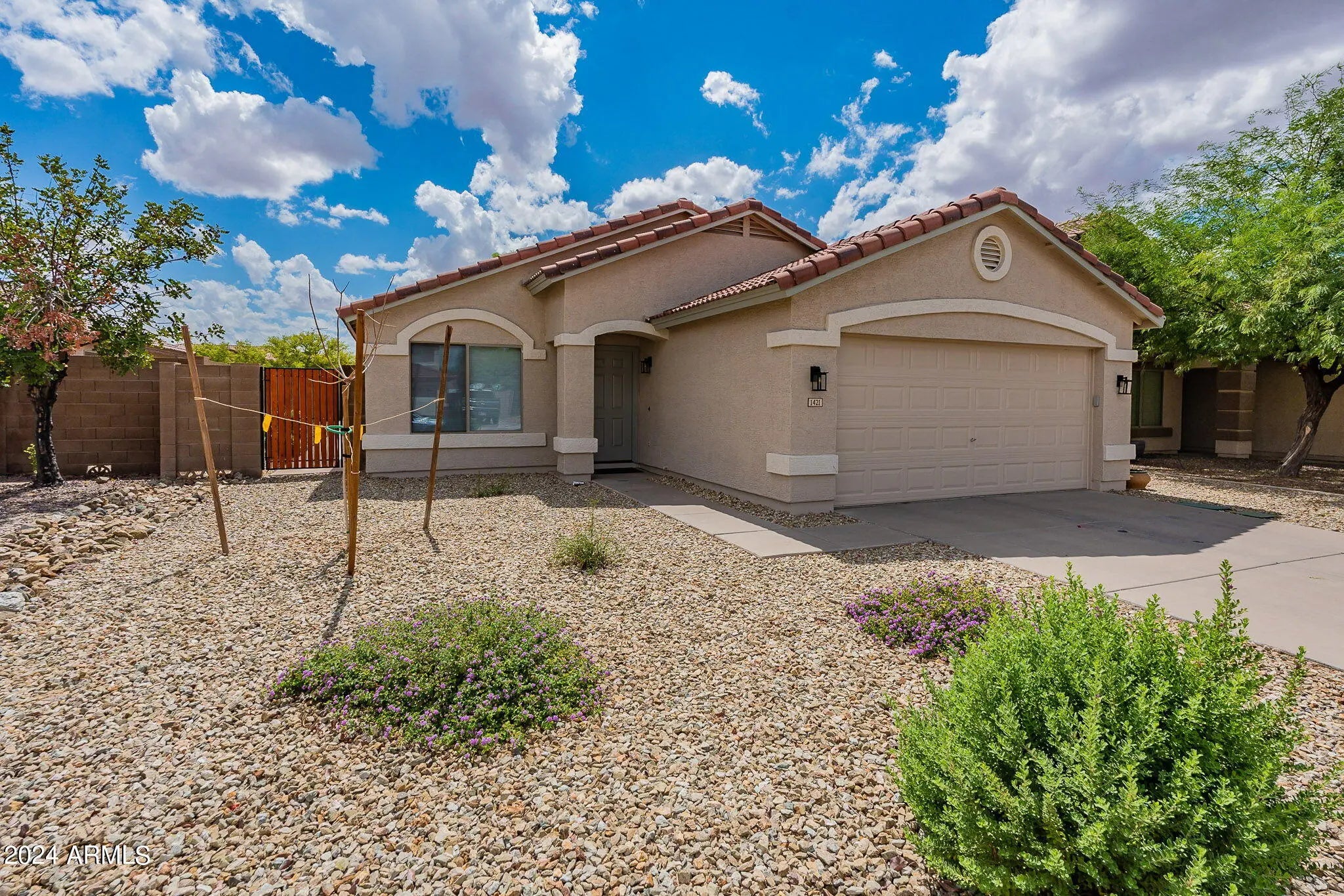 This beautifully updated home has been fully renovated inside and out in 2024. Featuring brand-new tile flooring throughout, fresh interior and exterior paint, updated landscaping, and modern upgrades at every turn. The kitchen boasts stainless steel appliances, quartz countertops, a stylish farm sink, and all-new light fixtures. Both bathrooms have been refreshed with new vanities, and the primary suite includes a stunning walk-in shower. A new heat pump ensures comfort and energy efficiency year-round. Enjoy outdoor living under the full-length covered patio in the private backyard—with no rear neighbors. Located on a quiet street in an established neighborhood, this home is just steps from the community park, playground, and mailbox. Don't miss this move-in ready gem—