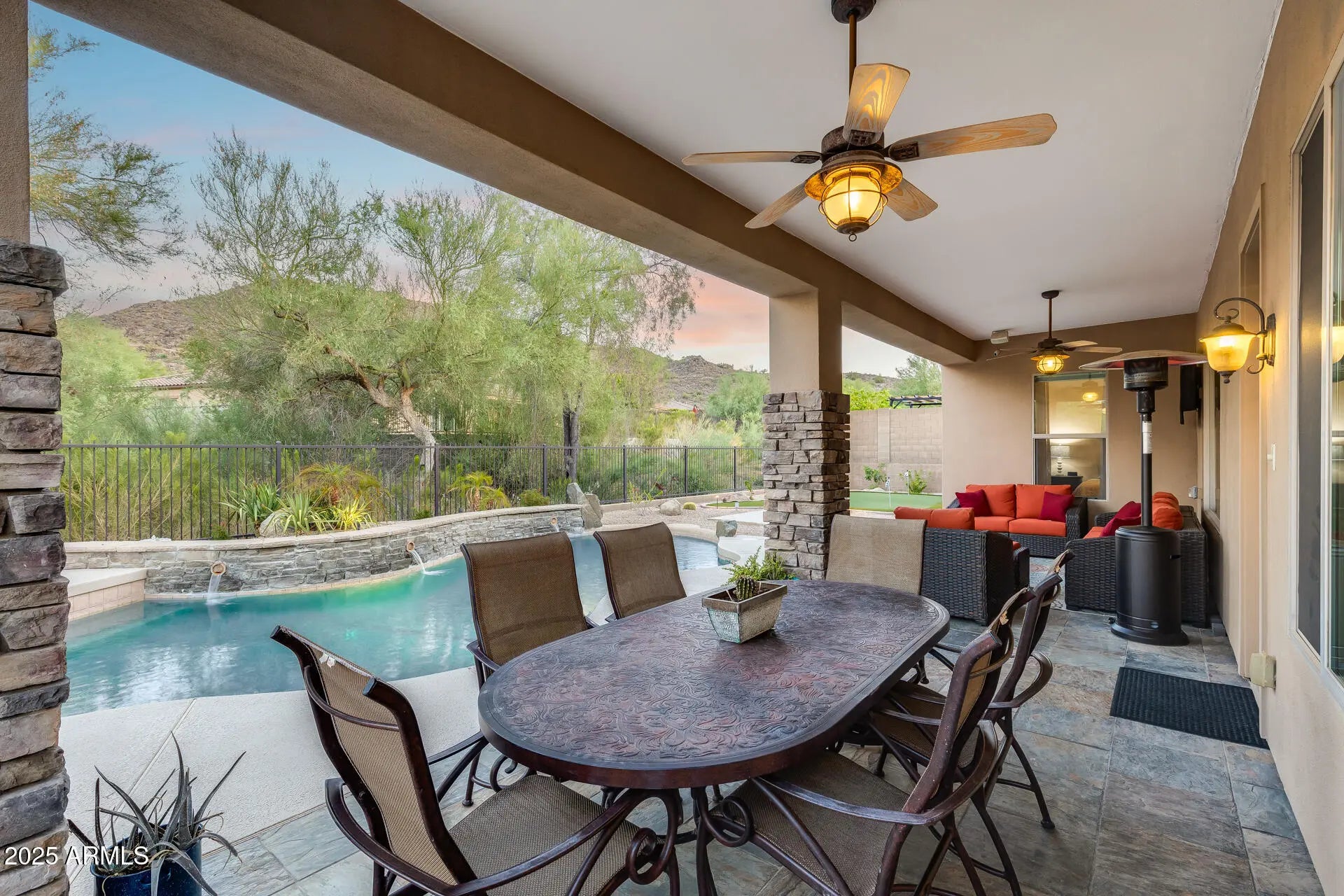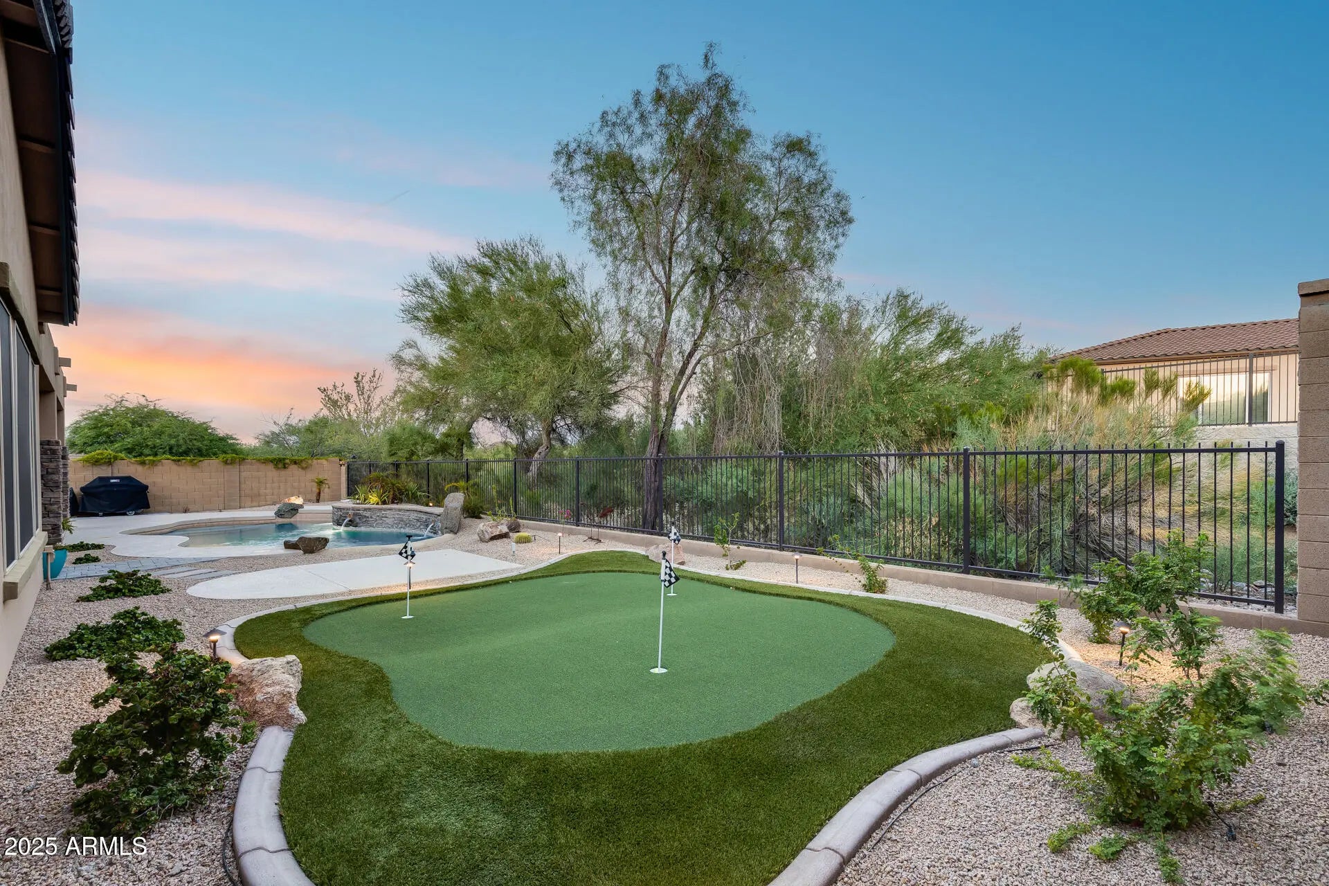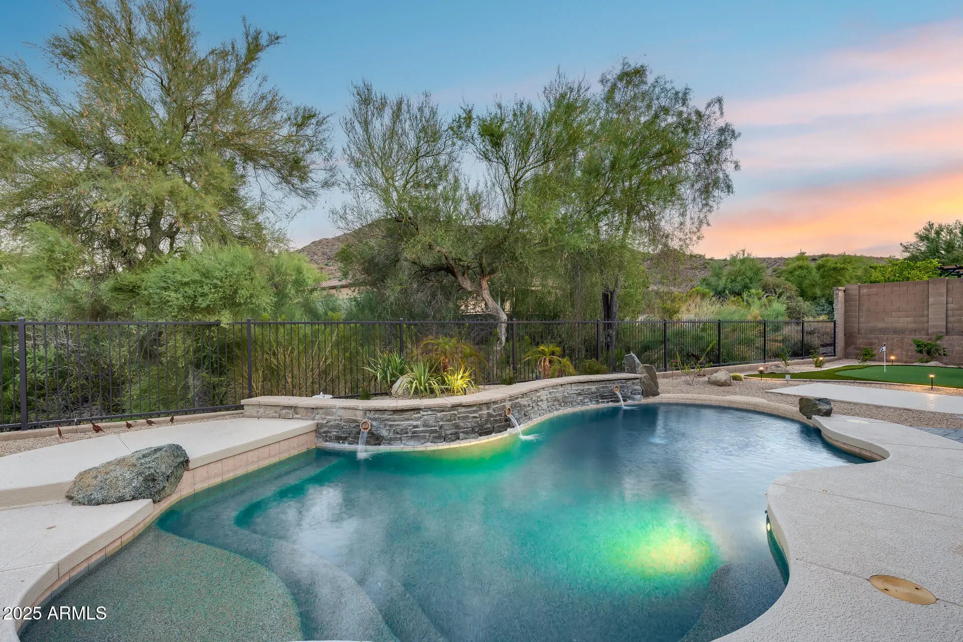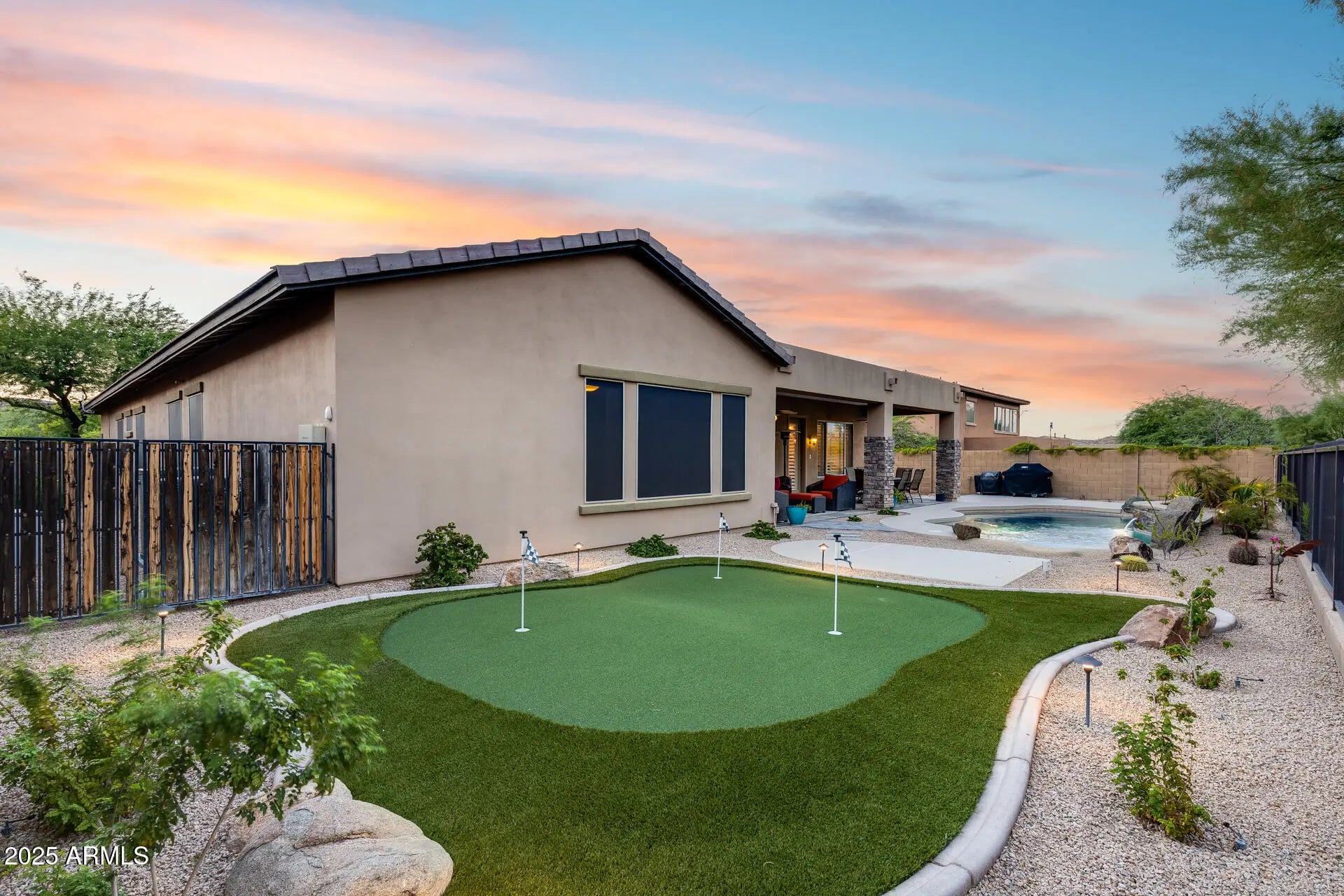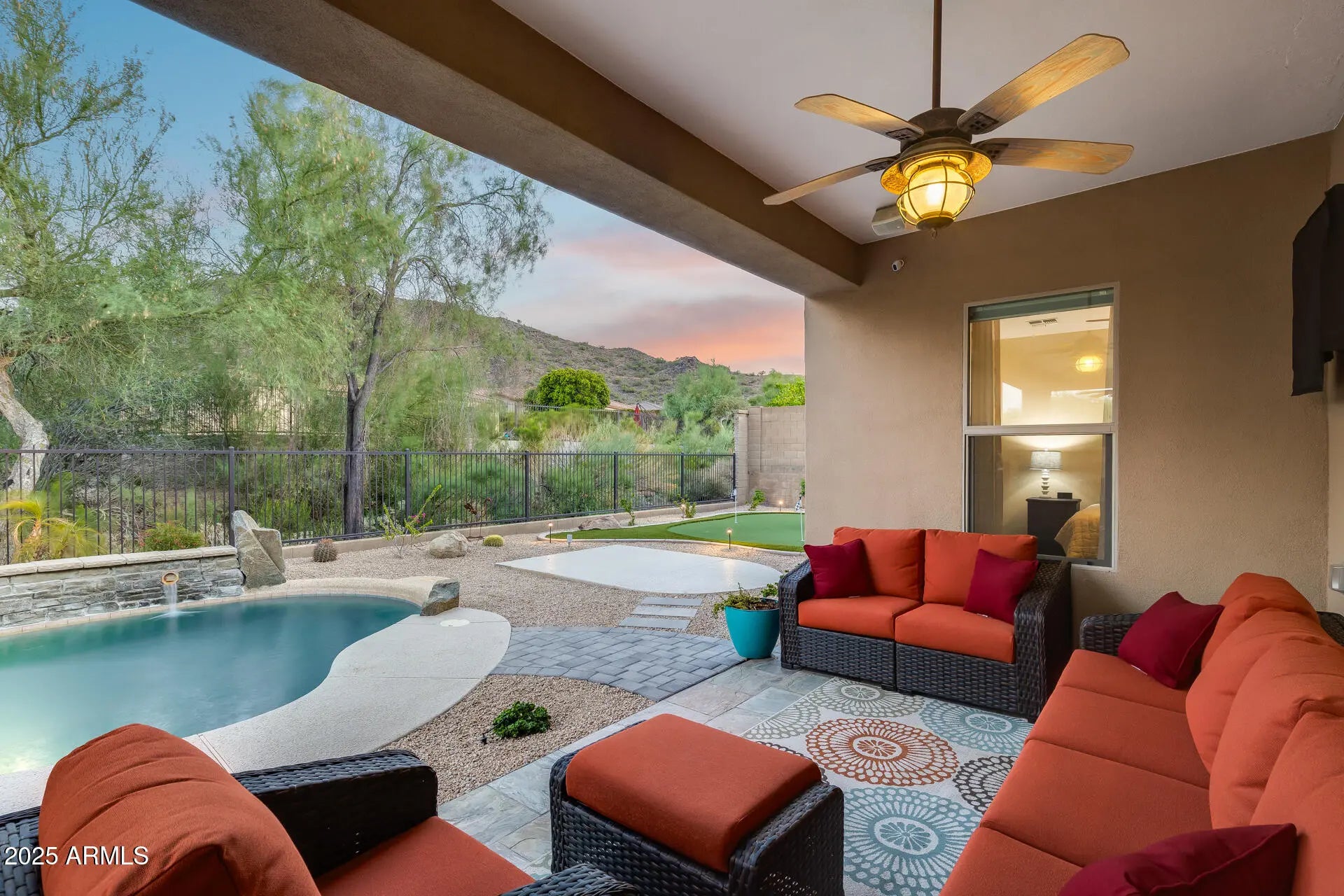 Owned Solar + Brand-New Trane A/C Units! Experience elevated desert living in this spacious and elegant 4 bed, 3 bath home, perfectly situated on a premium 10,625 sq ft cul-de-sac lot in the scenic hills of WestWing Mountain. With no neighbors behind and sweeping views of Sunrise Mountain, this property offers both privacy and beauty. Step inside to soaring 10-foot ceilings and a bright, open-concept floorplan designed for comfort and entertaining. The gourmet kitchen features granite counters, wall ovens, an island, and breakfast bar—plus room for formal dining. Retreat to the backyard oasis with a sparkling pool (new heater and cooler), custom putting green, extended patio wired for a smoker/grill, and professionally refreshed landscaping with boulders, evening lighting, and sunscreens on the south and west windows for year-round comfort. Located in the highly sought-after WestWing Mountain community, enjoy nearby hiking/biking trails, West Wing Park with pickleball and playgrounds, top-rated West Wing Elementary, Sunrise Mountain Library, Paloma Community Park, and quick access to Loop 303 and Lake Pleasant Pkwy. Plus, a local coffee shop is just a short stroll away!
