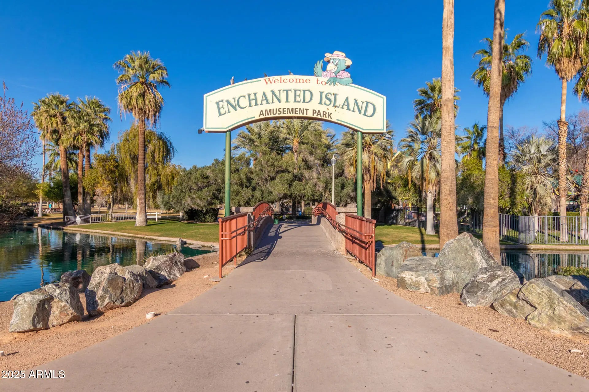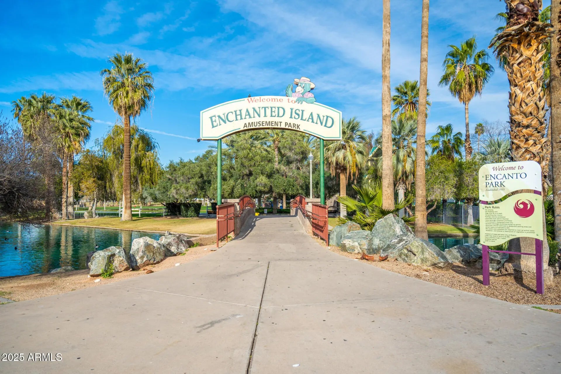 This charming 2 bedroom property is looking for its new owner! Be welcomed by a cozy front porch, ideal for having your morning coffee. Wood-look flooring, lovely arches & a comfortable living room await you inside. The eat-in kitchen showcases stylish cabinets w/crown mouldings, stainless steel appliances, & tile backsplash. The main bedroom boasts a walk-in closet, & direct access to the bathroom. Host fun gatherings in the sizable backyard complete with a relaxing covered patio, seating area, fire pit, & a grassy play area. Discover the beautiful lake views that the Encanto Park Community offers & make the most out of its sprawling green areas, lovely walking paths, & its own amusement park! Don't miss it!