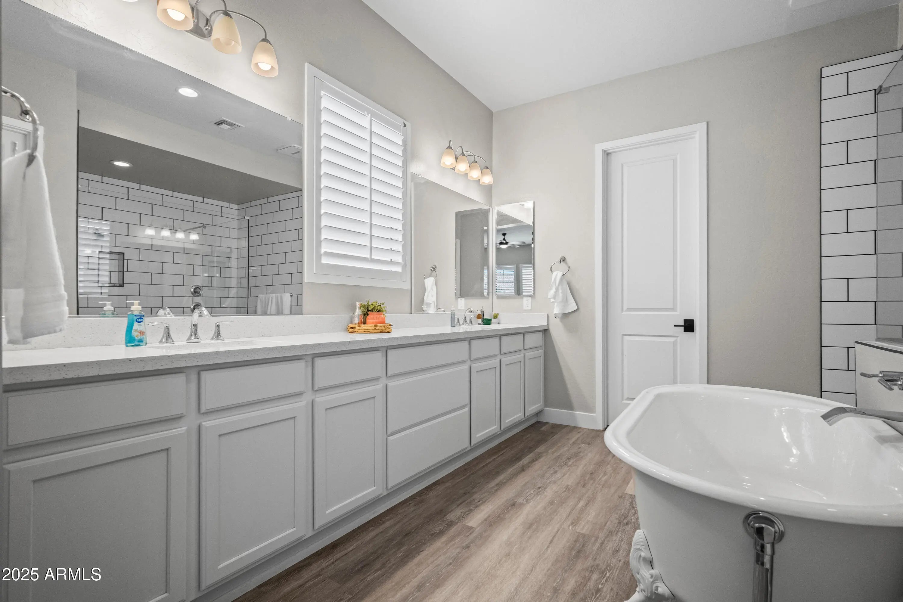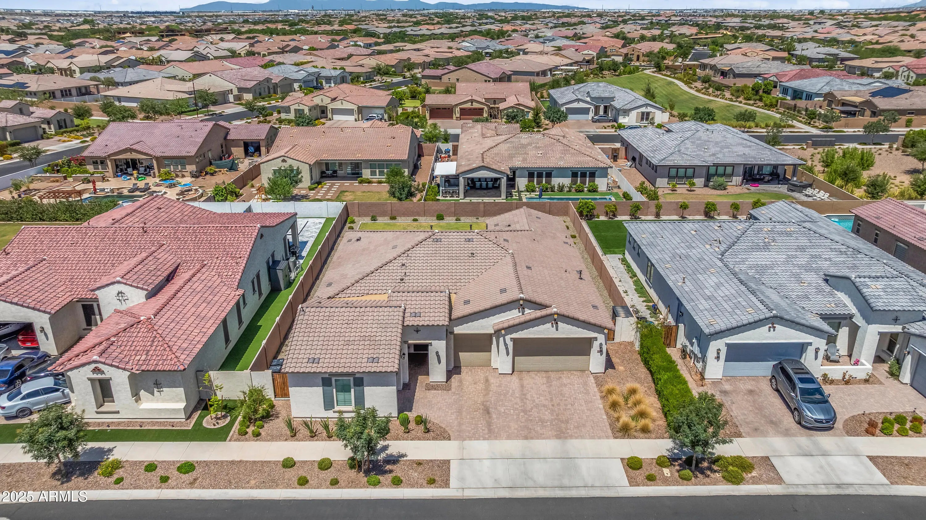 NEW PRICE! Don't miss this opportunity! Nestled in the prestigious Gated ESTATES at Eastmark, this exceptional home rests on a premium ¼-acre lot and delivers the perfect blend of luxury, comfort, and thoughtful design. From the moment you arrive, the true 4-car garage, soaring ceilings, and bright, open layout make a remarkable impression. Inside, designer finishes elevate every space — luxury vinyl plank flooring, quartz countertops, custom tile accents, wood shutters, stainless steel appliances, a sprawling T-shaped island, abundant cabinetry, and a spacious walk-in pantry and laundry room. The floor-plan also features a flexible fourth bedroom currently styled as a large den, offering the perfect option for an office, game room, or guest suite — add a door and closet for a full fourth bedroom, or enjoy the openness as-is. The private owner's suite offers a serene retreat with a spa-inspired bathroom, highlighted by a clawfoot soaking tub, oversized custom-tile shower, and dual vanities. Step outside to your own backyard sanctuary, complete with lush landscaping, a manicured lawn, and an expansive covered patio, an ideal setting for entertaining, relaxing, and savoring unforgettable Arizona sunsets. Plenty of room in the large backyard to build the pool of your dreams! Located in one of the East Valley's most sought-after gated communities, residents enjoy resort-style amenities, scenic walking paths, and proximity to top-rated schools, dining, and shopping. Luxury, space, and lifestyle, now offered at an exceptional NEW PRICE.