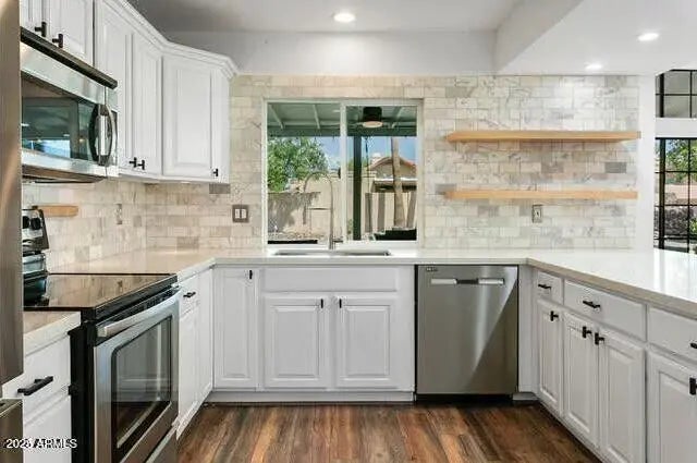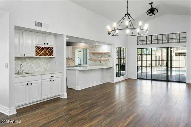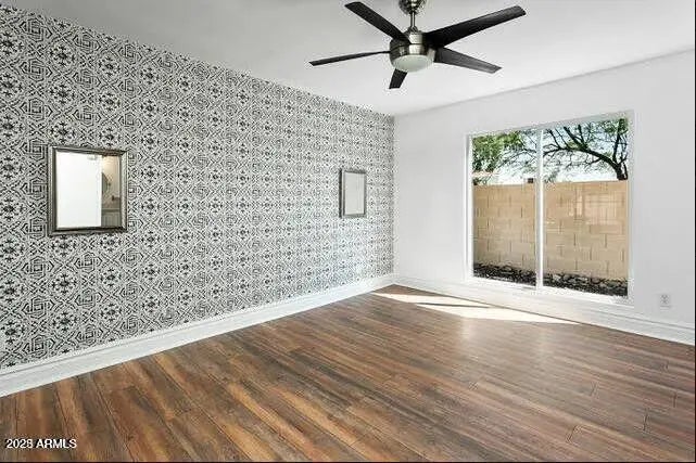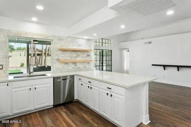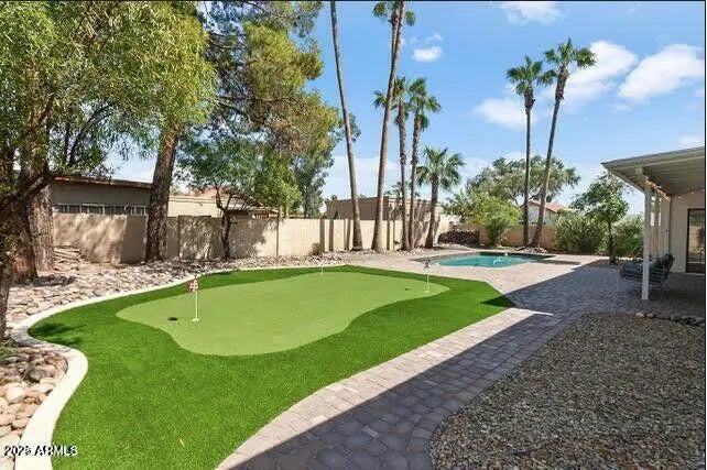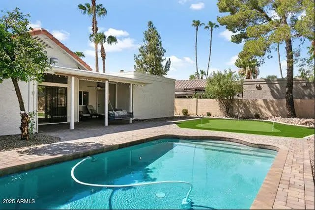 This NO HOA artistic home features 3 bed 2 bathrooms. Open-concept living area with vaulted ceilings & oscillating ceiling fans. Full wet bar which is perfect for entertaining your guests. New upgrades include: barn-wood laminate flooring, quartz countertops, kitchen tile backsplash, exterior/interior paint and brand-new baseboards. Walk-in laundry with pantry shelving (washer and dryer included). A charming master suite with it's own entrance to the backyard oasis, also has an expansive walk-in closet, & a a modern style bathroom with a private entrance/exit door to the exterior side courtyard. Backyard is massive with custom pavers & accompanied by a brand-new astroturf putting green. New AC unit in 2023 and newly surfaced pebble-etc pool in 2024. Newer home security system I'm 2023.
