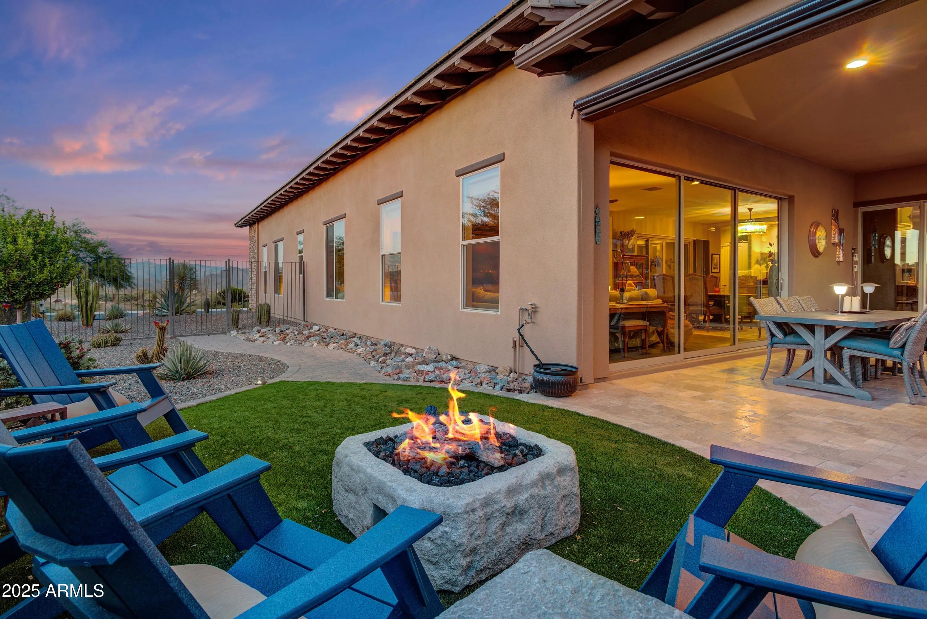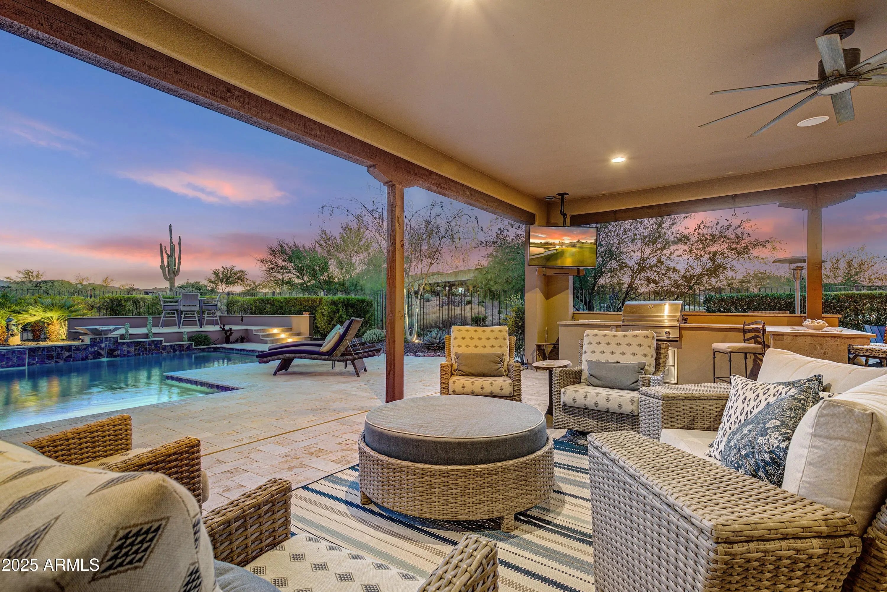 CORNER GOLF COURSE HOMESITE & BREATHTAKING MOUNTAIN & SUNSET VIEWS! Experience Luxury Living in this beautiful Residence located in the coveted Trilogy at Verde River. This unique Vela floorplan offers 3 bedrooms, 3.5 bathrooms, an office, and a 4-car garage. This stunning home is perched on the oversized 14,695 Sq. Ft. very Private Corner Homesite and is designed to capture UNPARALLELED GOLF COURSE & MOUNTAIN VIEWS and dramatic EVER-CHANGING ARIZONA SUNSETS from both the front and back patios. Front Courtyard leads you into an open floor plan with an alluring great room, striking kitchen, and open dining room. Gourmet GE Monogram Appliances, large granite center island, custom lighting and stunning cabinetry in the kitchen offer a rich and upgraded look. Exuding warmth and sophistication this home is designed to feature distinctive elements such as large Den with custom built in cabinets, upgraded flooring throughout, custom window treatments, both Water Softener and Reverse Osmosis and so much more. The expansive primary bedroom and bathroom offer a luxurious retreat, complete with a tub, shower, and dual vanity. Both guest rooms come with their own en suite bath, ensuring comfort and privacy. The entire Great Room area of the home features sliding Wall of Glass and opens for an optimal indoor/outdoor experience. Spacious outdoor living has an extended covered patio with POOL & SPA , travertine tile and a custom landscaping. The covered patio features an outdoor kitchen with built-in BBQ & TV creating the perfect outdoor retreat. Did I mention THE PRIVACY & THE VIEW? IT'S MAGNIFICENT!! Resort Lifestyle and a home to be treasured and appreciated! Trilogy at Verde River offers upscale Resort living at its finest and the very best of all possible worlds, close to the conveniences of affluent North Scottsdale yet secreted within the pristine privacy of the Sonoran Desert. The amenities are World Class with Tom Lehman inspired eighteen-hole Golf course, tennis courts, pickle ball courts, and bocce ball, heated lap pool and Resort style swimming pool, hot tub, Afterburn fitness center, Helen's demonstration Kitchen for cooking classes and a 7.5 acre dog park. The community center has casual poolside dining at Eddy's Diner and gourmet dining at award-winning Needle Rock Kitchen and Tap, Alvea Spa with full-service Salon and Spa amenities, Art Loft and events center. Trilogy at Verde River is adjacent to the Tonto National Forest and is situated in the middle of miles and miles of hiking and biking trails. Whether you're seeking a second, winter home, or will live here year-round, Trilogy at Verde River is an ideal distance from the hustle and bustle of North Scottsdale. You'll love the Resort living! What memories will you make?
