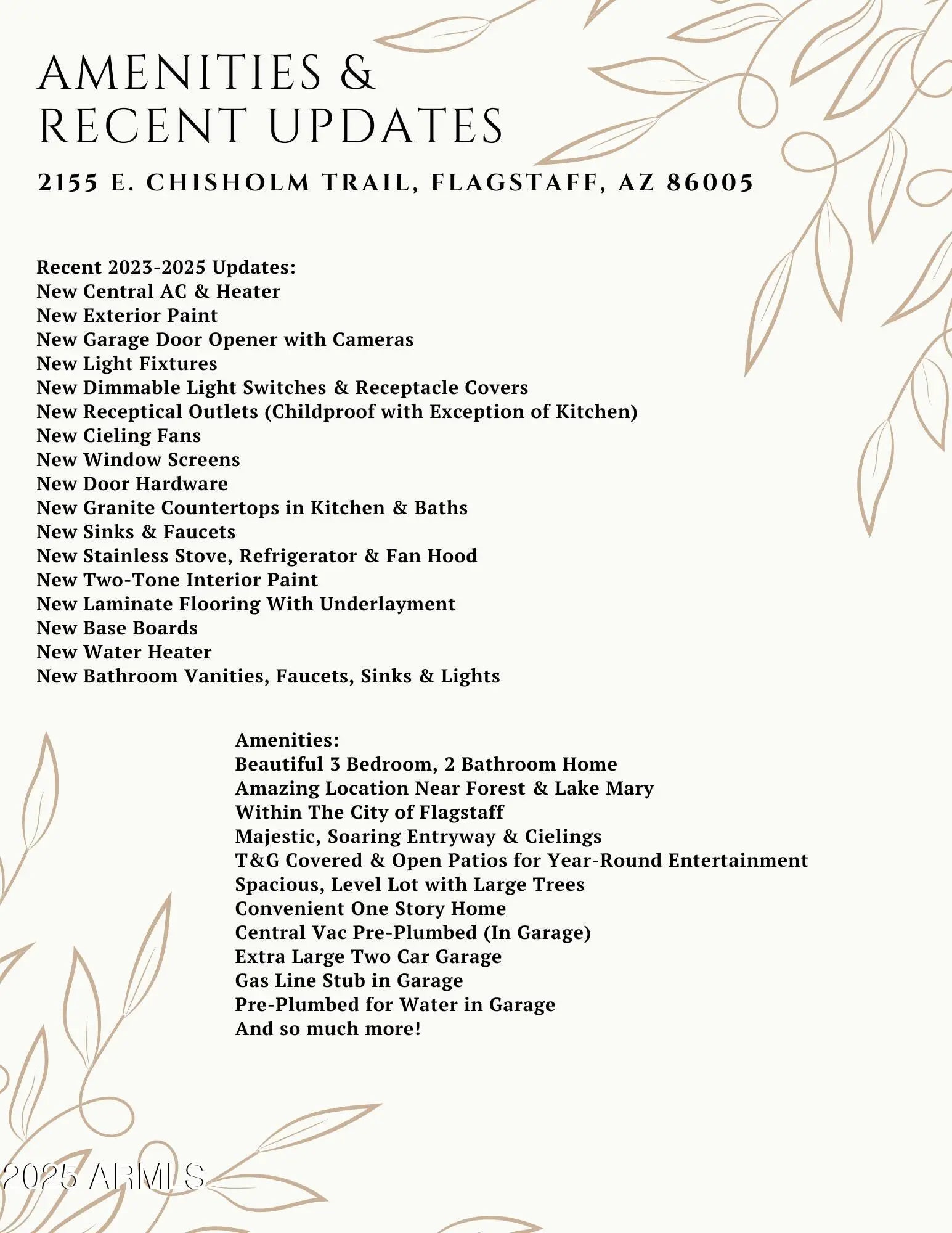 Welcome to style & comfort in this beautifully updated, one story Flagstaff home! From the moment you enter the soaring grand entry, you'll be greeted by vaulted ceilings and a stunning floor plan that feels both spacious & inviting. Enjoy peace of mind with new A/C & heat, plus new light fixtures, vanities & appliances. Fresh paint & flooring add a polished, move-in ready feel. The kitchen shines with new granite countertops & sleek, modern upgrades - perfect for cooking & then entertaining under the T&G covered patio in the large, fenced yard with apple trees. Located near Lake Mary & the National Forest! Whether you're looking for a permanent residence or a stylish mountain getaway, this home checks all the boxes. Don't miss this rare Flagstaff gem! The 3rd bedroom is currently a den, there is an additional room that might be able to be a 4th bedroom. The oversized garage has been pre-plumbed for central vac, has gas and water available as well as offers new garage door openers. The generously sized, corner lot is partially fenced and treed. This home offers something for everyone! See photos for a list of some of the many recent updates and amenities this stunning home offers.