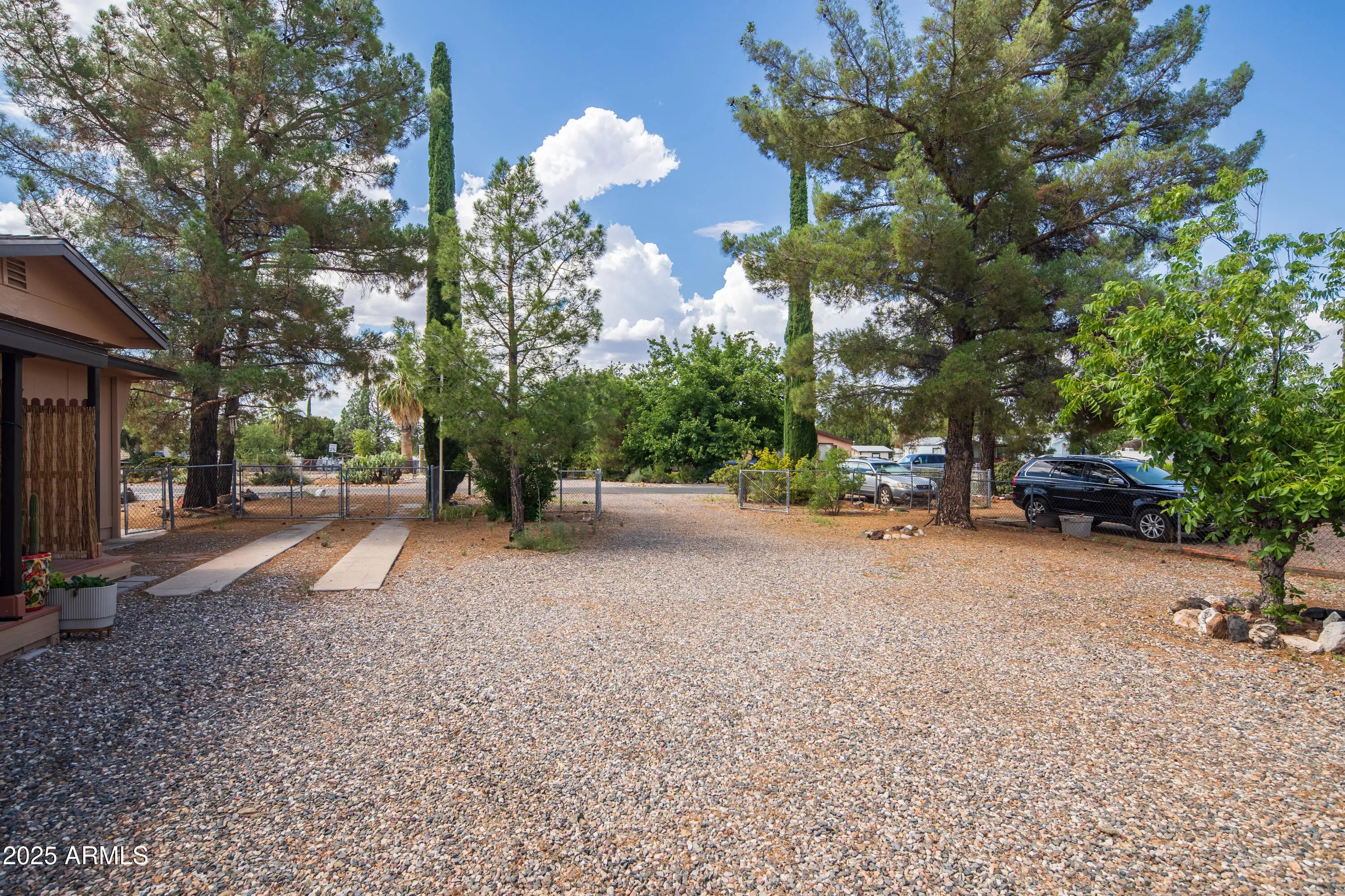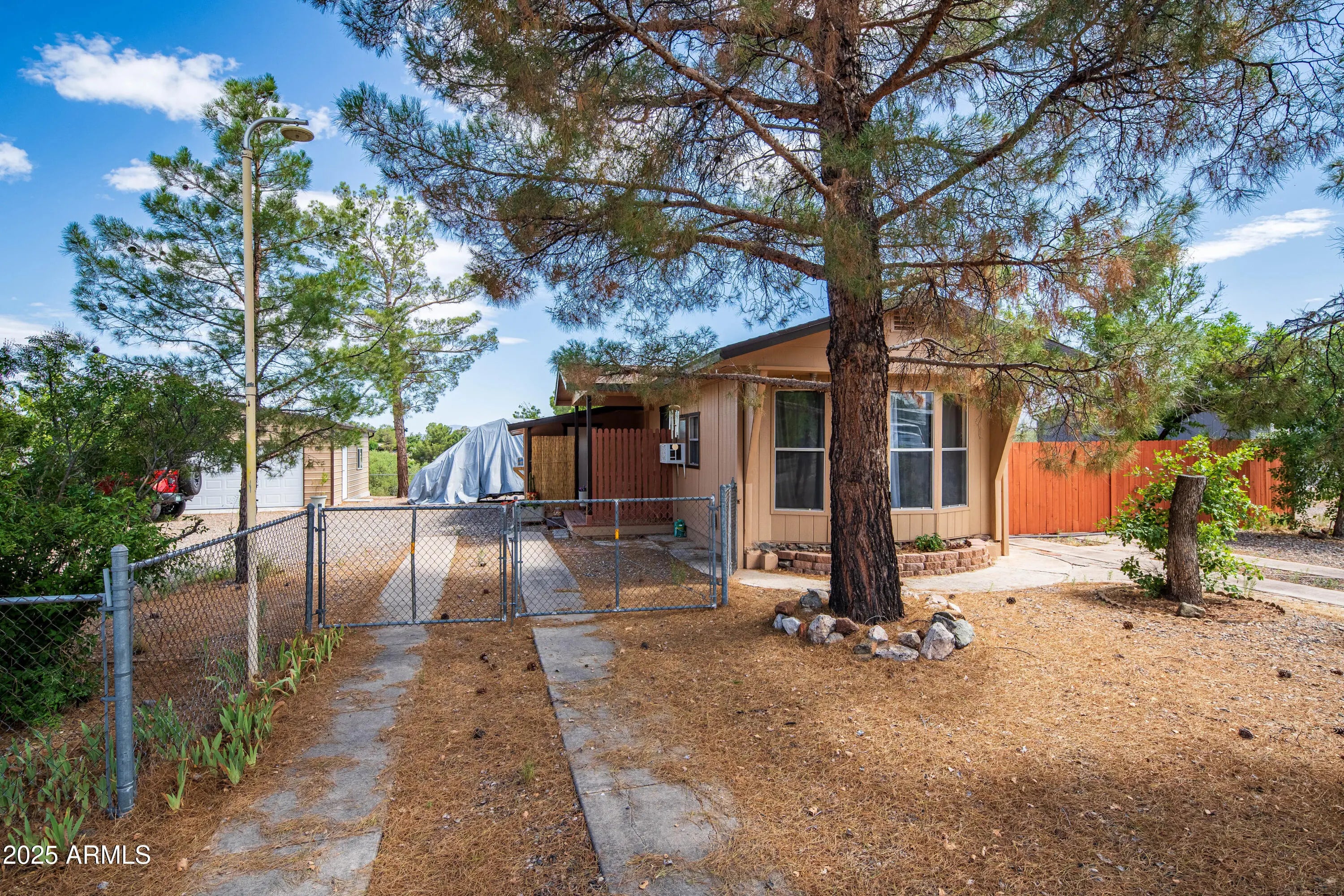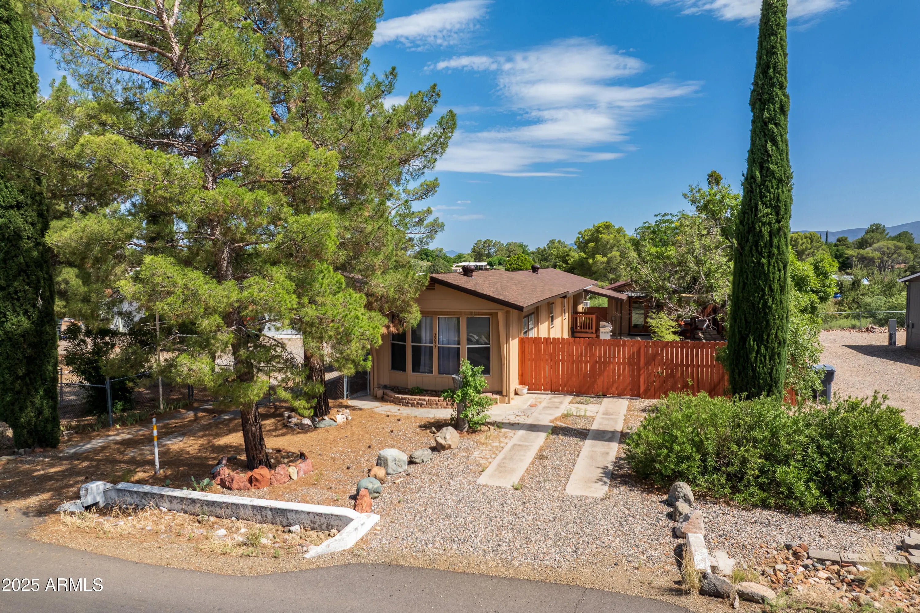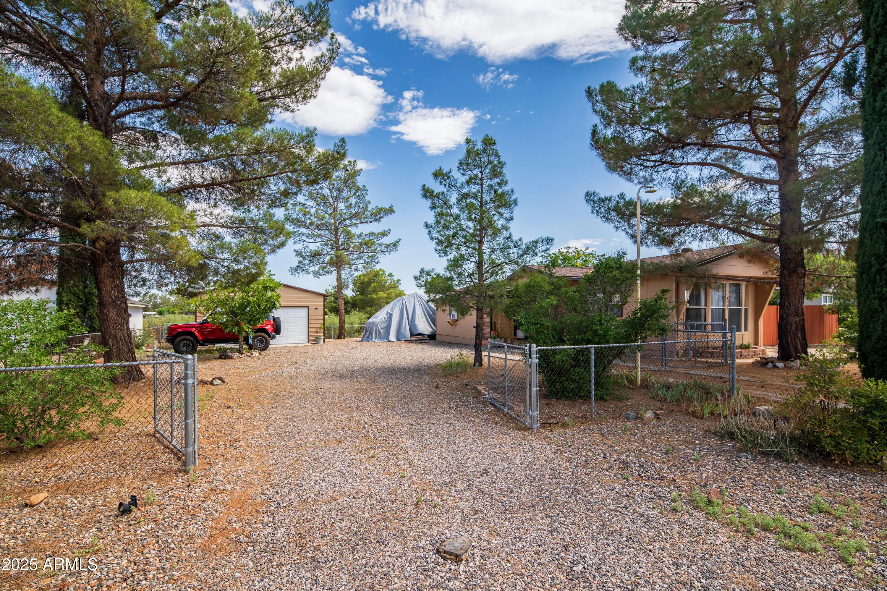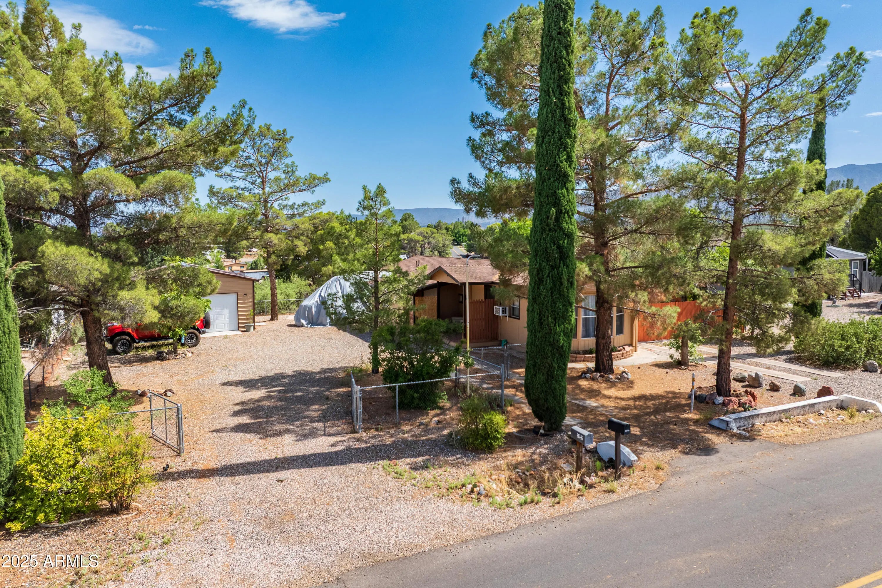 Step into this light and bright 2-bedroom, 2-bath manufactured home that has been delightfully decorated farmhouse/mid century. Lightly lived in part time by current owners. Features modern stainless steel appliances, detached newer 2-car garage for sprinter van or RV, new roof one year ago, new whole home replumbed around that time to PEX, fully fenced perimeter and side yard dog run w/artificial lawn and desert flora and budding roses. Setting this home apart is abundant interior fenced parking, RV parking, two areas for pull-in shaded off-street parking and beautiful trees! Previously owned by a local handyman and his wife-meticulous attention to detail. She Shed or Workshop with pretty wooden French doors. Must see in person to appreciate!