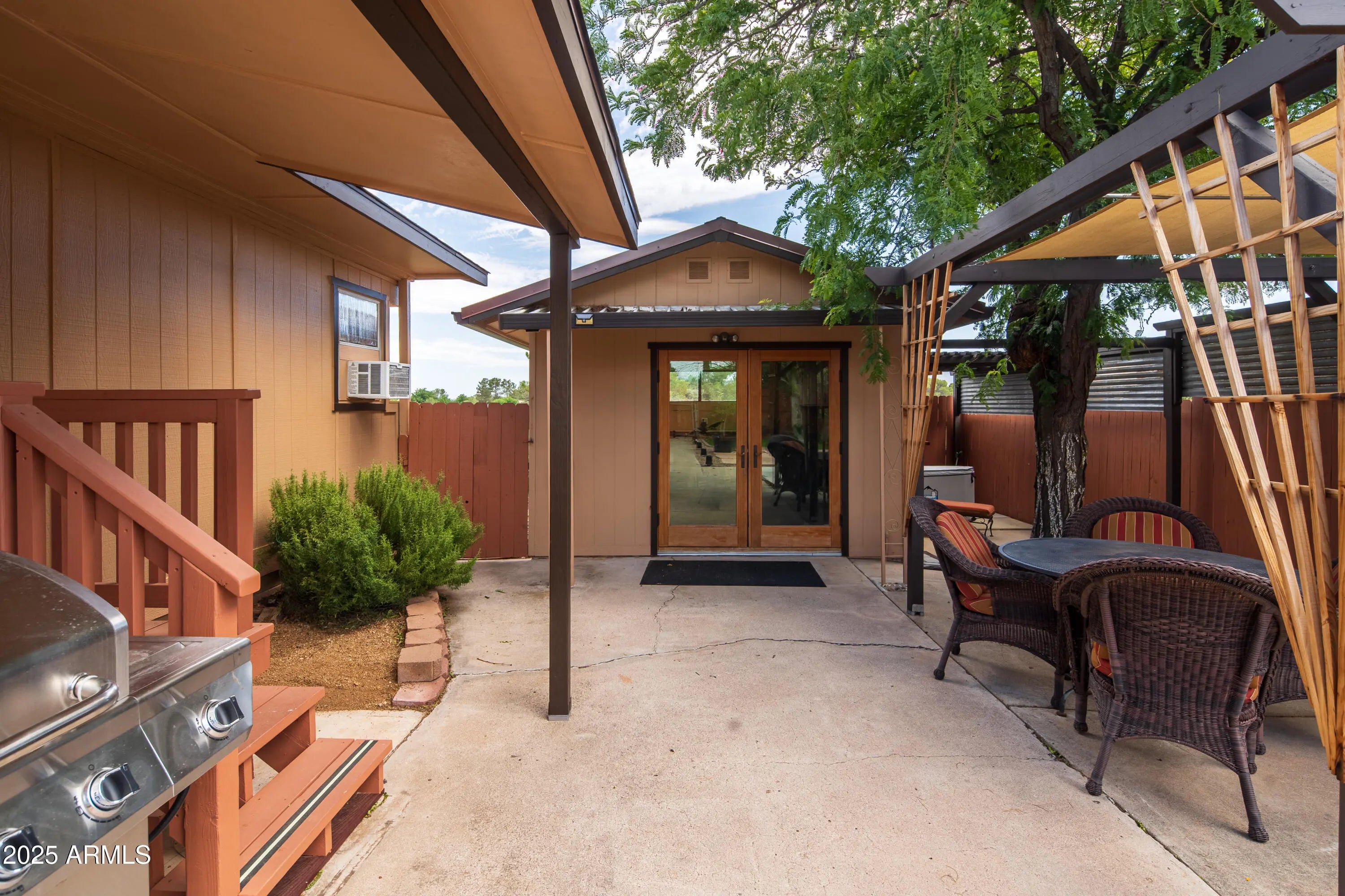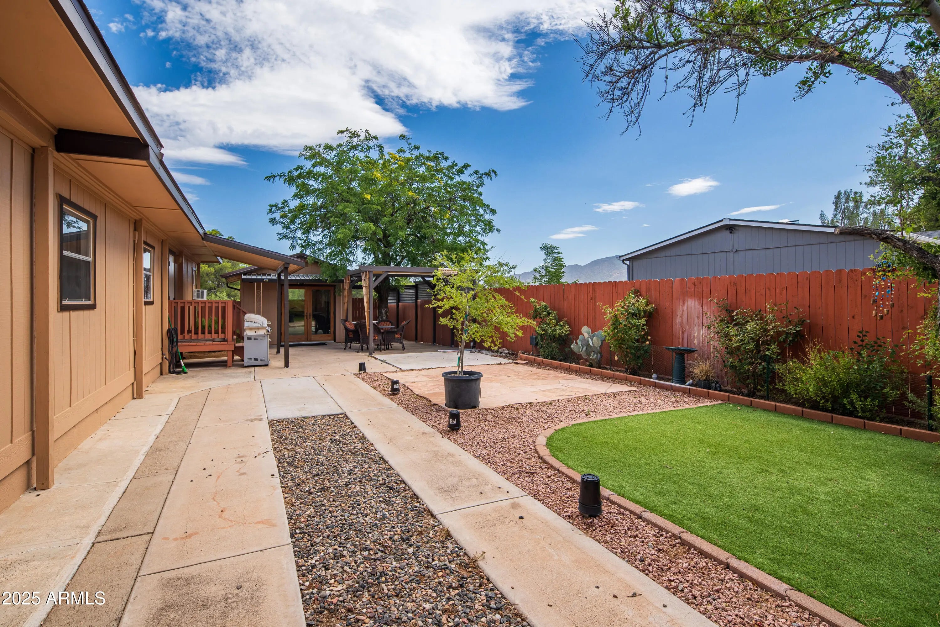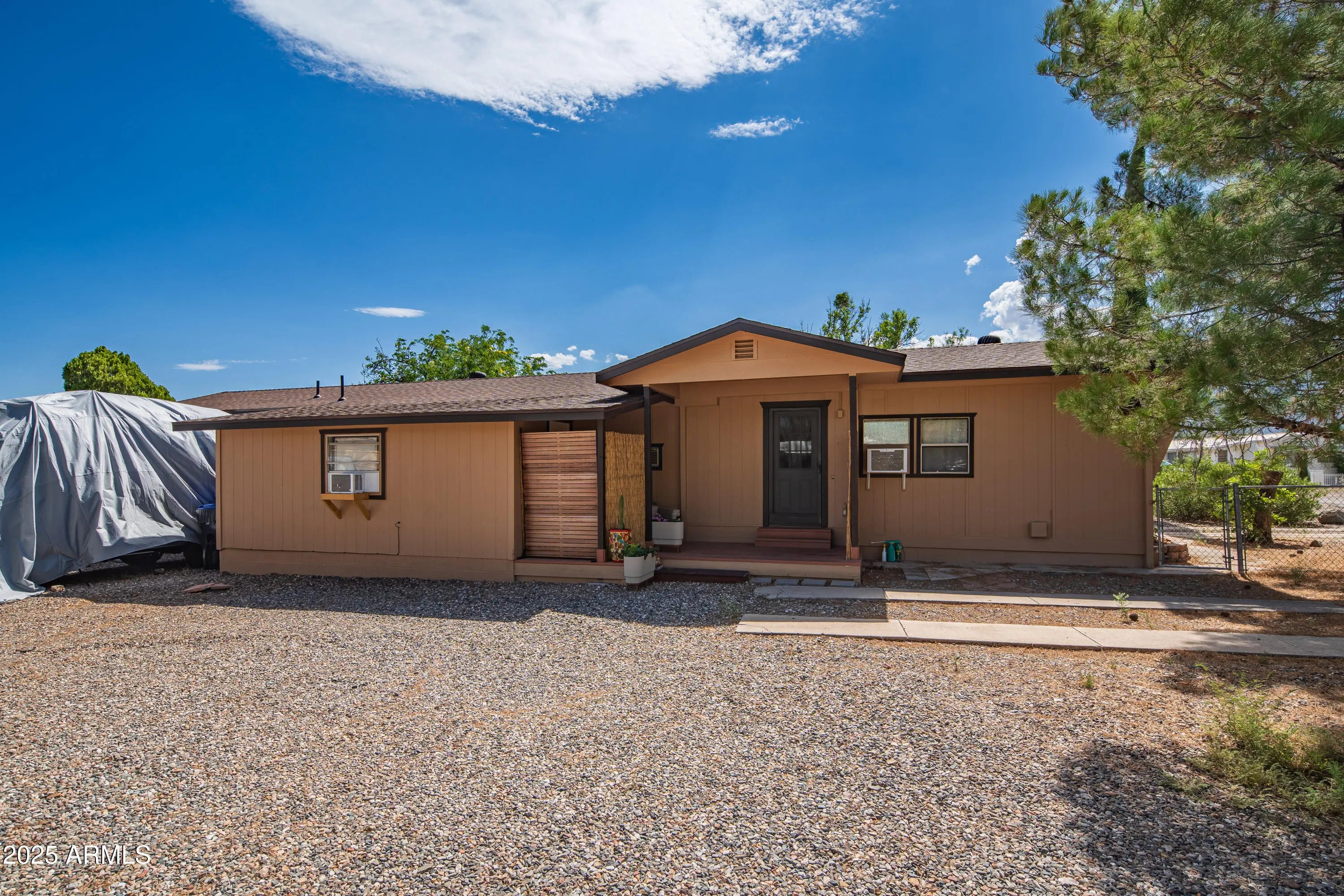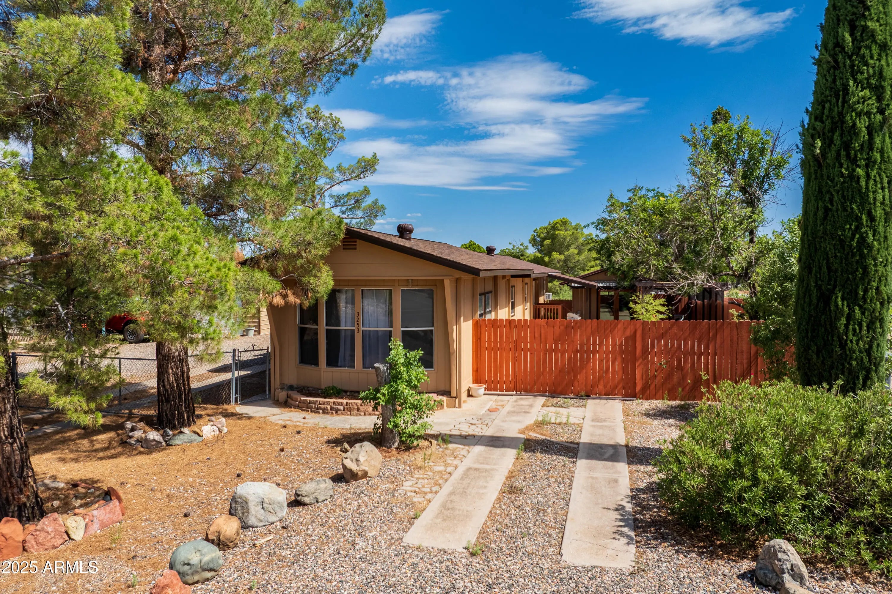 Step into this light and bright 2-bedroom, 2-bath manufactured home that has been delightfully decorated farmhouse/mid century. Lightly lived in part time by current owners. Features modern stainless steel appliances, detached newer 2-car garage for sprinter van or RV, new roof one year ago, new whole home replumbed around that time to PEX, fully fenced perimeter and side yard dog run w/artificial lawn and desert flora and budding roses. Setting this home apart is abundant interior fenced parking, RV parking, two areas for pull-in shaded off-street parking and beautiful trees! Previously owned by a local handyman and his wife-meticulous attention to detail. She Shed or Workshop with pretty wooden French doors. Must see in person to appreciate!