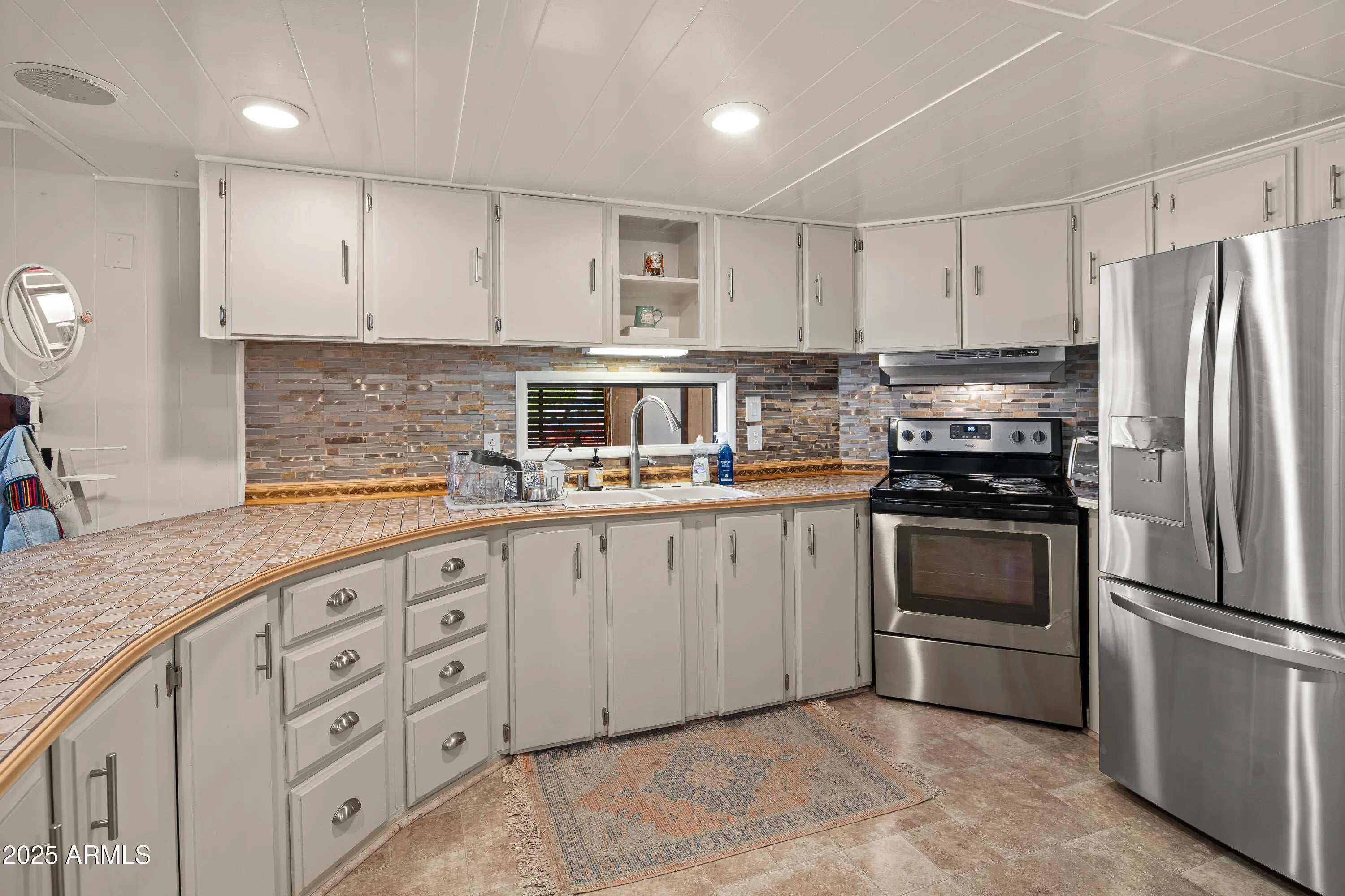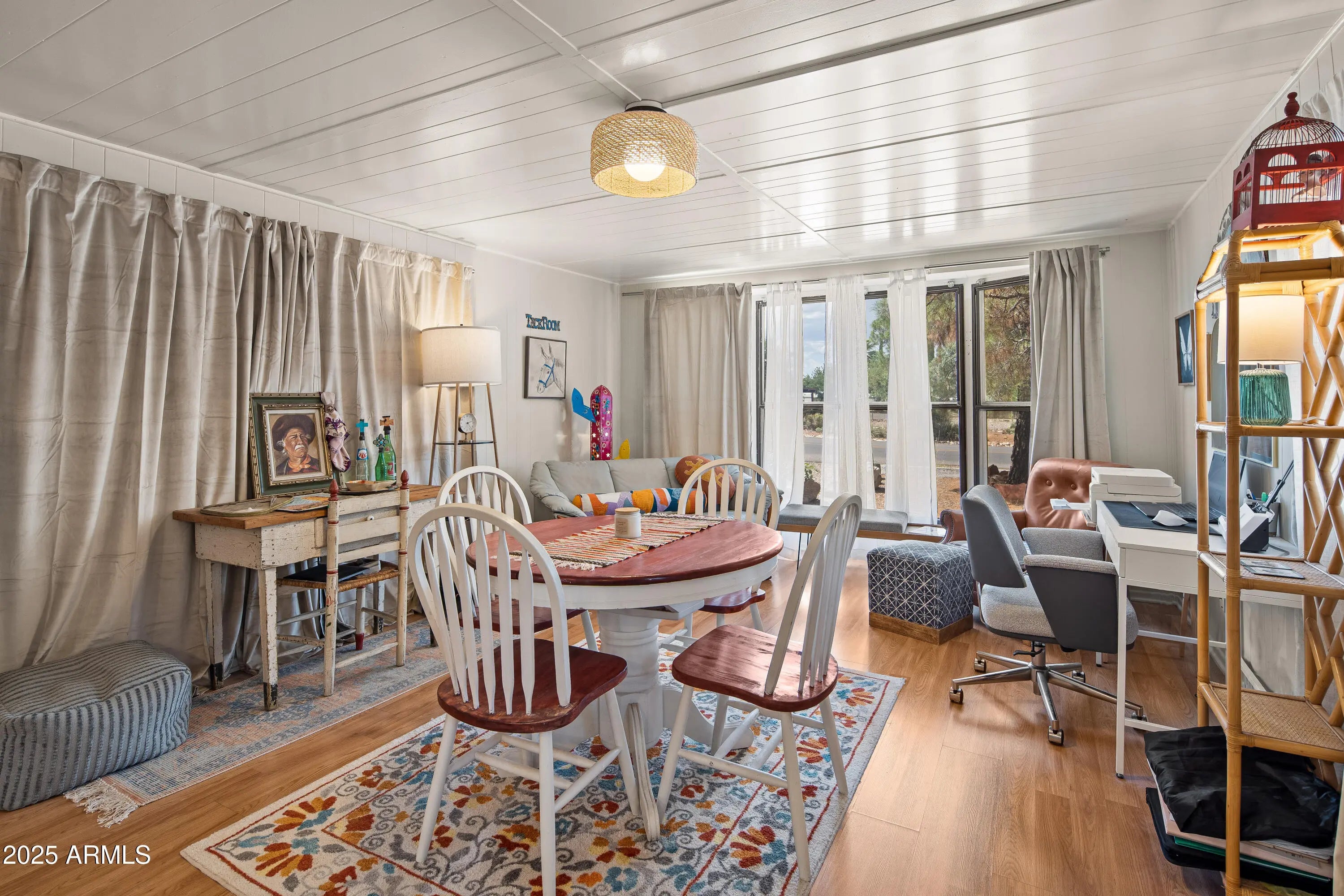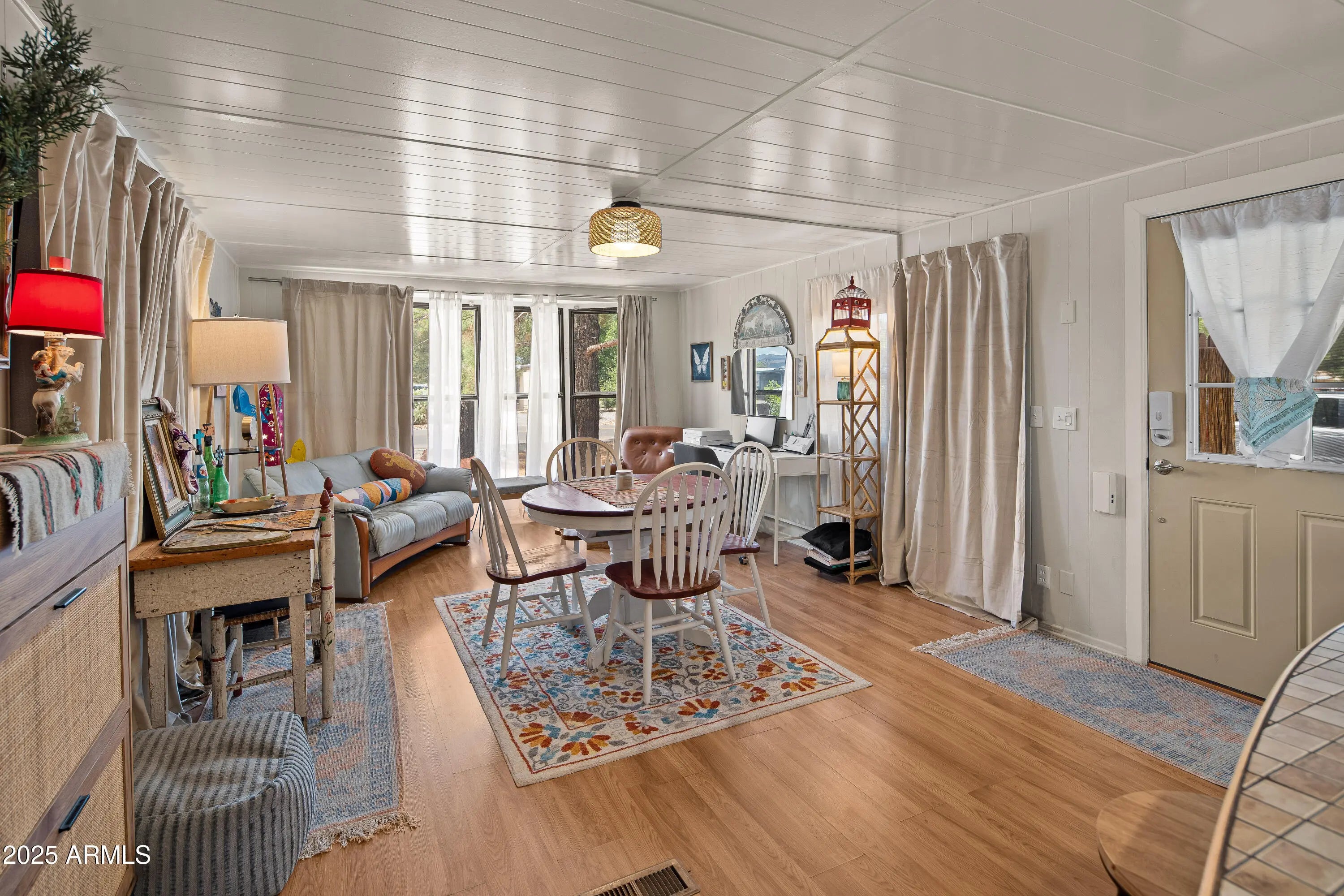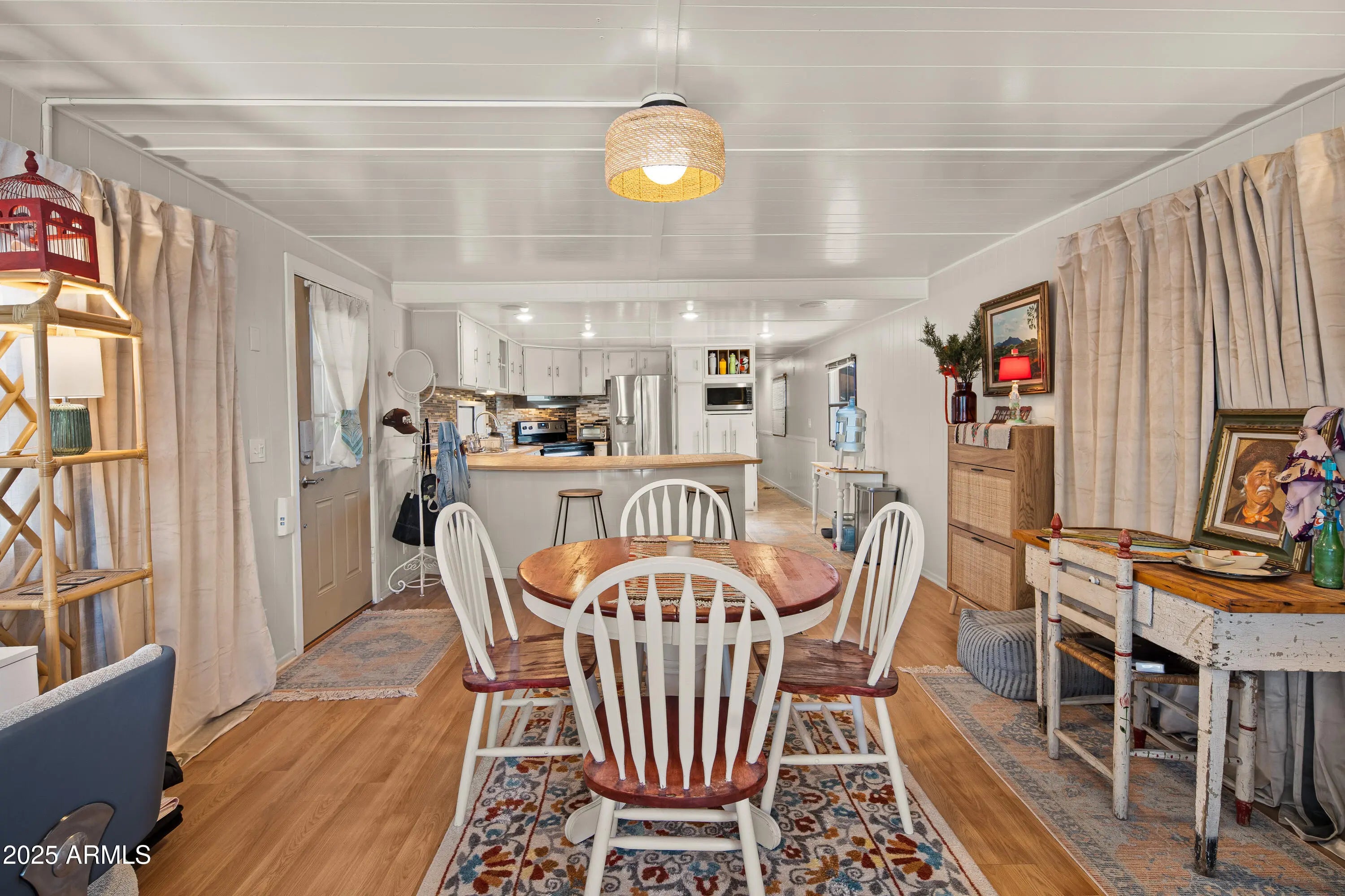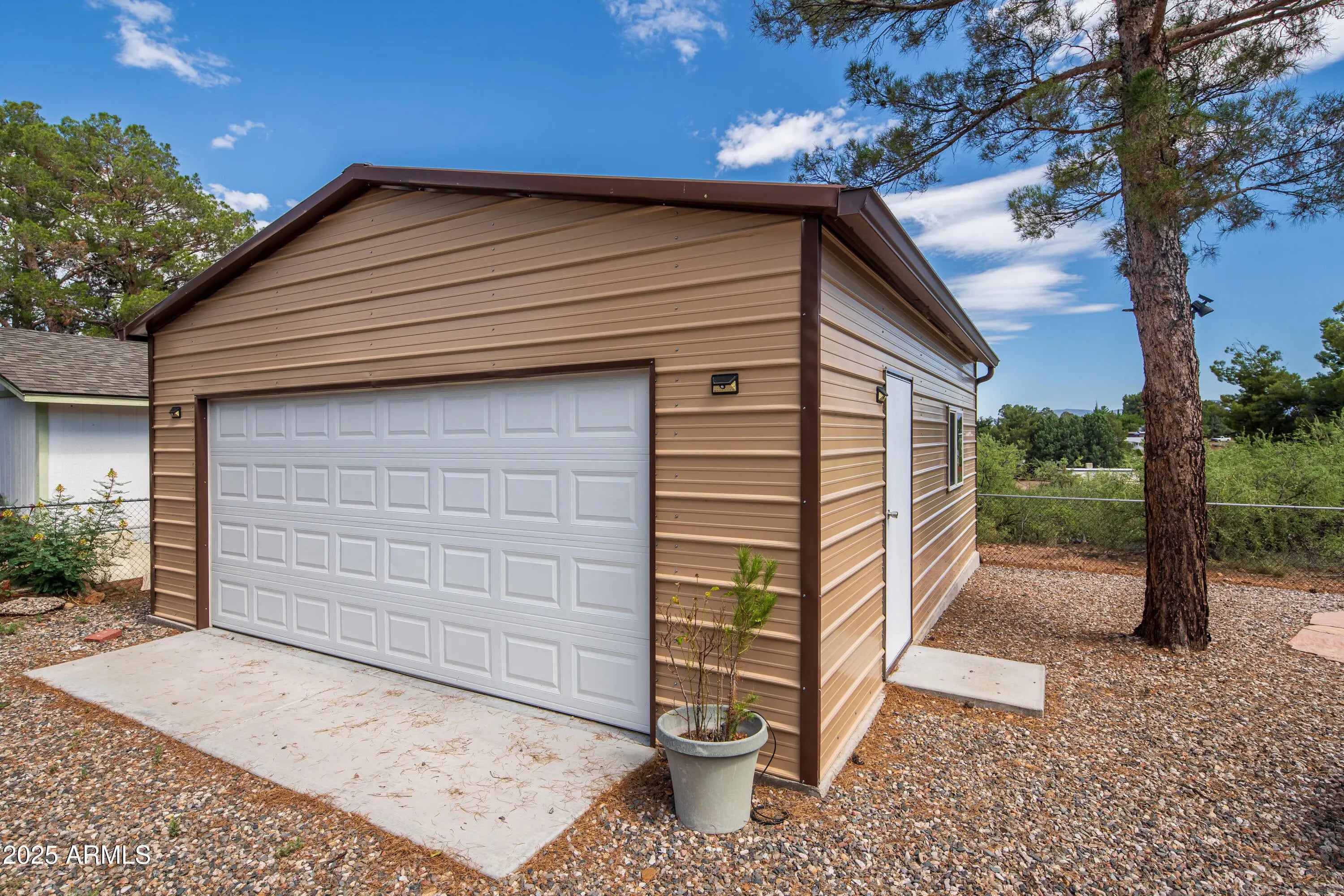Step into this light and bright 2-bedroom, 2-bath manufactured home that has been delightfully decorated farmhouse/mid century. Lightly lived in part time by current owners. Features modern stainless steel appliances, detached newer 2-car garage for sprinter van or RV, new roof one year ago, new whole home replumbed around that time to PEX, fully fenced perimeter and side yard dog run w/artificial lawn and desert flora and budding roses. Setting this home apart is abundant interior fenced parking, RV parking, two areas for pull-in shaded off-street parking and beautiful trees! Previously owned by a local handyman and his wife-meticulous attention to detail. She Shed or Workshop with pretty wooden French doors. Must see in person to appreciate!