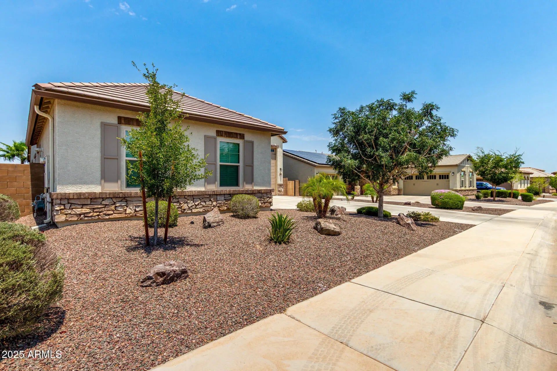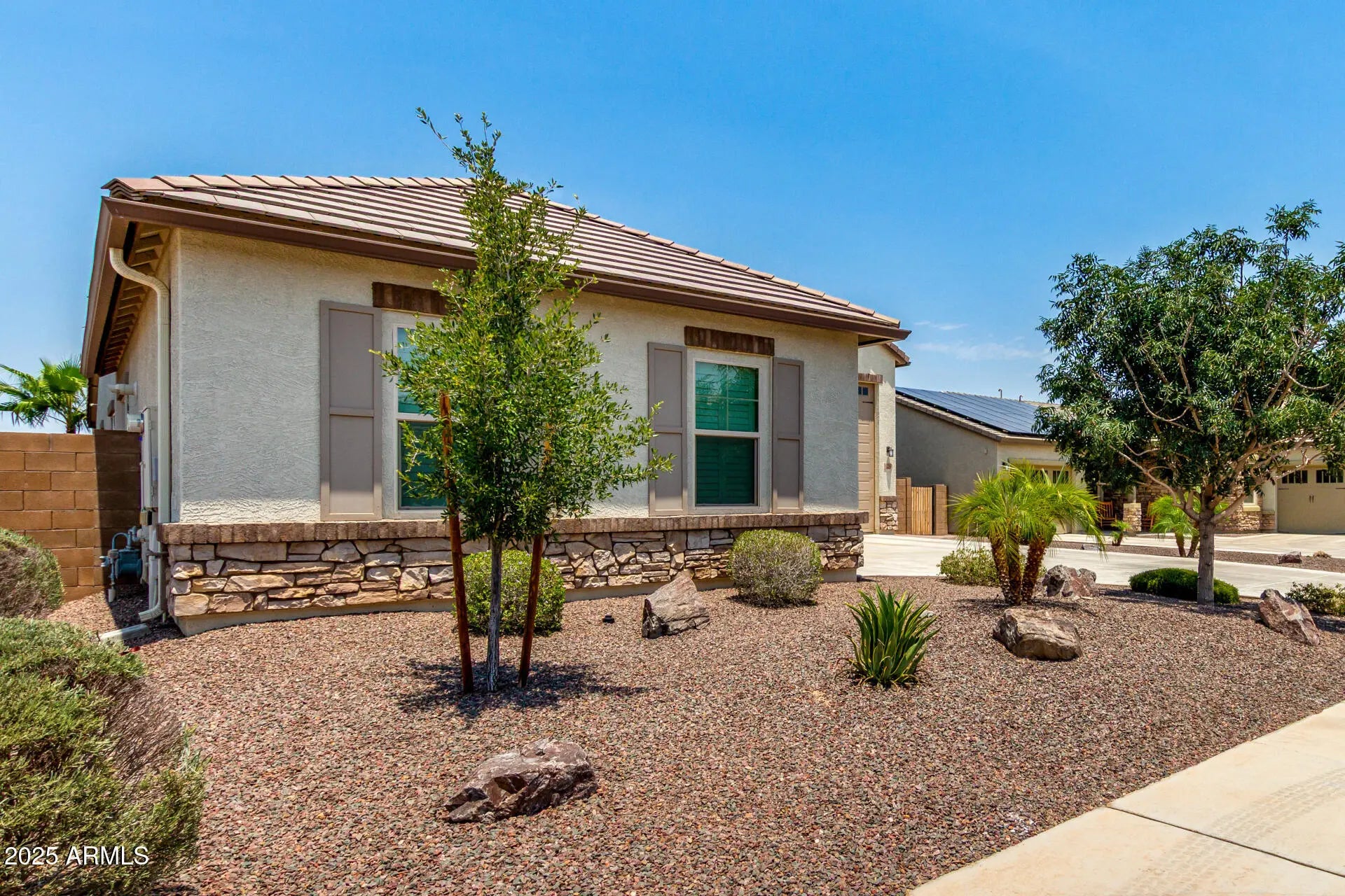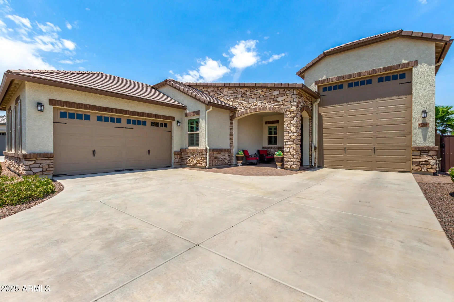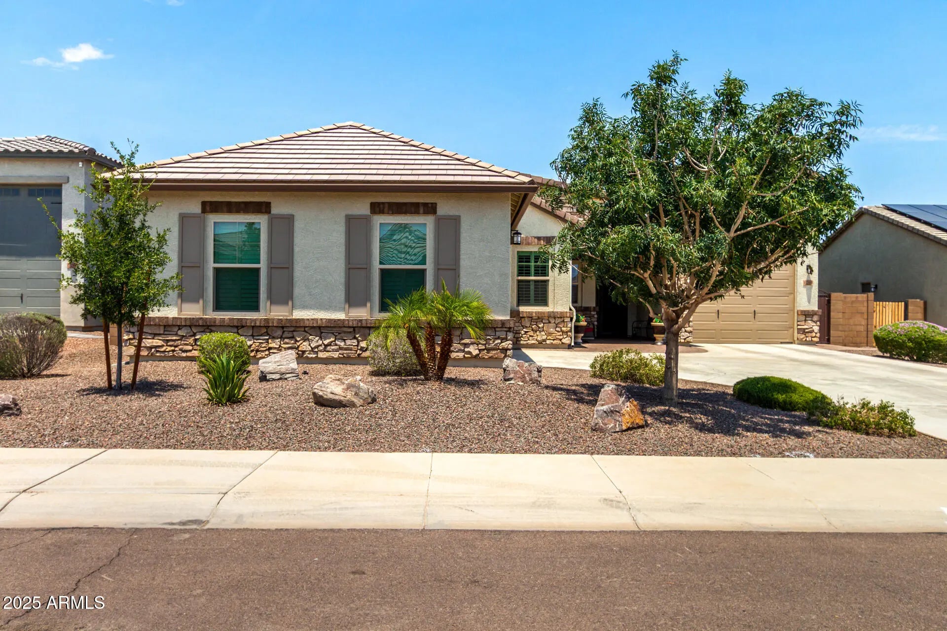 RV GARAGE! This gorgeous 3-bedroom residence boasts a 2-car garage + RV garage, a delightful stone facade, and a front patio that sets an inviting atmosphere. Discover a beautiful open layout with high ceilings, recessed lighting, plantation shutters, and stylish wood-look flooring. The stunning kitchen comes with granite counters, ample wood cabinetry with crown moulding, a tile backsplash, SS appliances, a walk-in pantry, and an island with a breakfast bar. The primary suite features soft carpeting, an en-suite bathroom with double vanities, and a convenient walk-in closet. The charming backyard is a true highlight, boasting a covered patio for dining al fresco, stylish pavers, and pristine artificial turf for low-maintenance greenery. Make this gem yours now!
