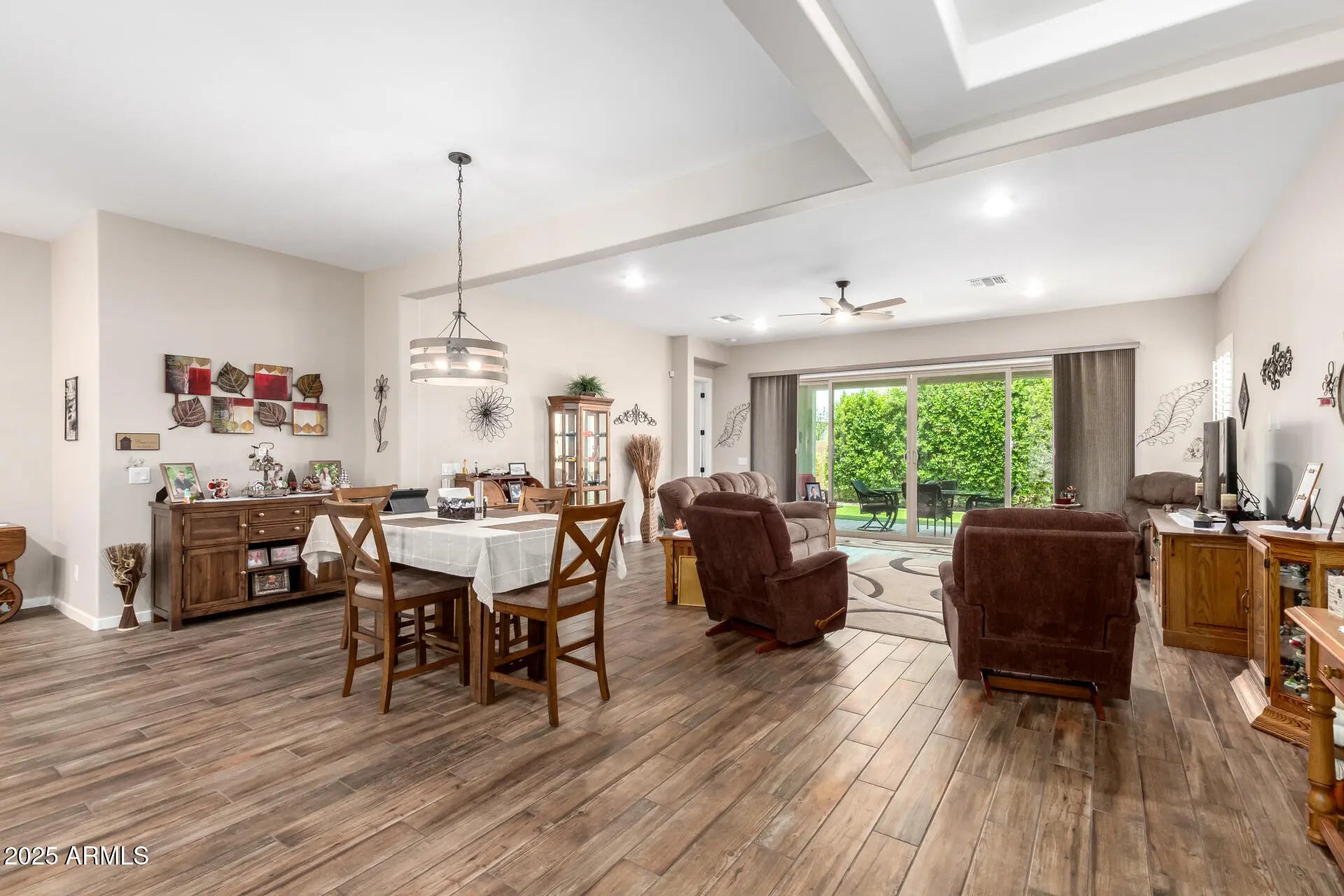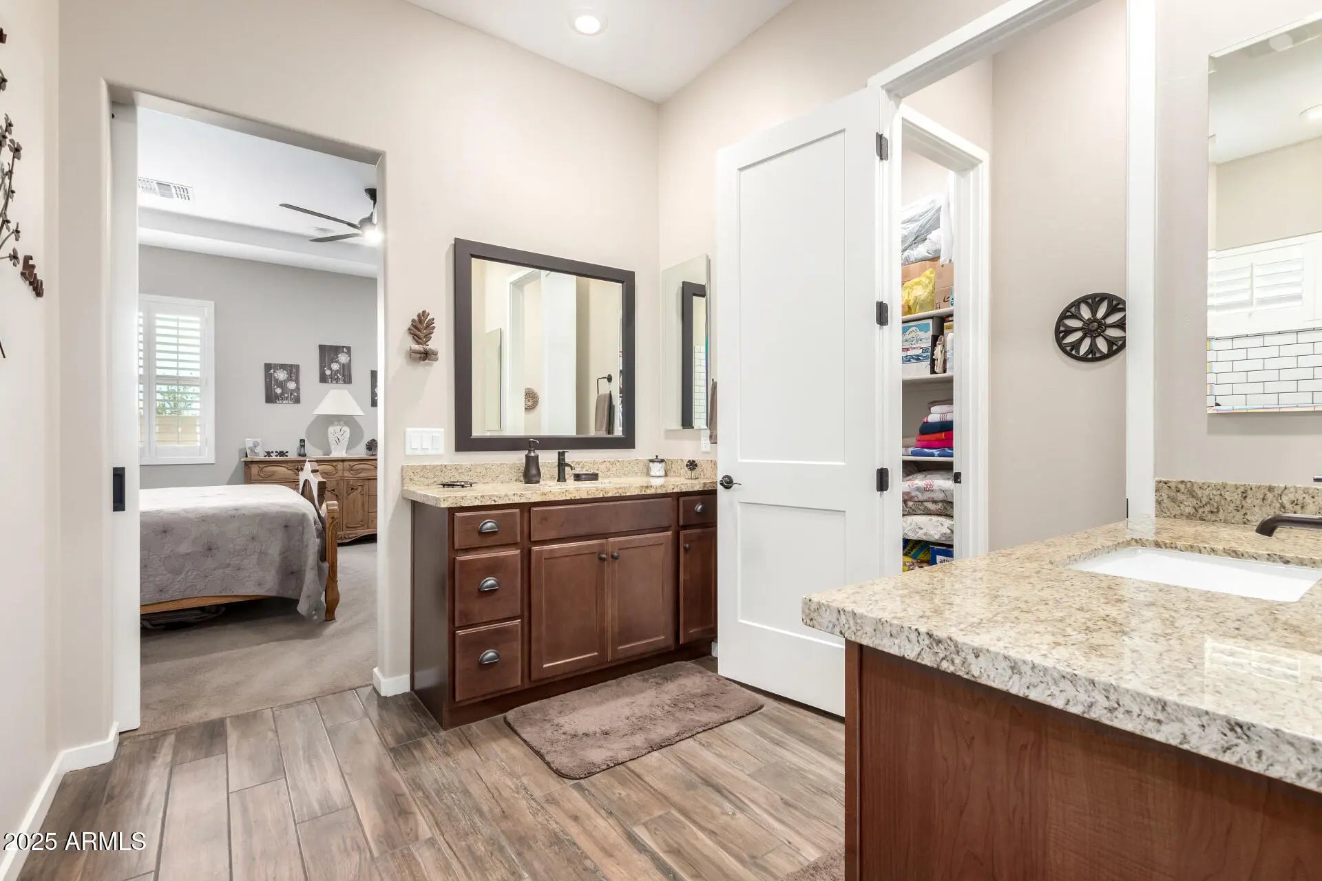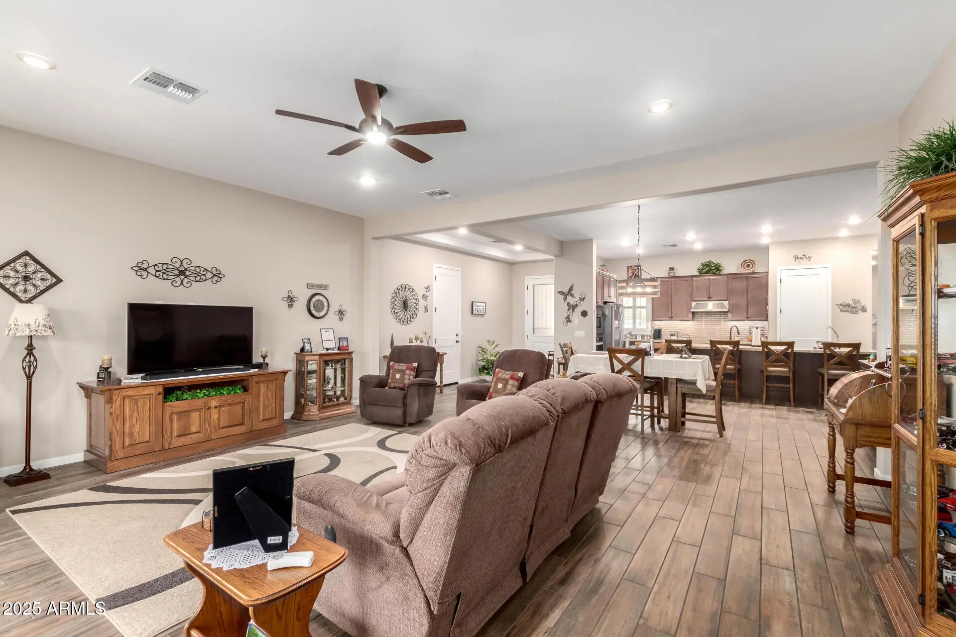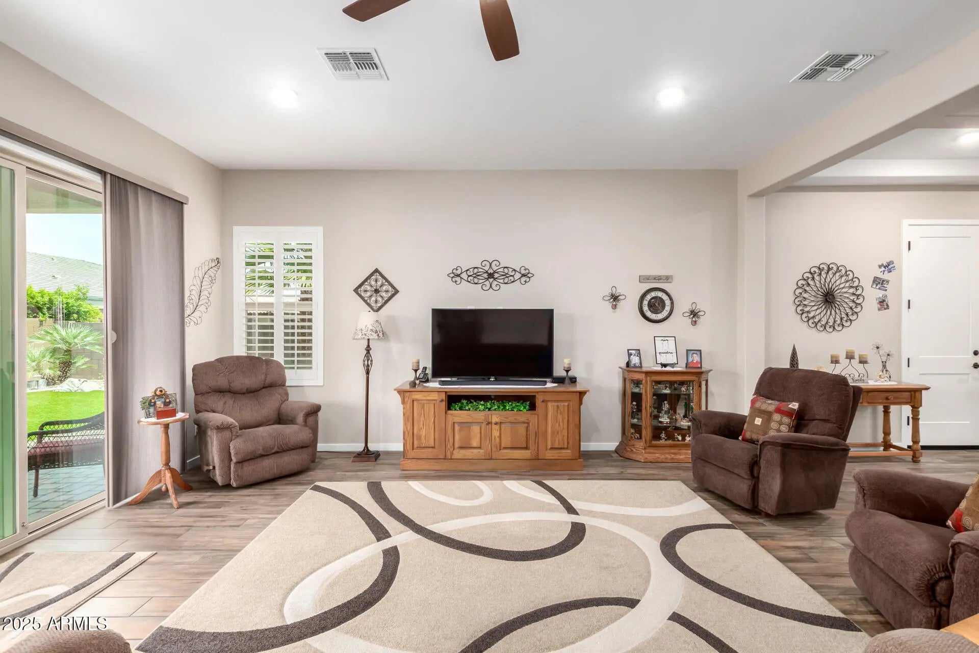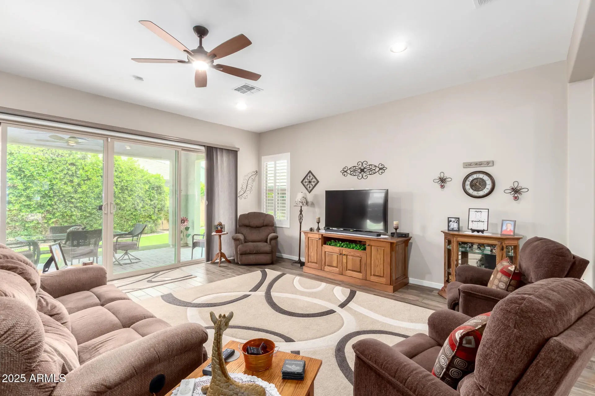 RV GARAGE! This gorgeous 3-bedroom residence boasts a 2-car garage + RV garage, a delightful stone facade, and a front patio that sets an inviting atmosphere. Discover a beautiful open layout with high ceilings, recessed lighting, plantation shutters, and stylish wood-look flooring. The stunning kitchen comes with granite counters, ample wood cabinetry with crown moulding, a tile backsplash, SS appliances, a walk-in pantry, and an island with a breakfast bar. The primary suite features soft carpeting, an en-suite bathroom with double vanities, and a convenient walk-in closet. The charming backyard is a true highlight, boasting a covered patio for dining al fresco, stylish pavers, and pristine artificial turf for low-maintenance greenery. Make this gem yours now!